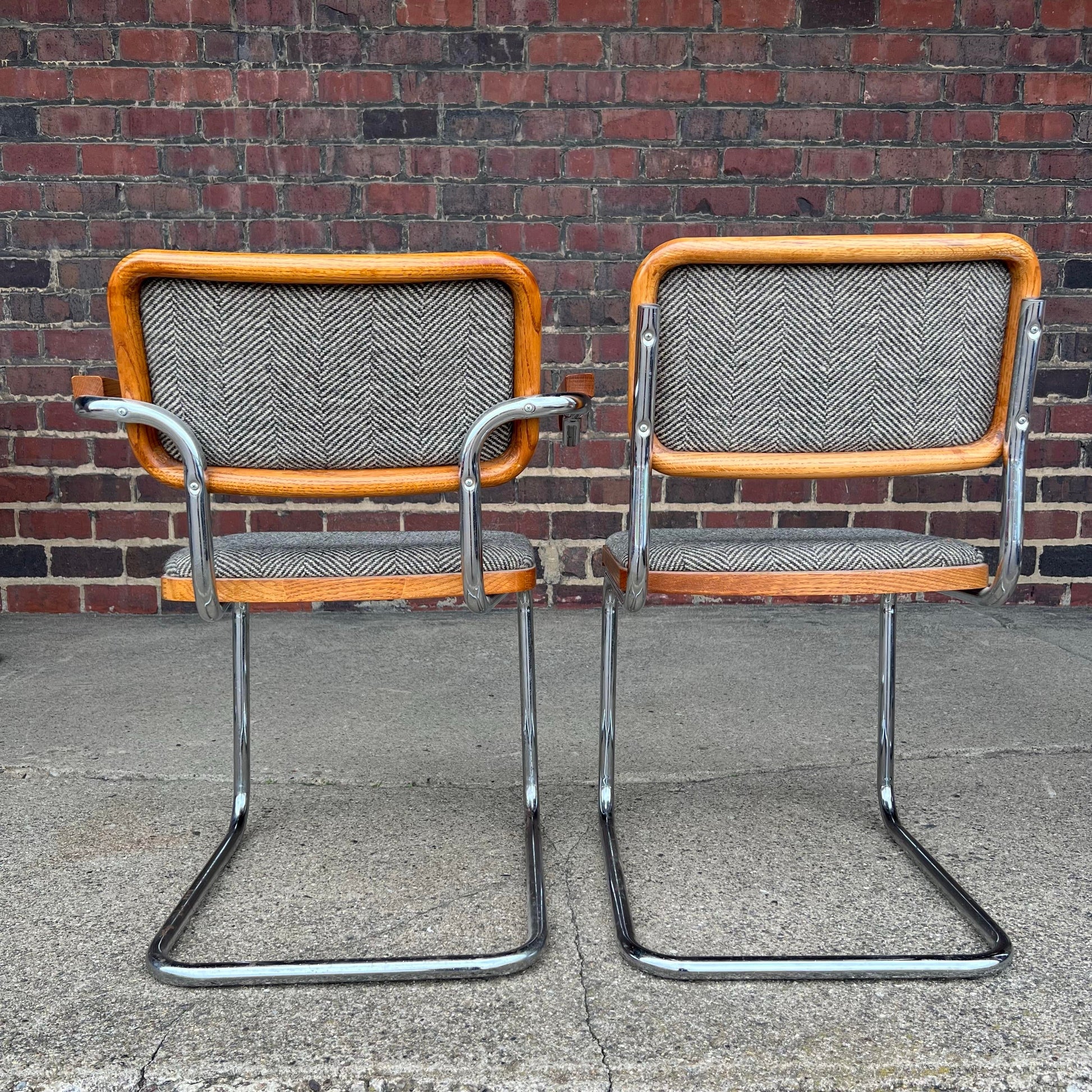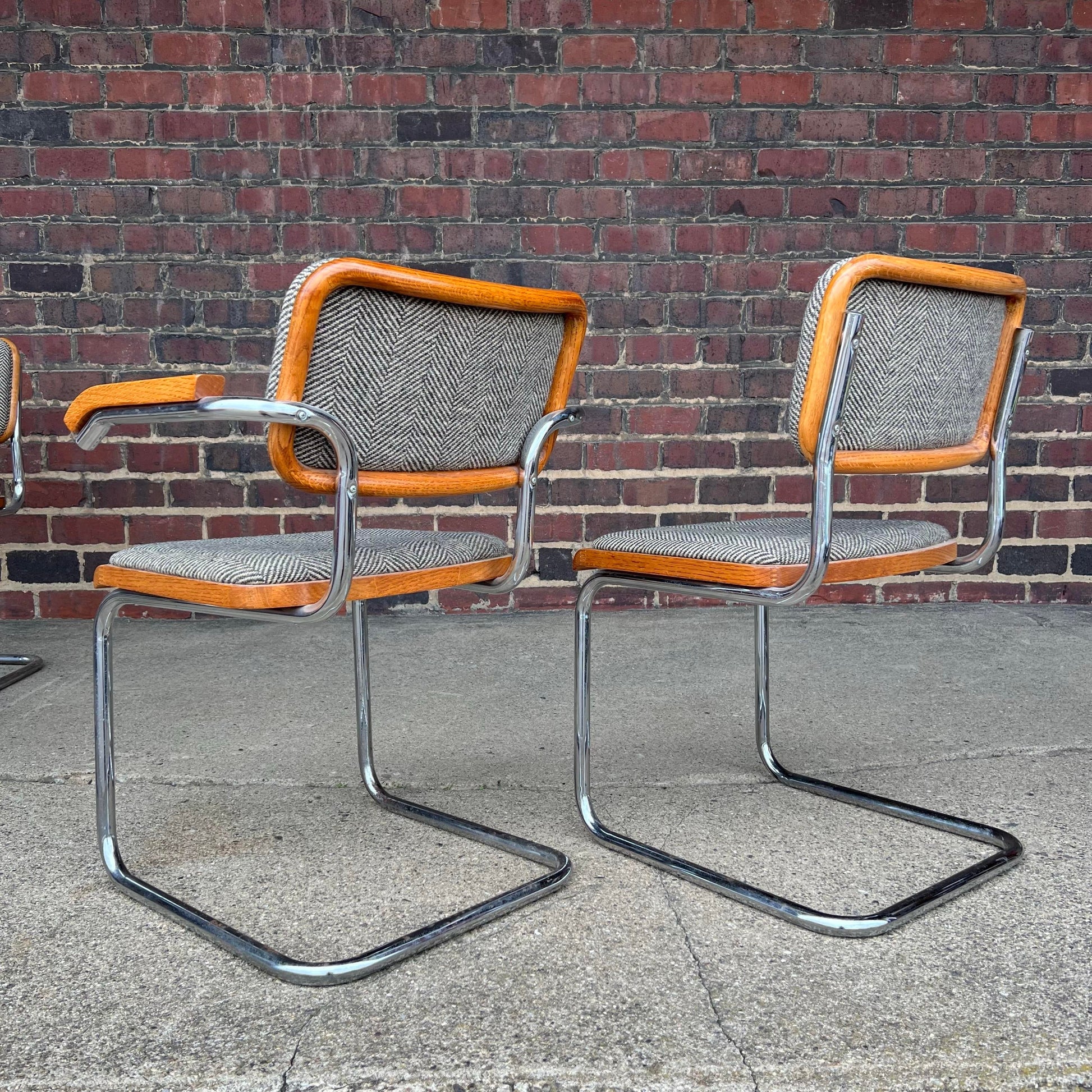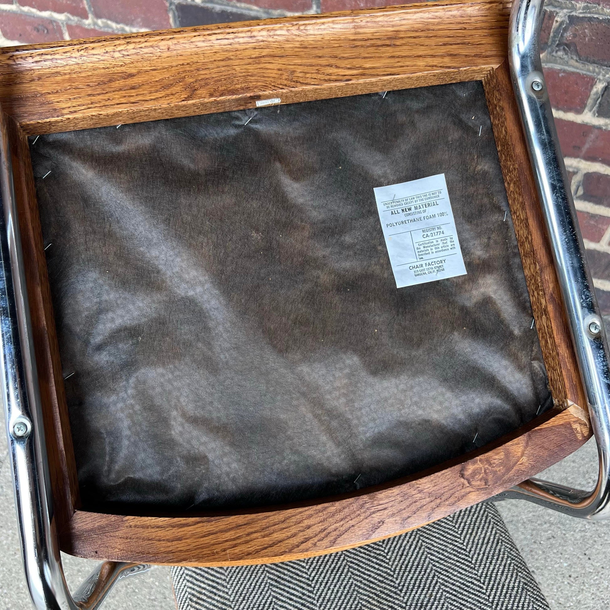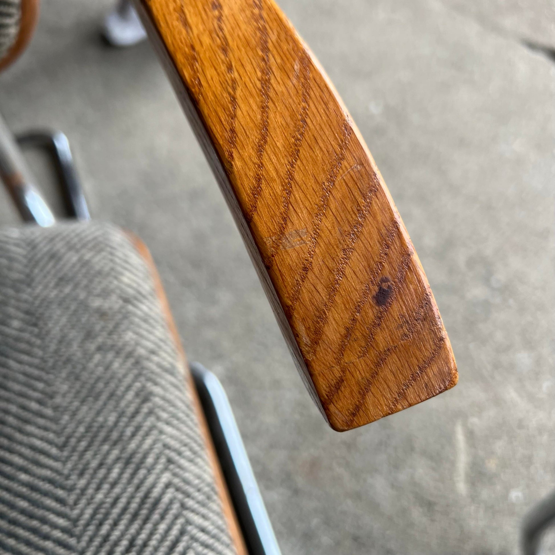 These cantilever chairs are a classic for a reason. Tubular chrome frames juxtaposed with grainy oak makes for a stunning melange of materials. The fabric is a heavy woven chevron of black and beige. This set of 6 would bring a taste of modern into any dining room.