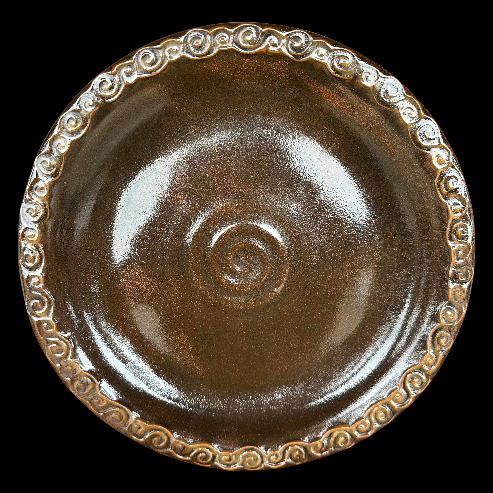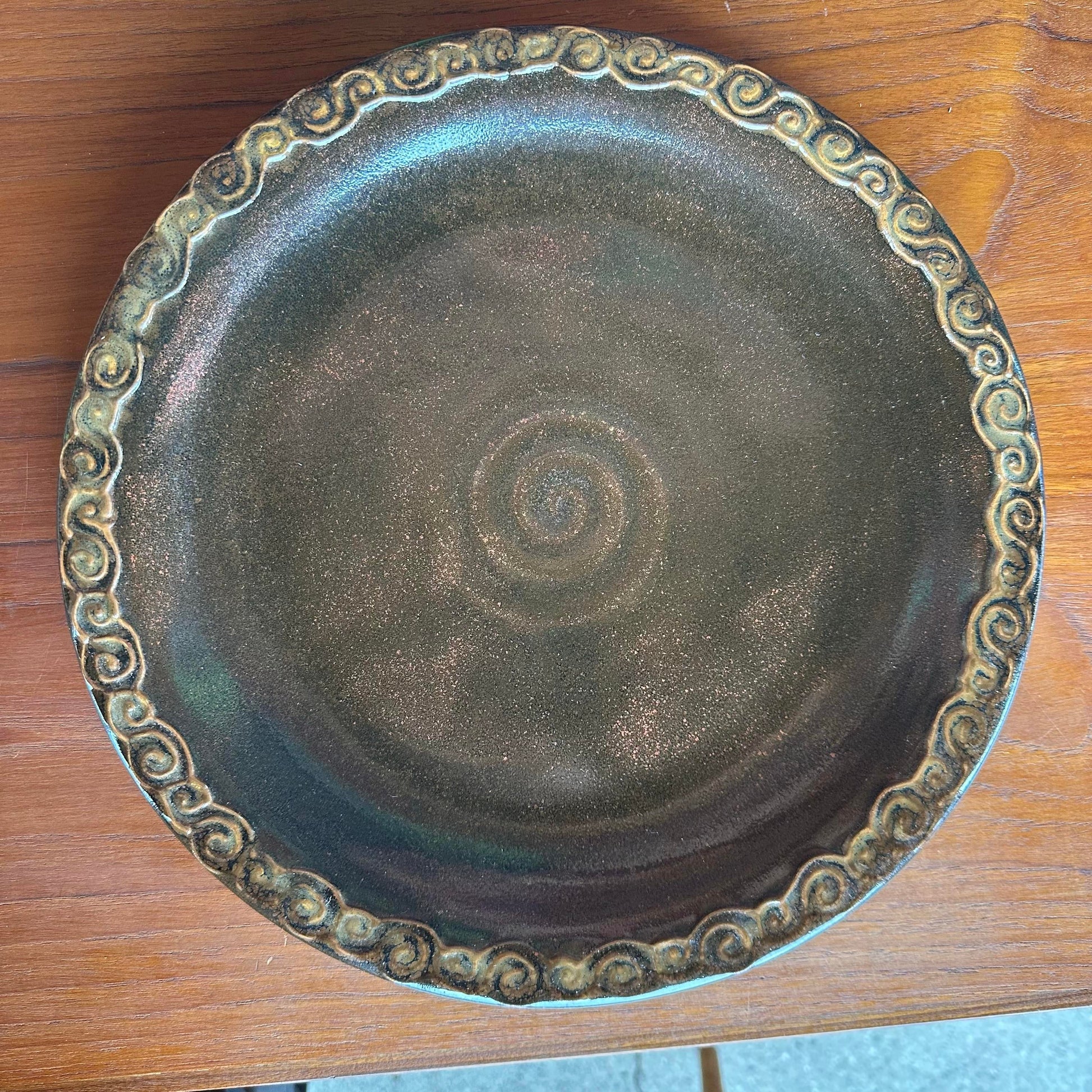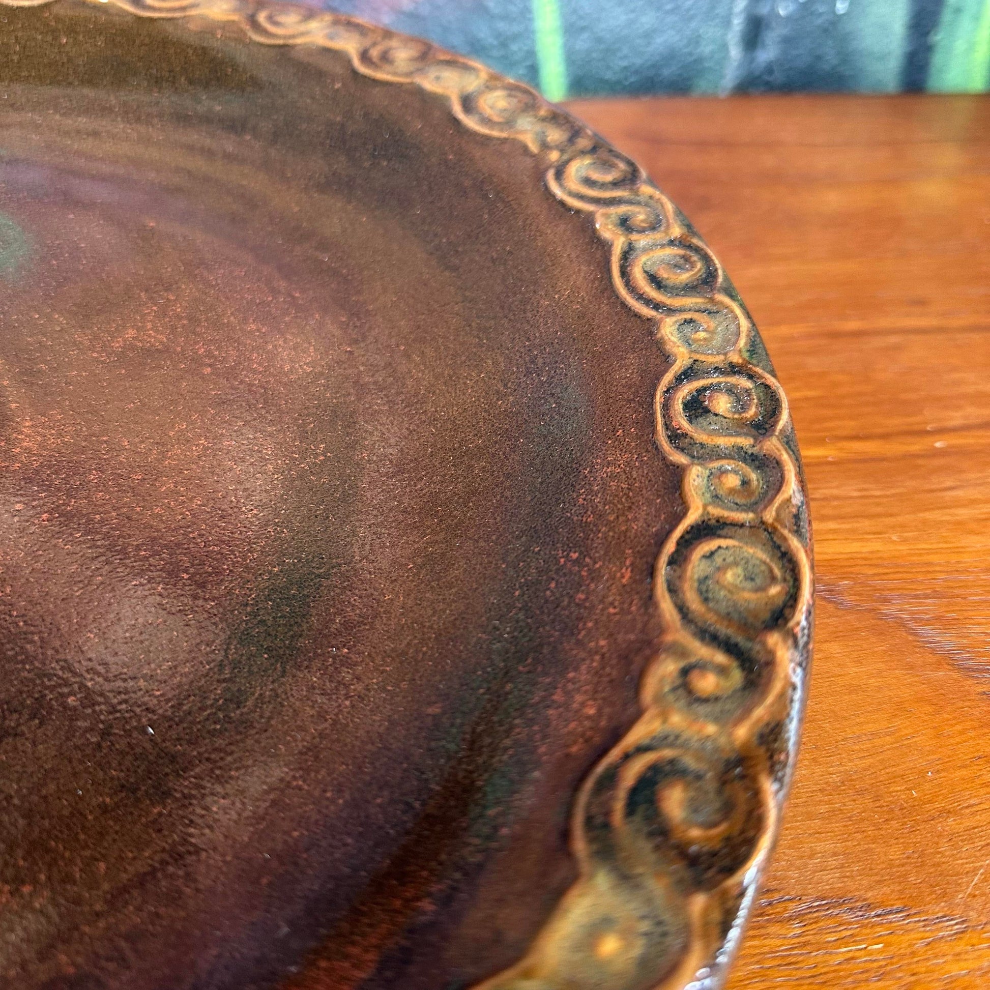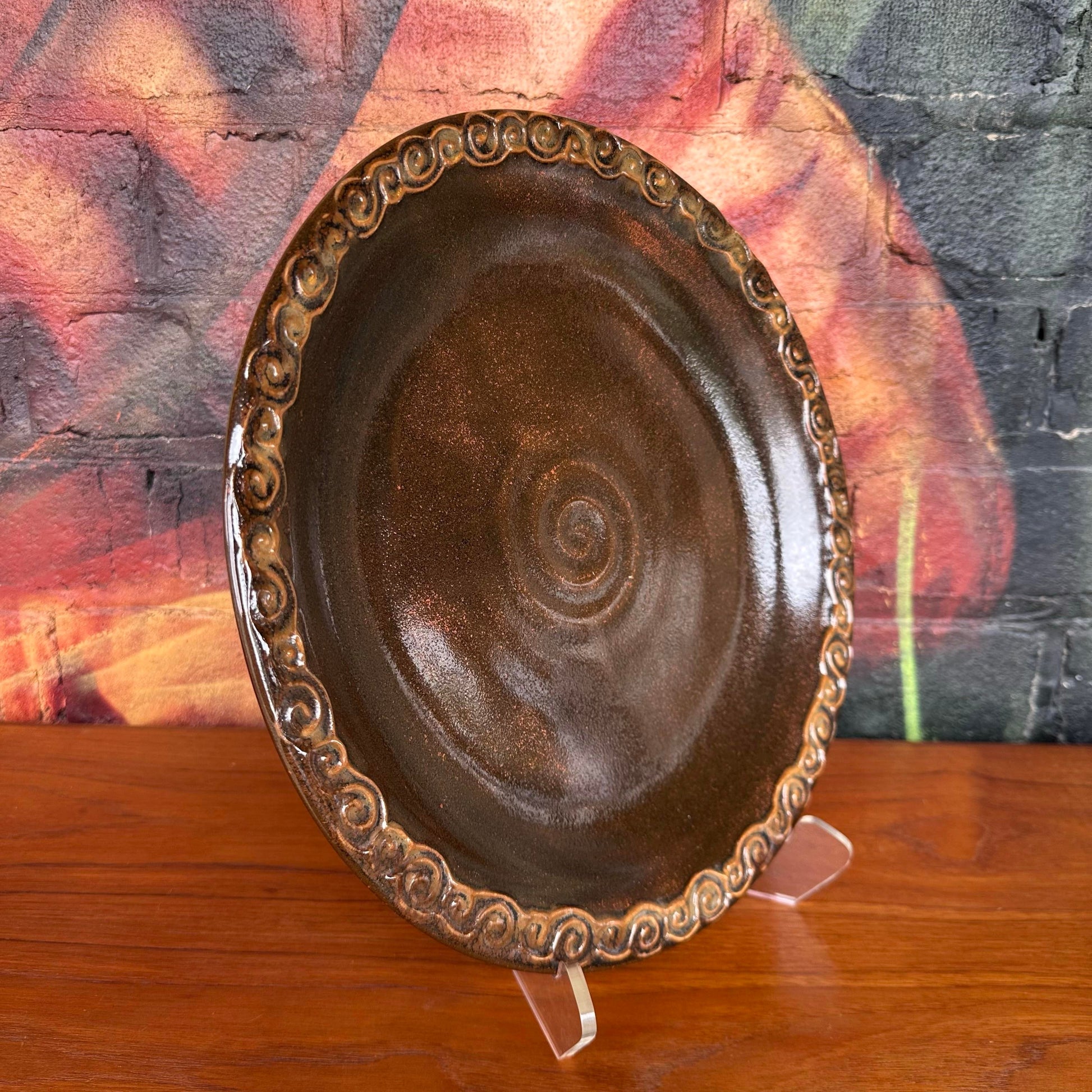 This beautiful, vintage serving dish is believed to have been made by Carrie Adams Smith of Kendall Hills Clay Studios. It features a gorgeous, dark brown glaze covering the decorative, center spiral pattern. The rim of the dish has an intricate swirl pattern finished in a lighter brown glaze which compliments the dish perfectly.