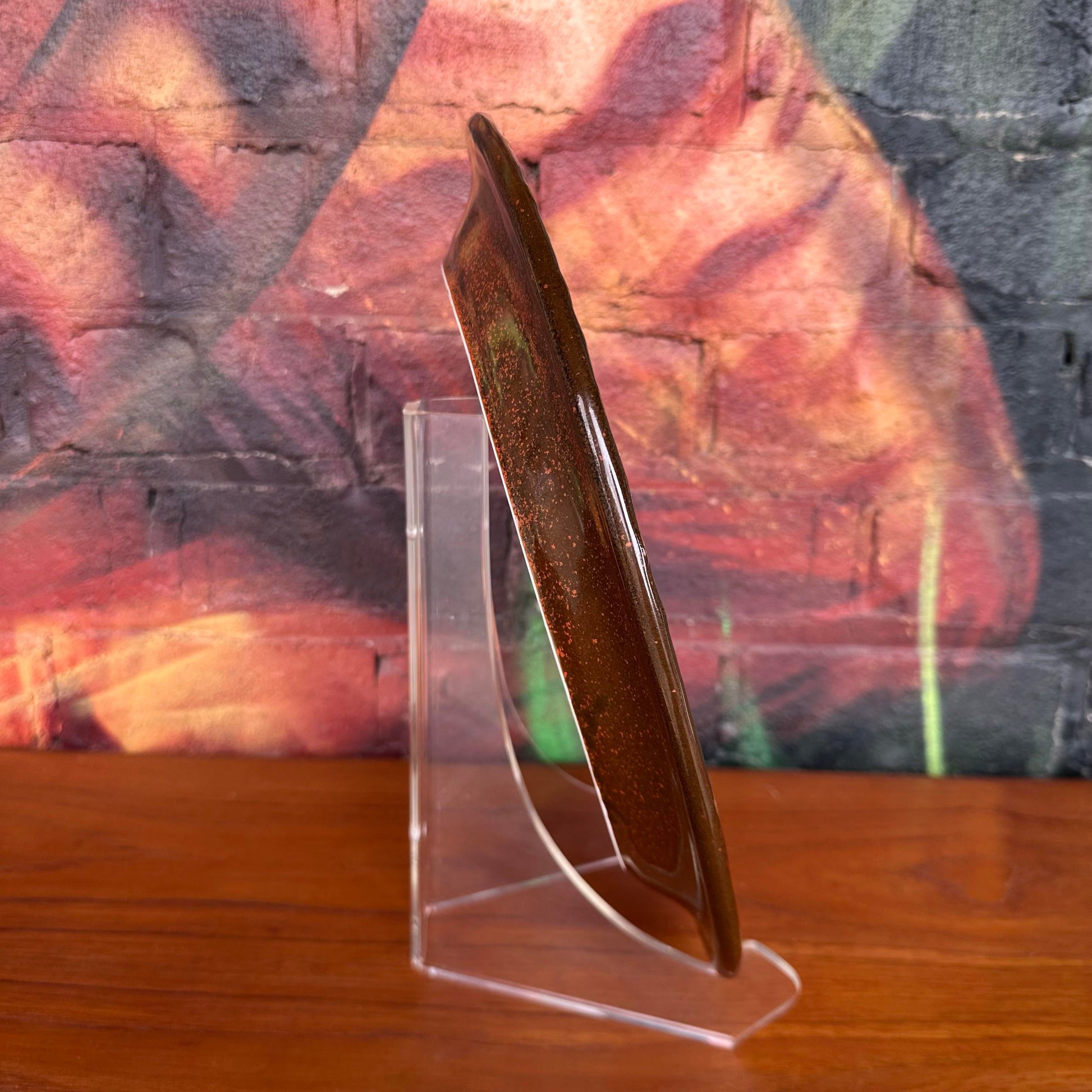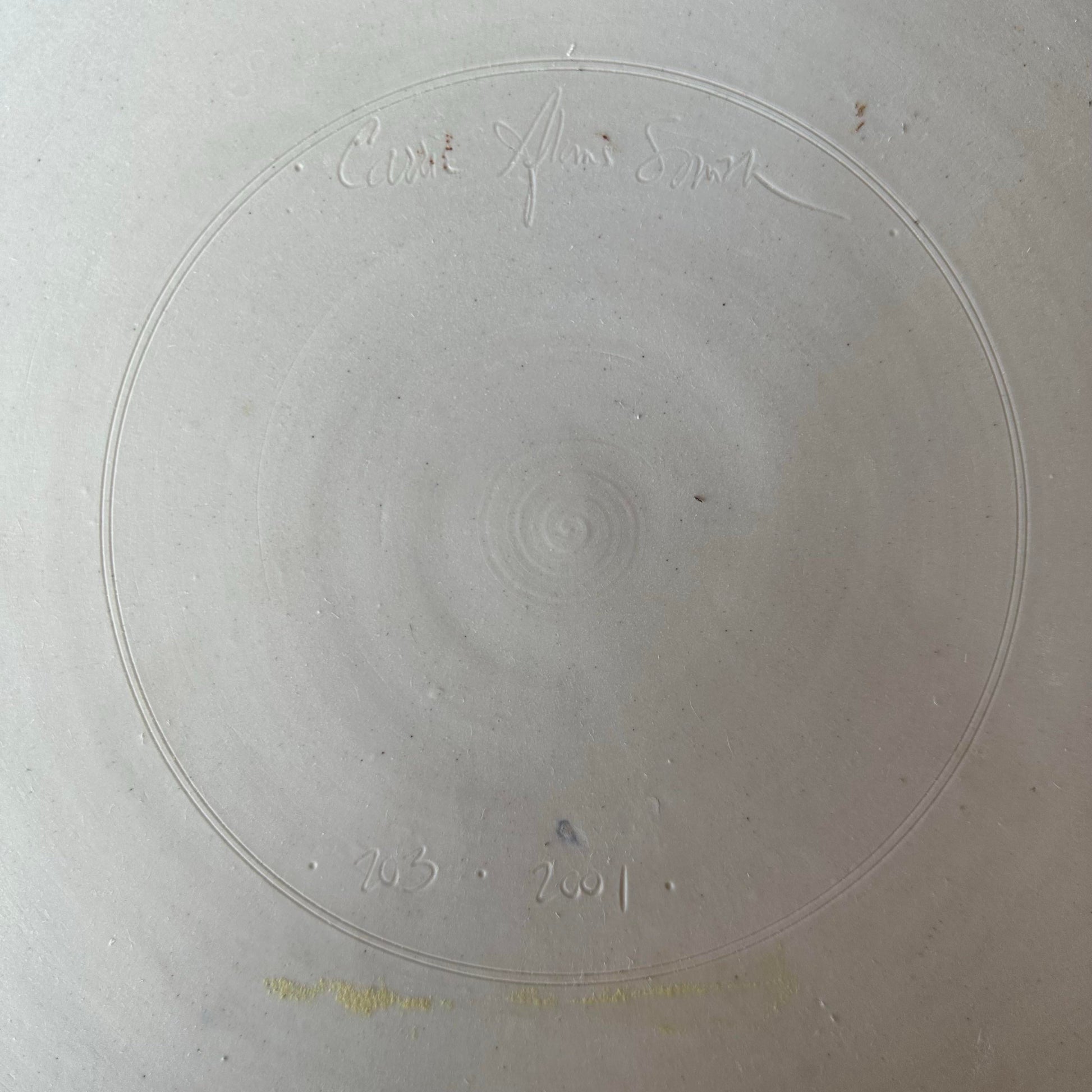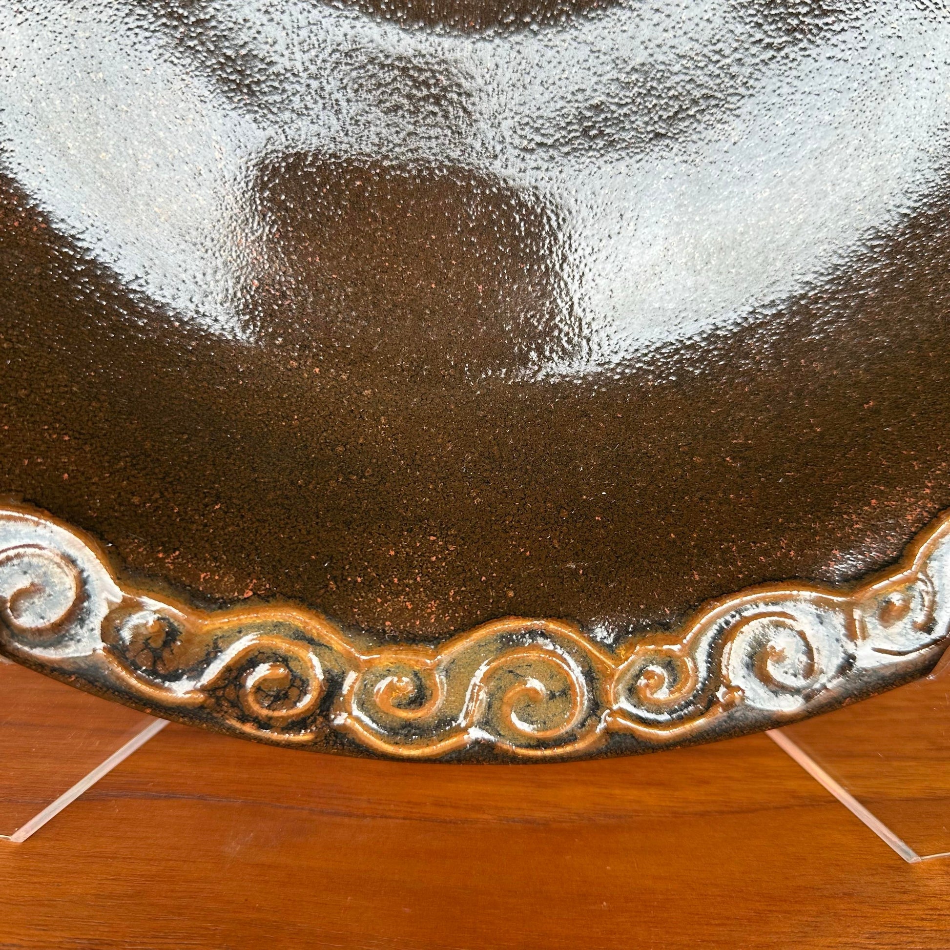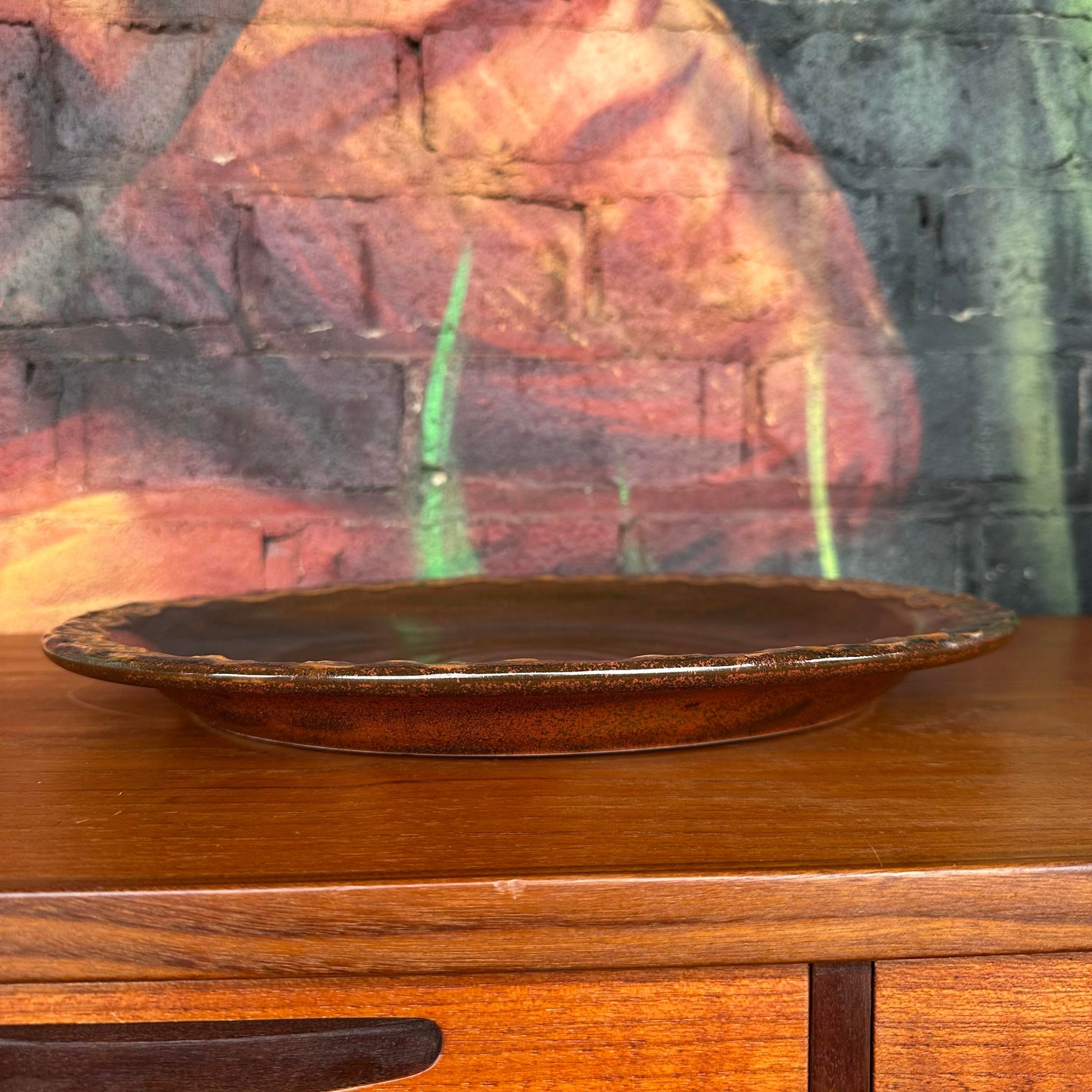 This beautiful, vintage serving dish is believed to have been made by Carrie Adams Smith of Kendall Hills Clay Studios. It features a gorgeous, dark brown glaze covering the decorative, center spiral pattern. The rim of the dish has an intricate swirl pattern finished in a lighter brown glaze which compliments the dish perfectly.