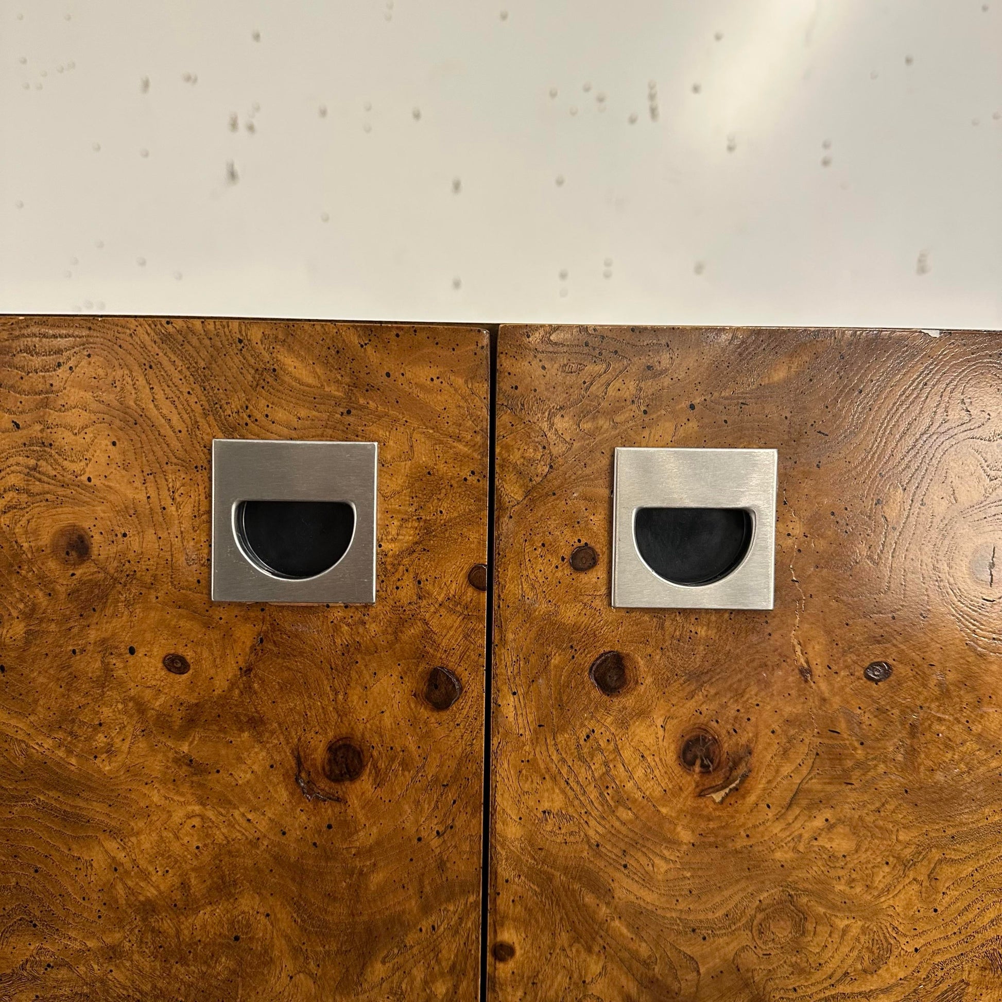 Century furniture mid-century modern burlwood armoire with ample storage. This piece features 6 drawers on the left side, one larger drawer on the bottom, and doors that open to reveal 2 adjustable shelves.