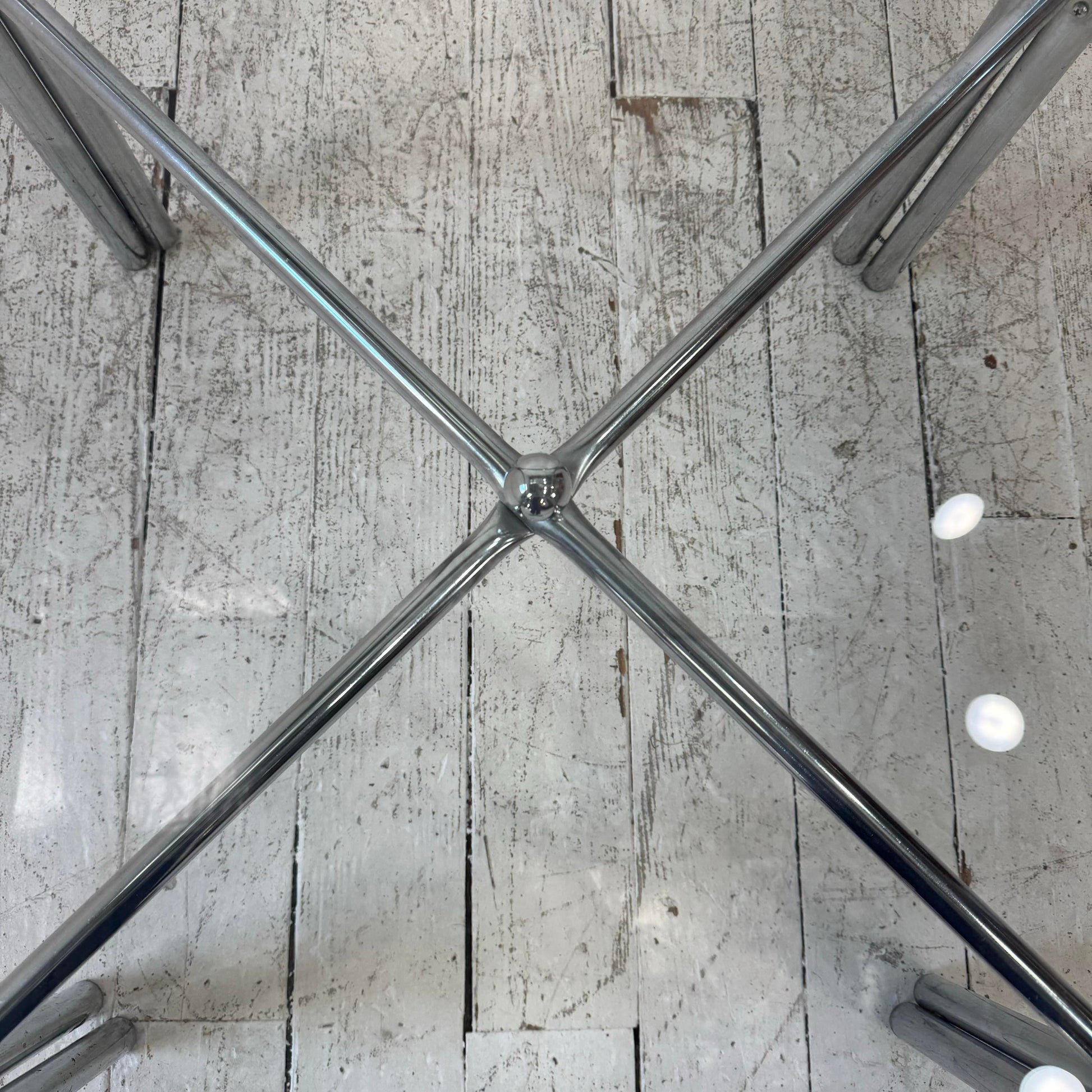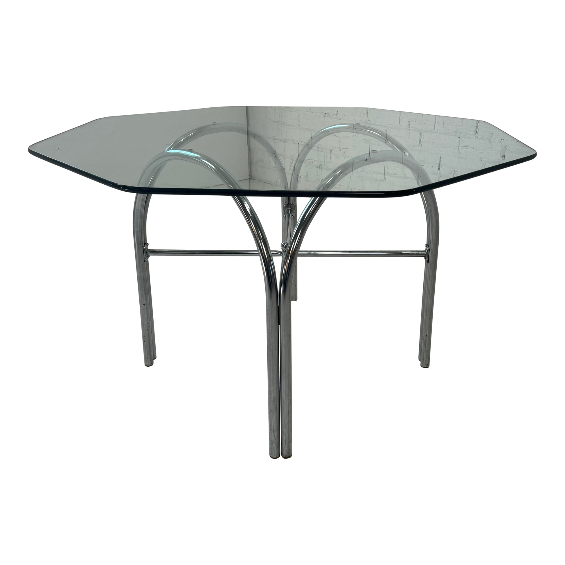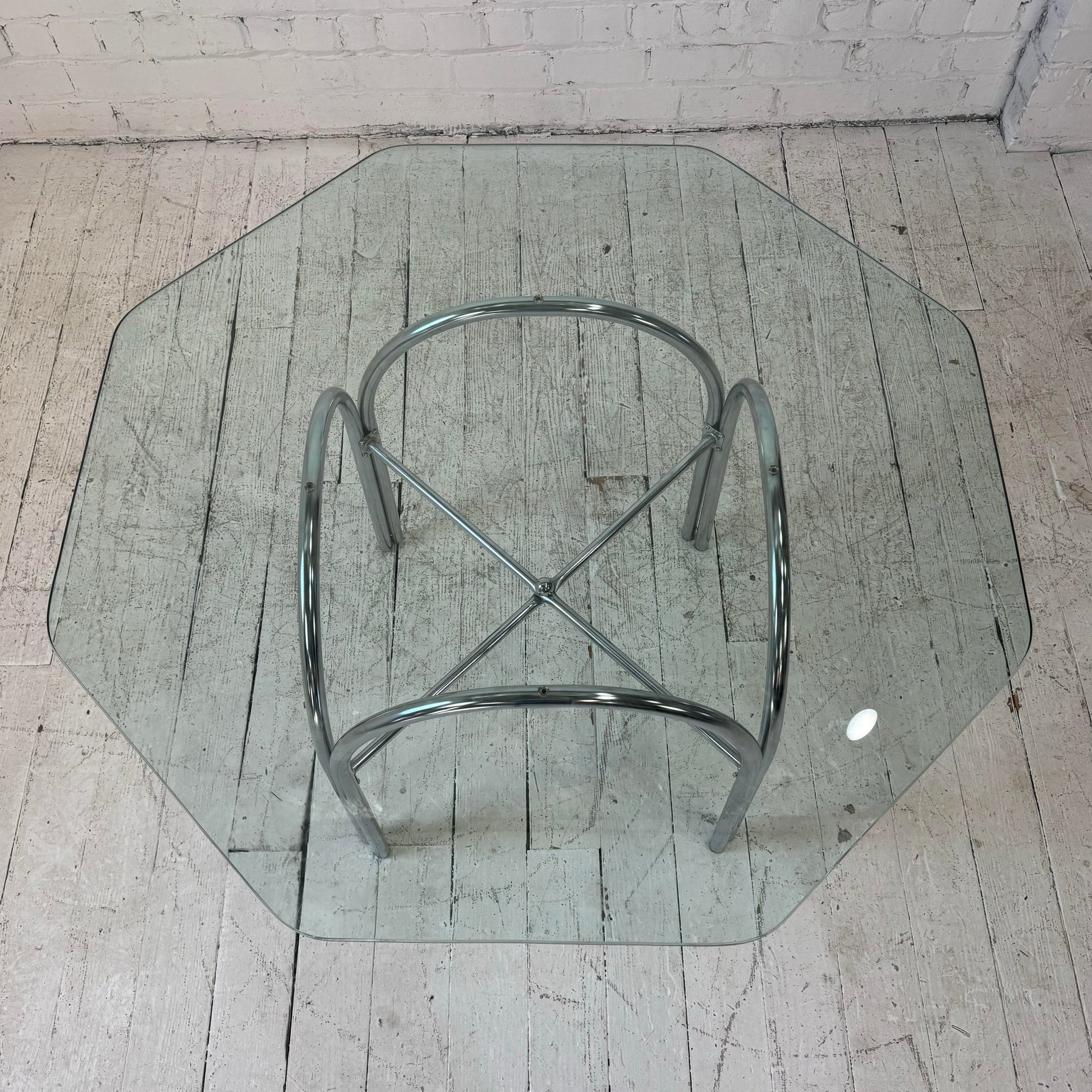 Dining table featuring a chrome tubular pedestal style base with four arches held together with an ‘X’ shaped stretcher and a chrome spherical detail in the center. The base supports a half-inch octagonal piece of glass.