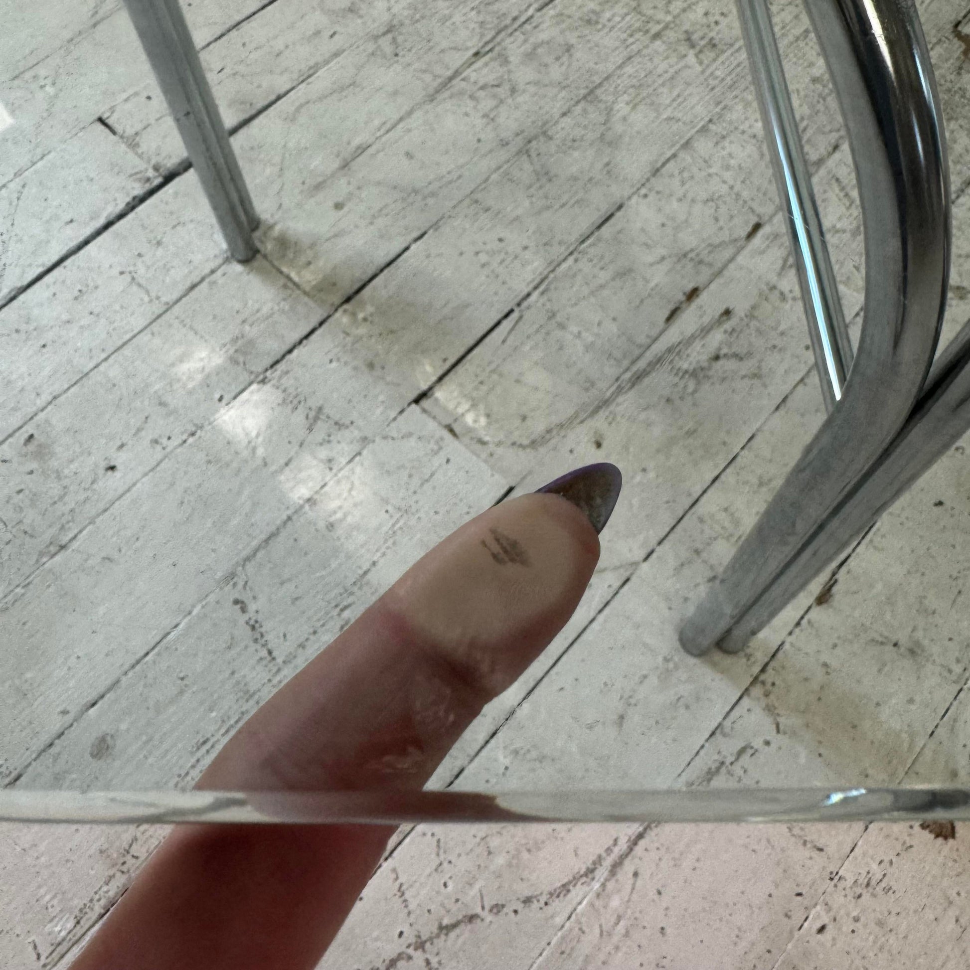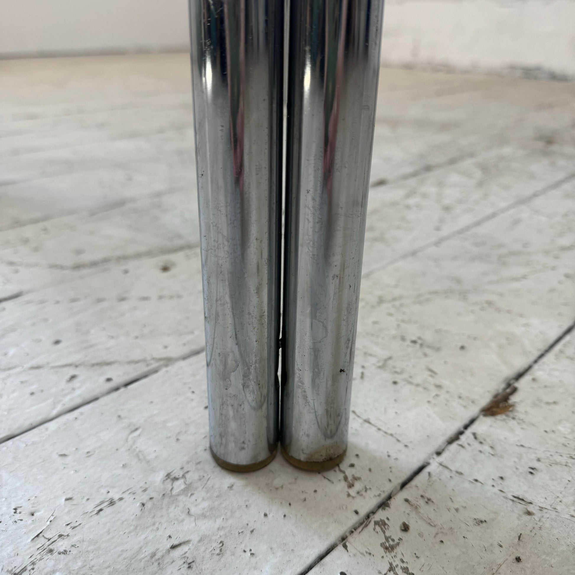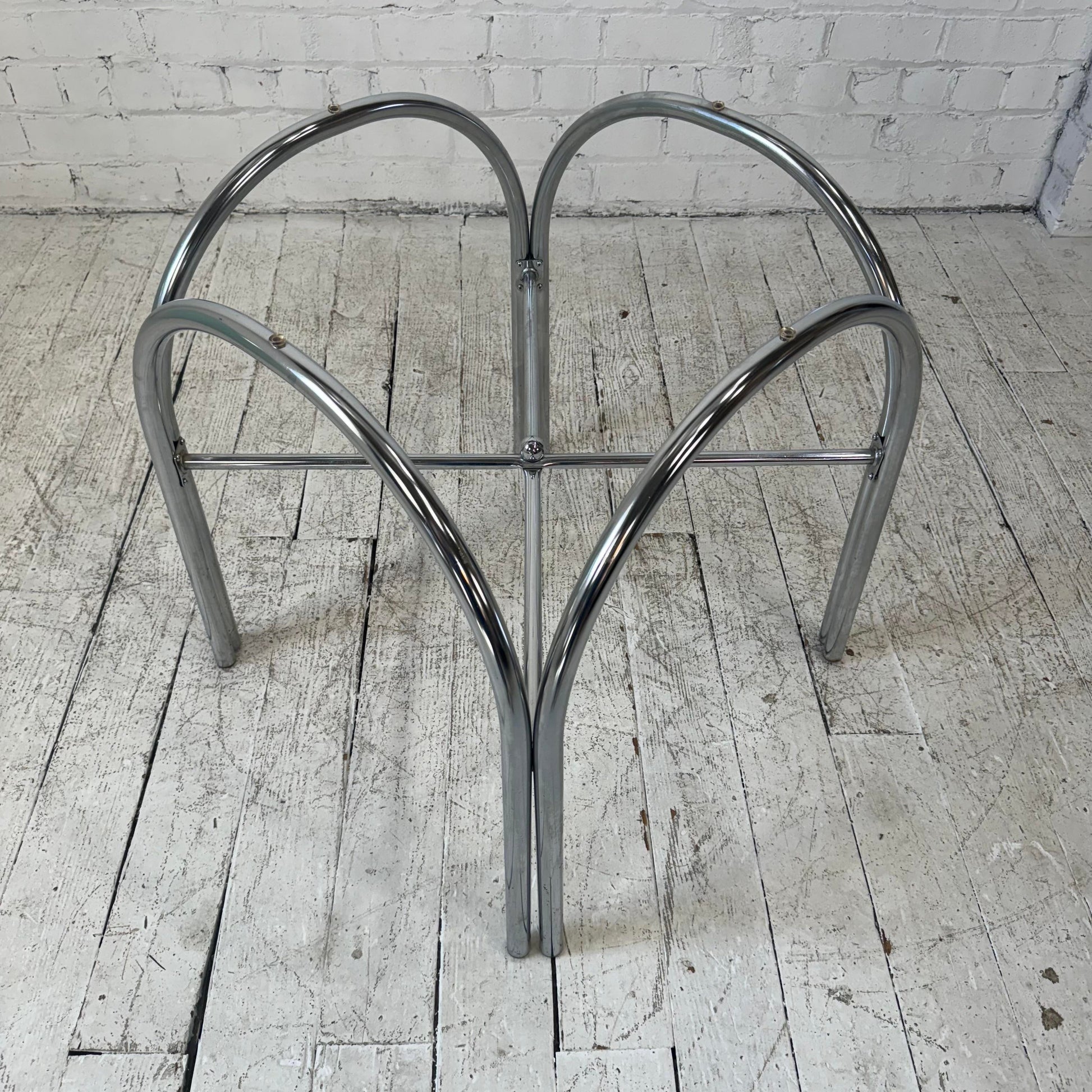 Dining table featuring a chrome tubular pedestal style base with four arches held together with an ‘X’ shaped stretcher and a chrome spherical detail in the center. The base supports a half-inch octagonal piece of glass.