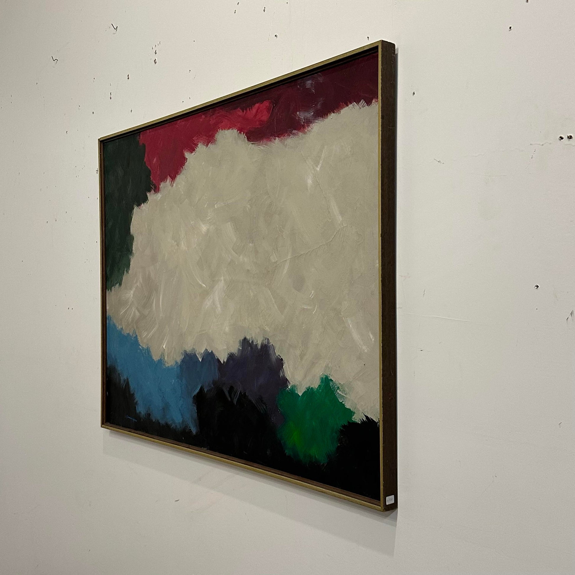 This vintage painting is signed by an unknown artist and features brush stroke fields of colors including a taupe, magenta, deep greens, as well as shades of blue and black. The frame is wood with the front edge of the bevel finished in a metallic gold paint. This piece has some signs of wear. See the condition description for more info.