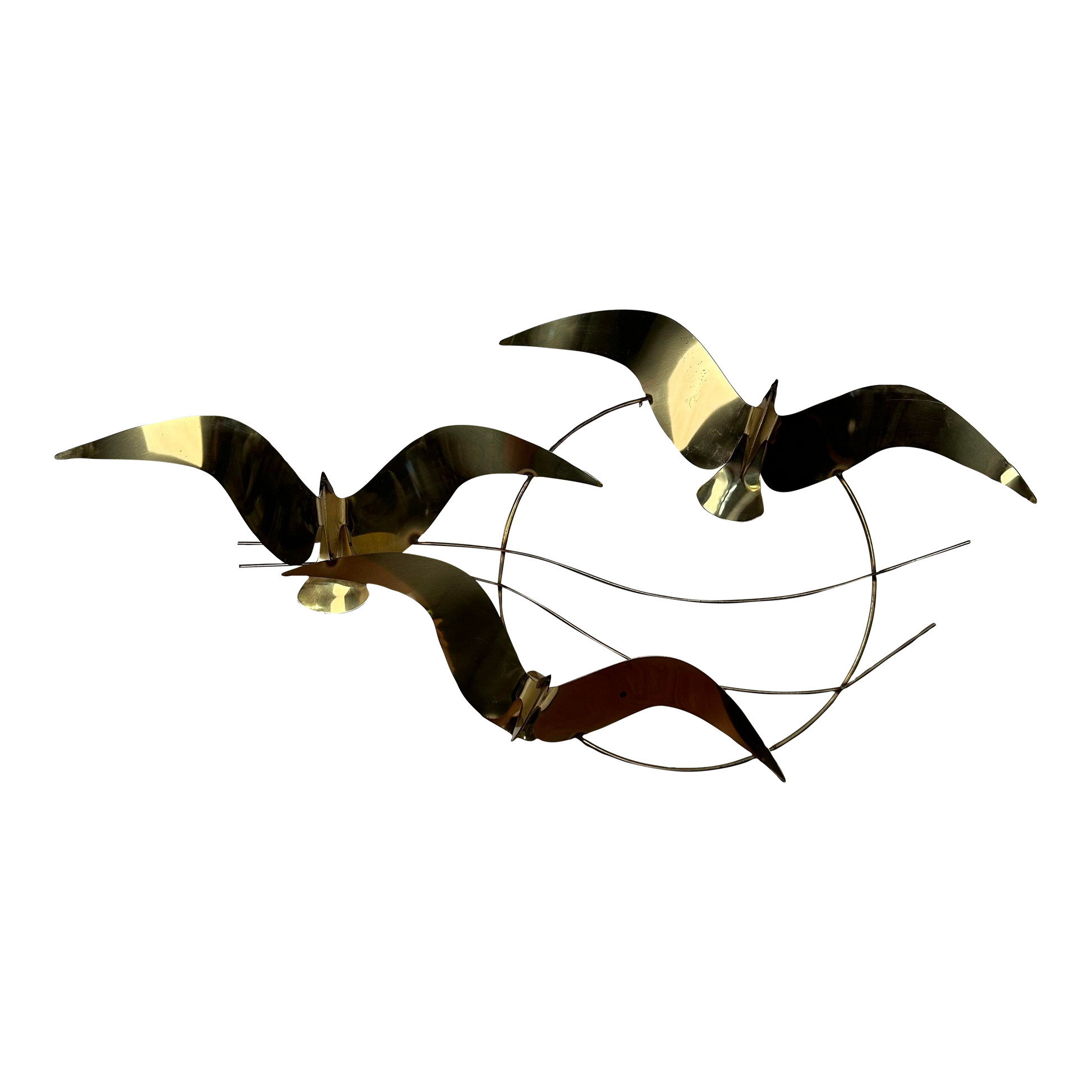 Curtis Jere brass wall hanging featuring 3 seagulls in the sky with an abstract cloud/sun behind them. Signed 1985.