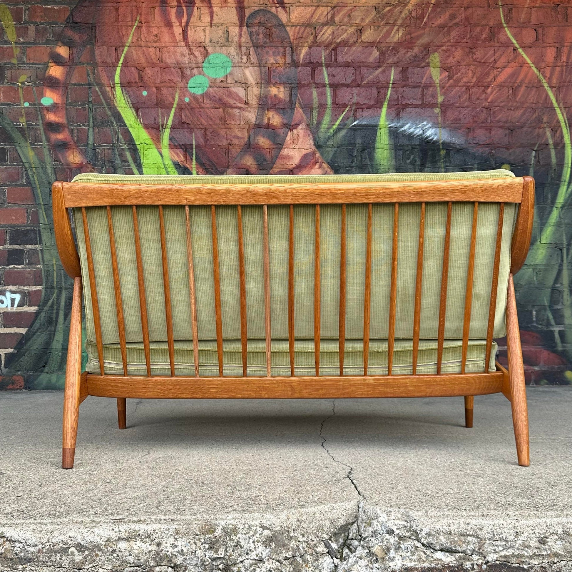 An excellent example of Danish modern design. Peter Hvidt teak loveseat with green striped cushions. This piece has been cleaned up and reupholstered. No makers mark.