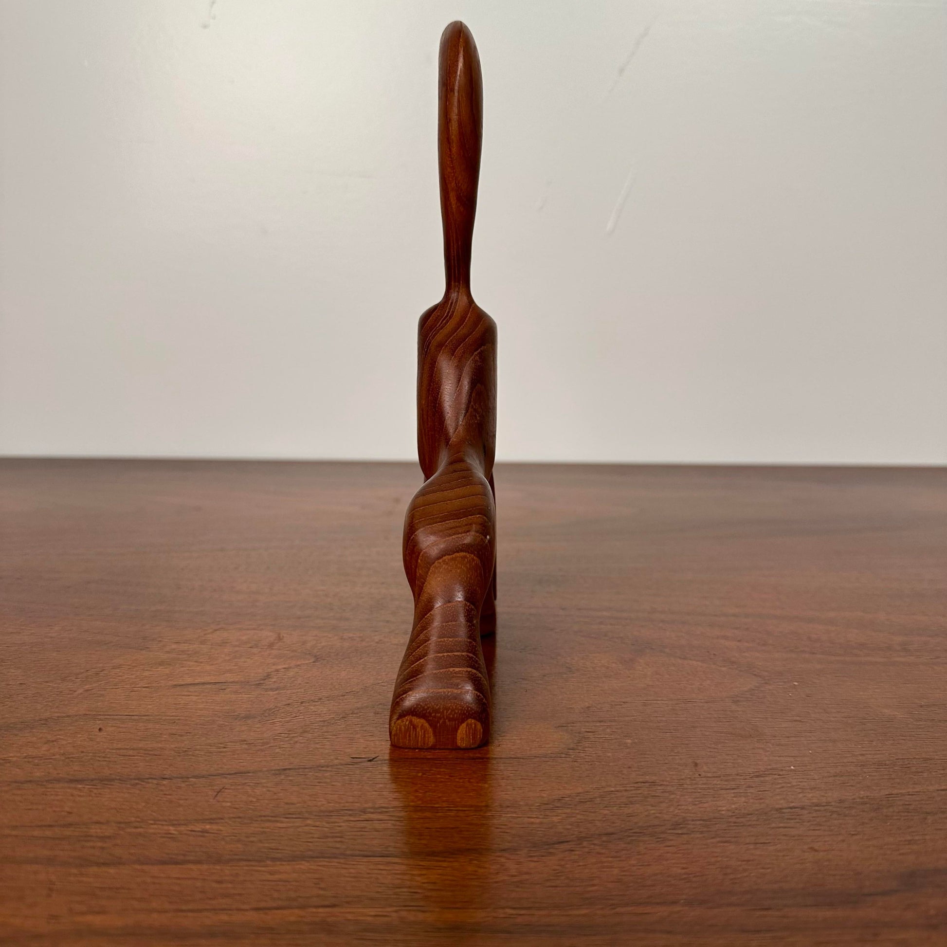 Mid Century Danish Modern Teak character Sculpture by Designer is J. Bentsen. This piece features Beautiful, sleek, modern lines sculptured from teak wood. The eyes of the character are painted black and white. There is a makers mark on the bottom of the piece.
