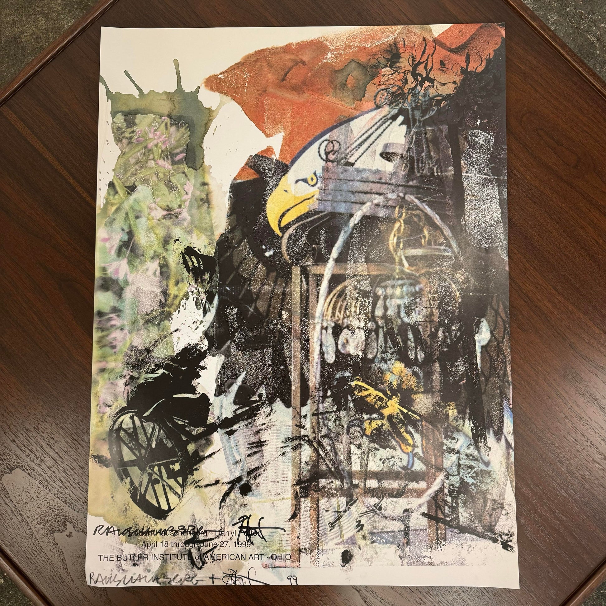 This is a poster from an exhibition of Robert Rauschenberg and Darryl Pottorf's work at the Butler Institute of American Art in 1999. Printed on paper and unframed. The poster is signed by both artists.