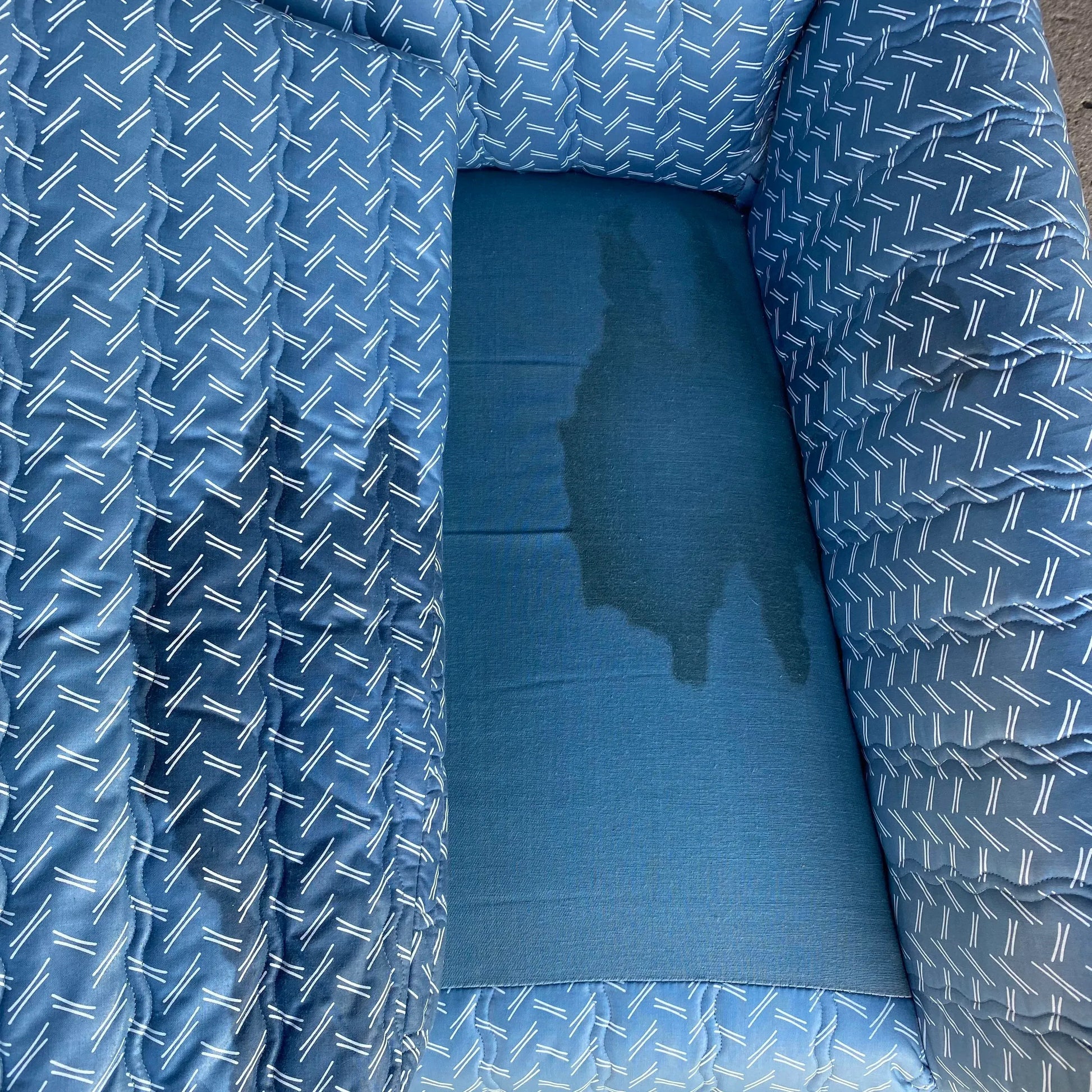 Chair has been reupholstered since original in a blue quilted fabric that is dirty foam seems in good condition.