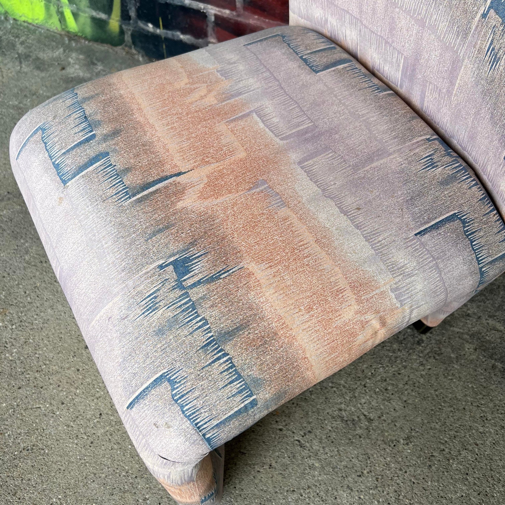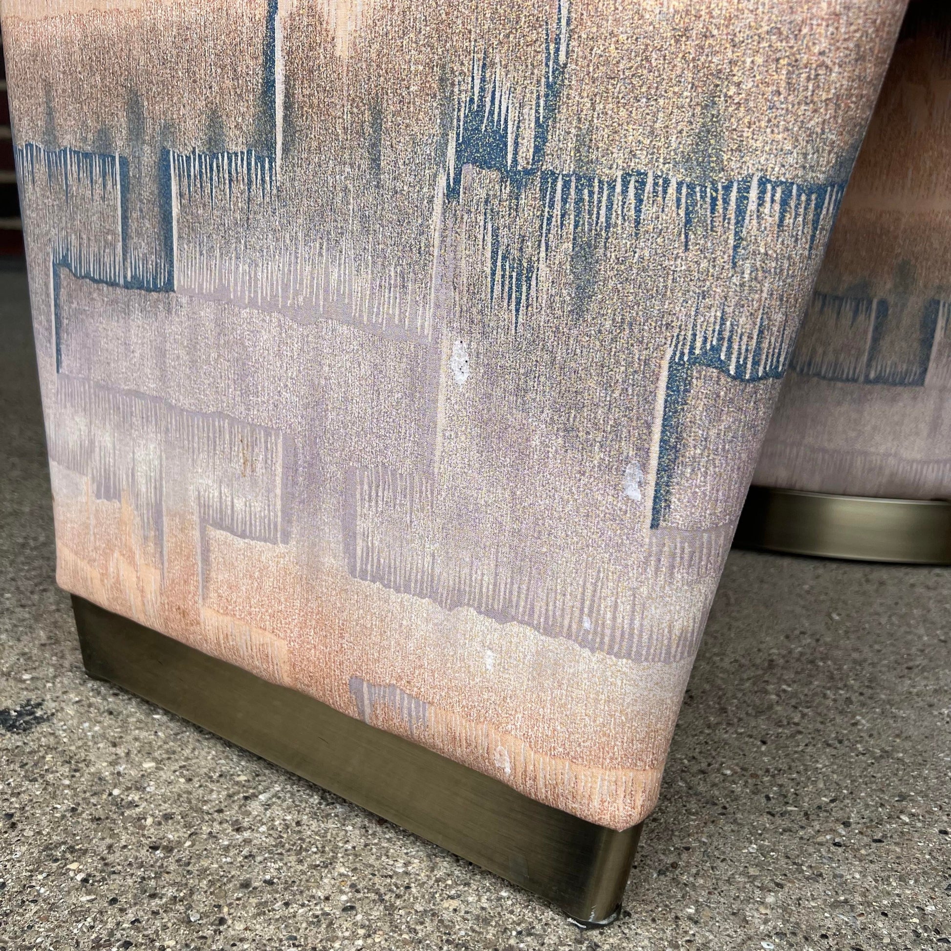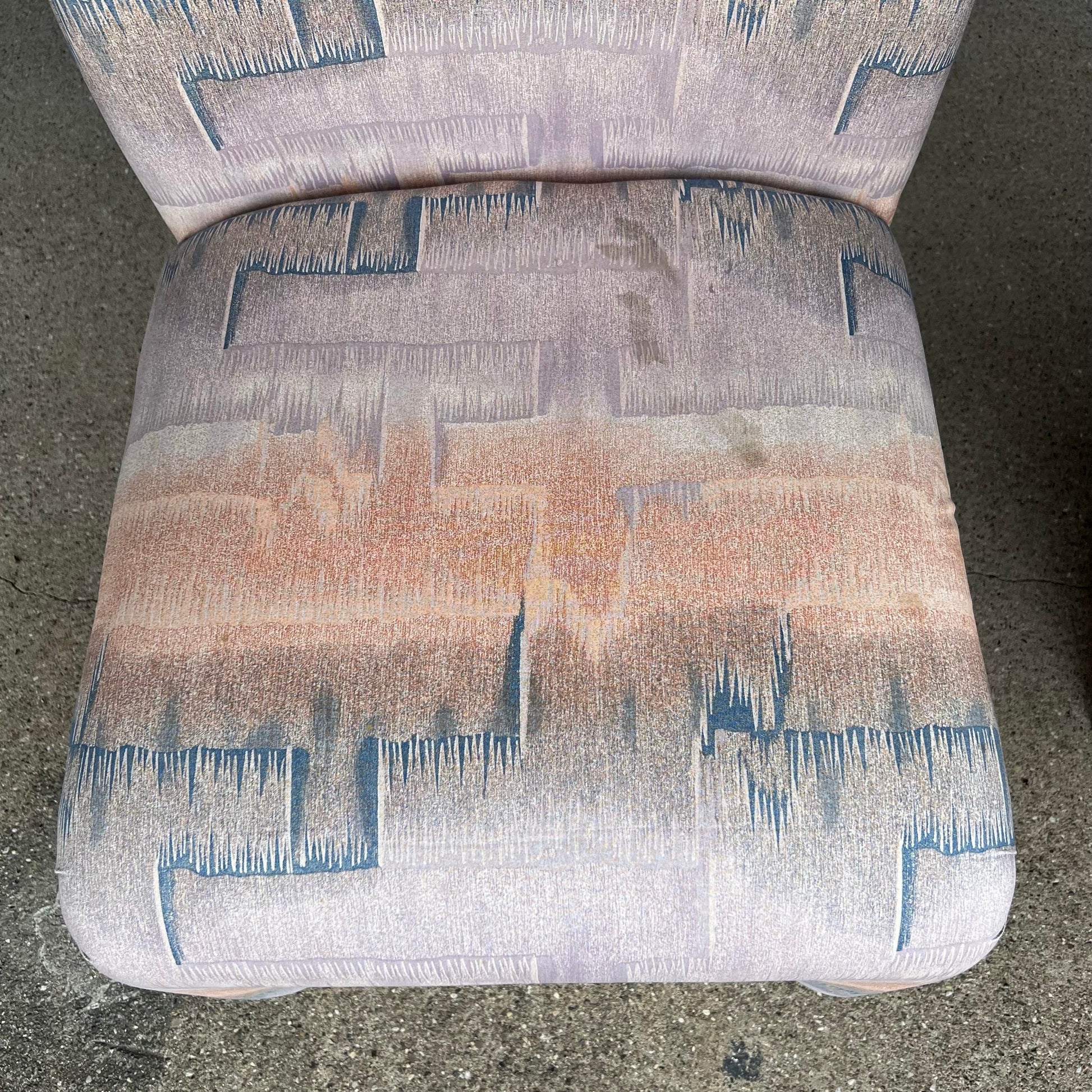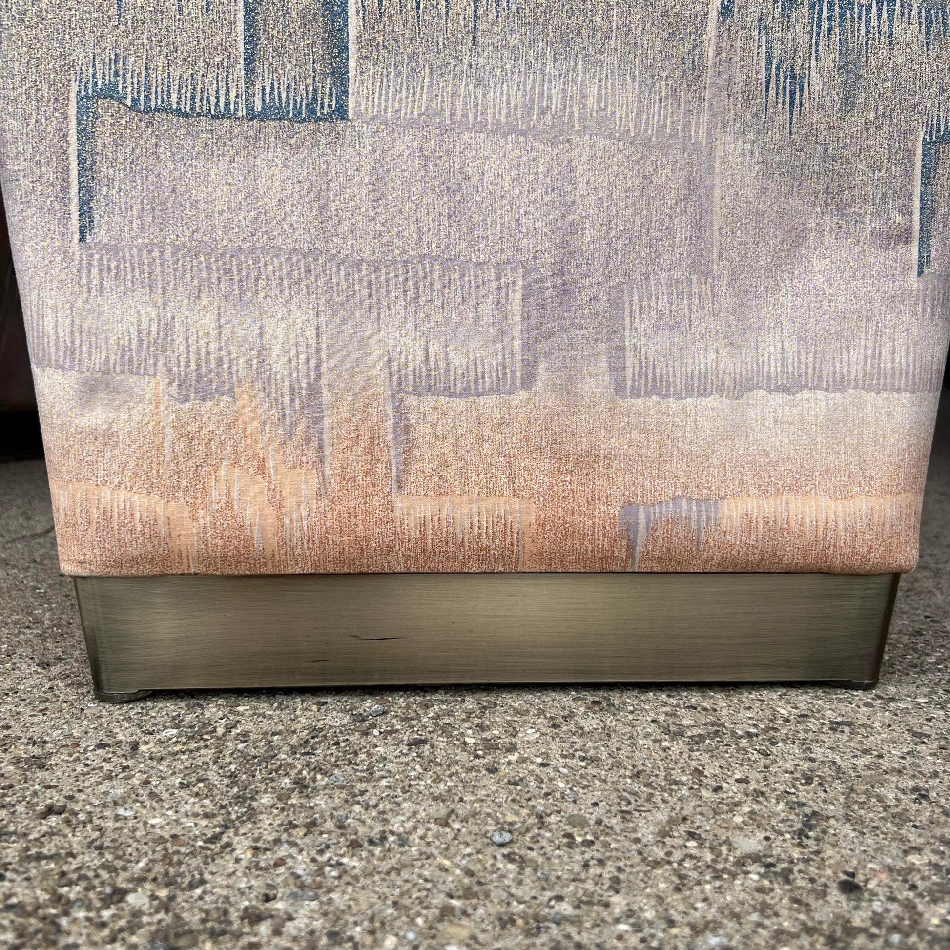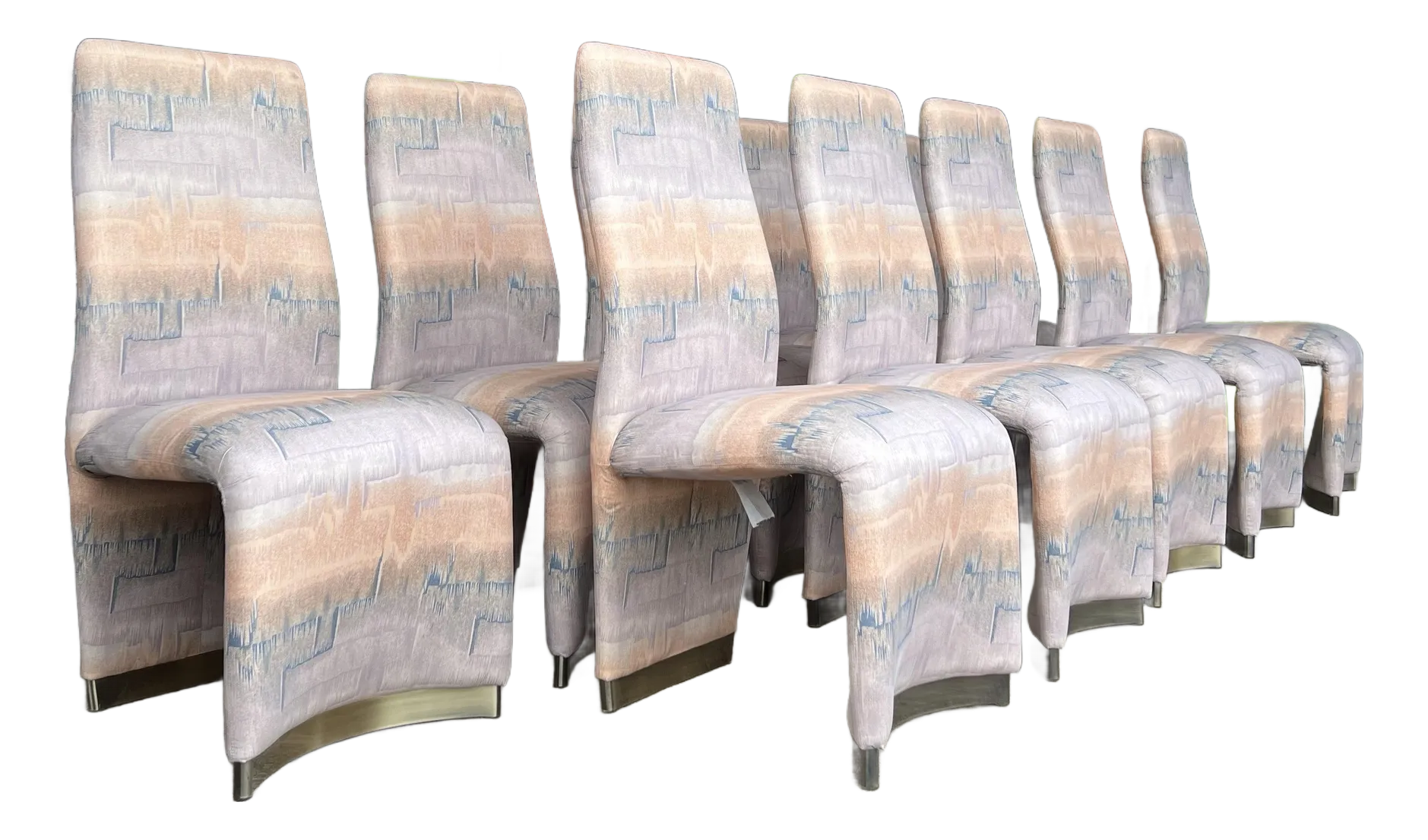 This beautiful set of postmodern, tall back dining chairs was produced by Design Institute of America. They feature a tall, sculptured frame inspired by the styles of Milo Baughman and Vladimir Kagan and are covered in a creamy peachy, lavender and blue fabric with brass brushed metal feet.