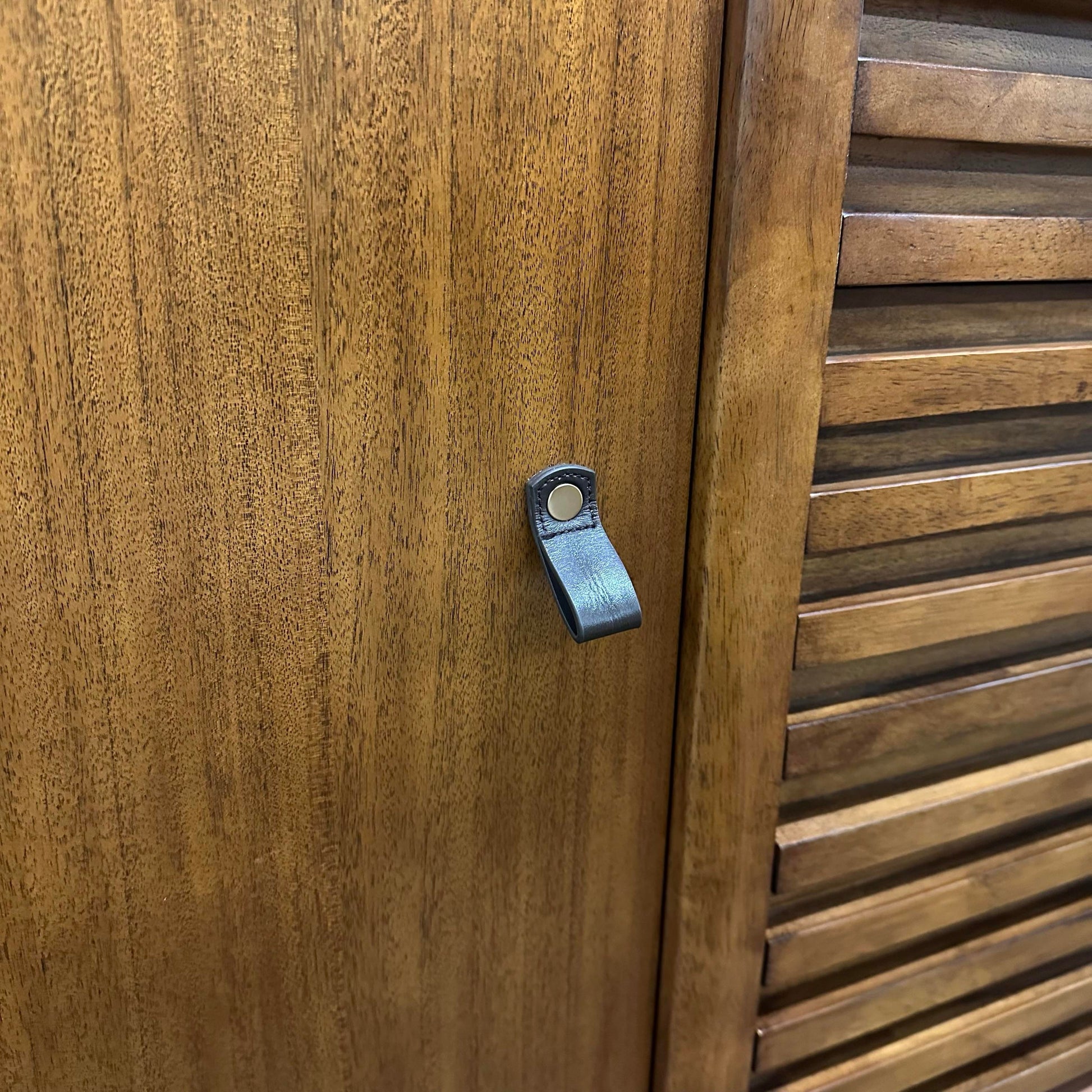 Drexel heritage credenza featuring leather pulls, woven drawer fronts, and a travertine top. There are 3 pull-out drawers in the center and 2 doors on either side that open up to reveal further storage with adjustable shelving.