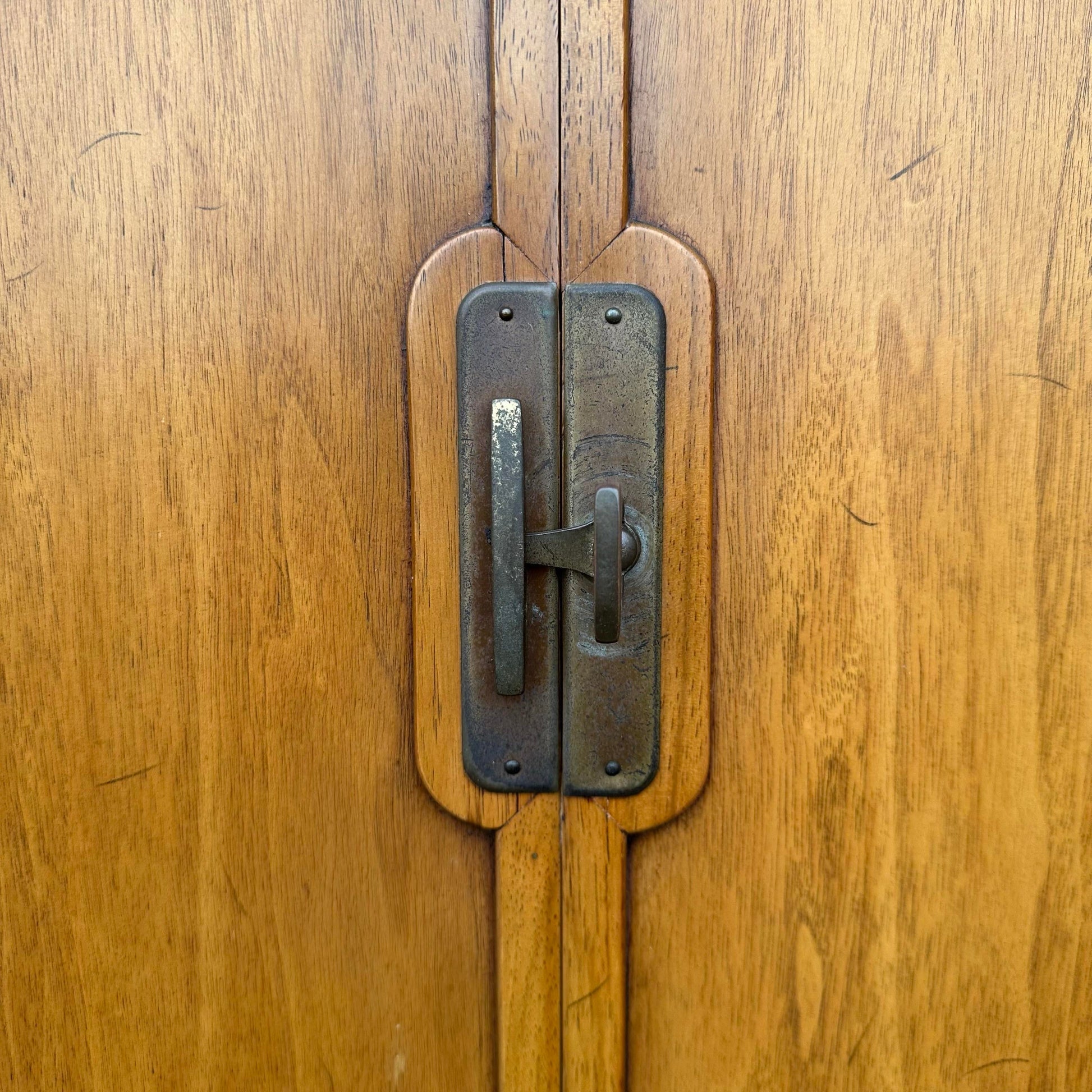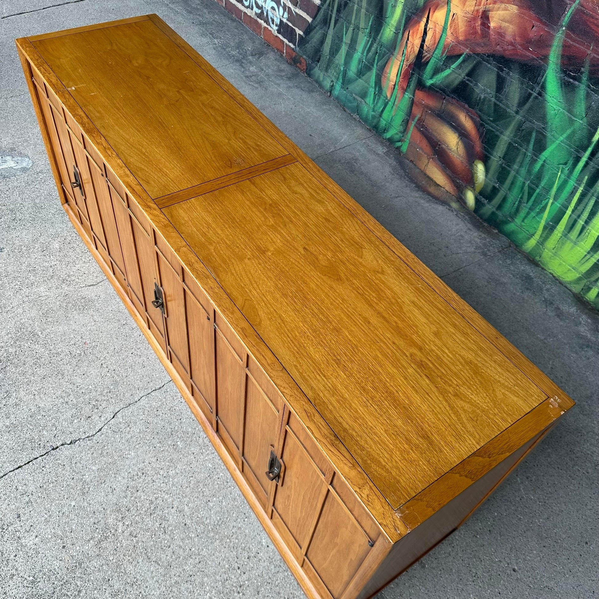 Mid-century Drexel credenza from the Meridian line. This piece has 3 sets of doors with locking mechanisms that open to reveal a total of 4 drawers and 3 adjustable shelves. There is a makers mark on the inside of a top drawer.