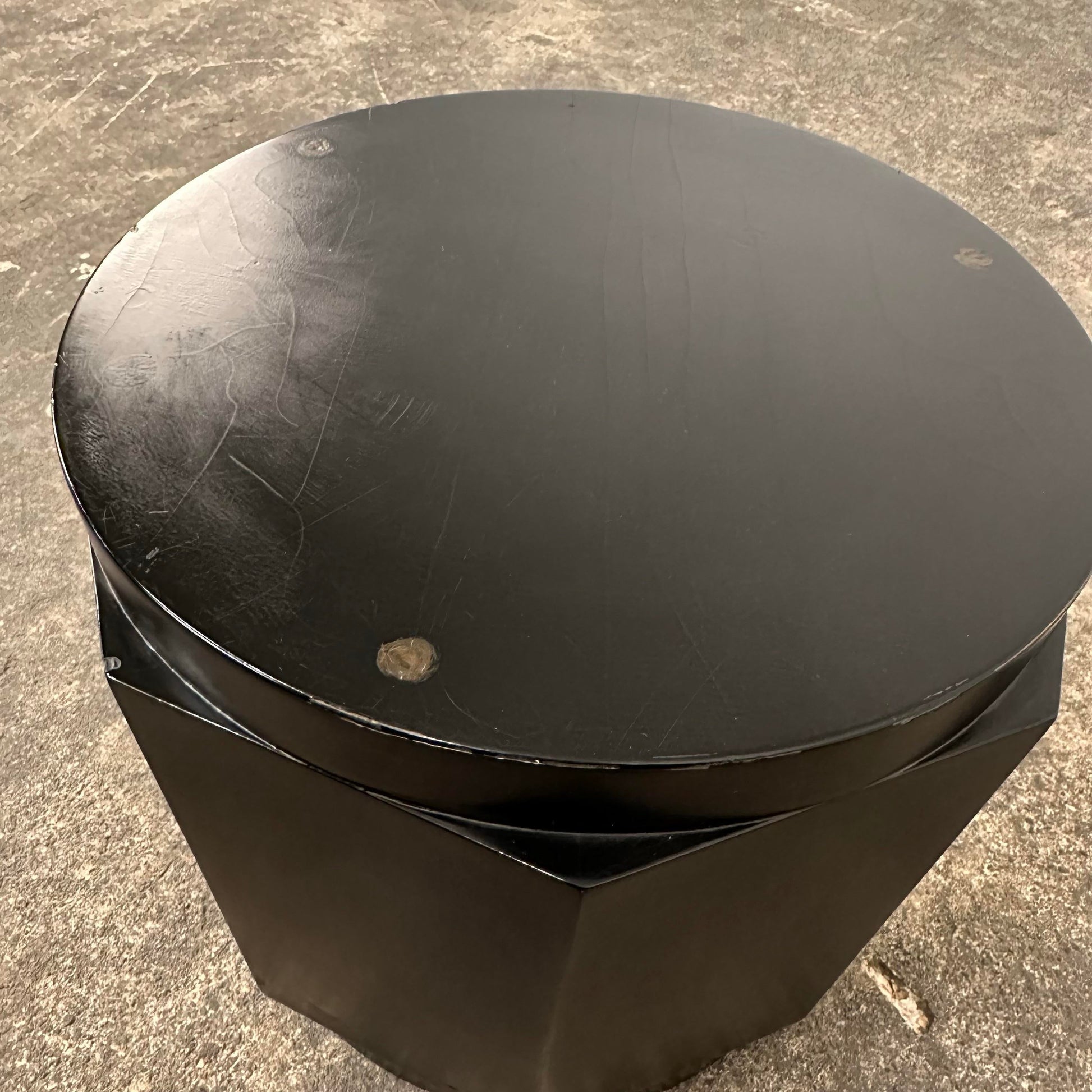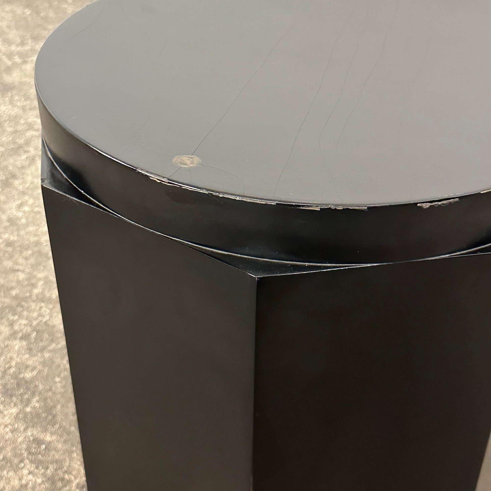 Dunbar pedestal-style side table. This geometric hexagonal shaped side table has a black finish and a round top. No makers mark.