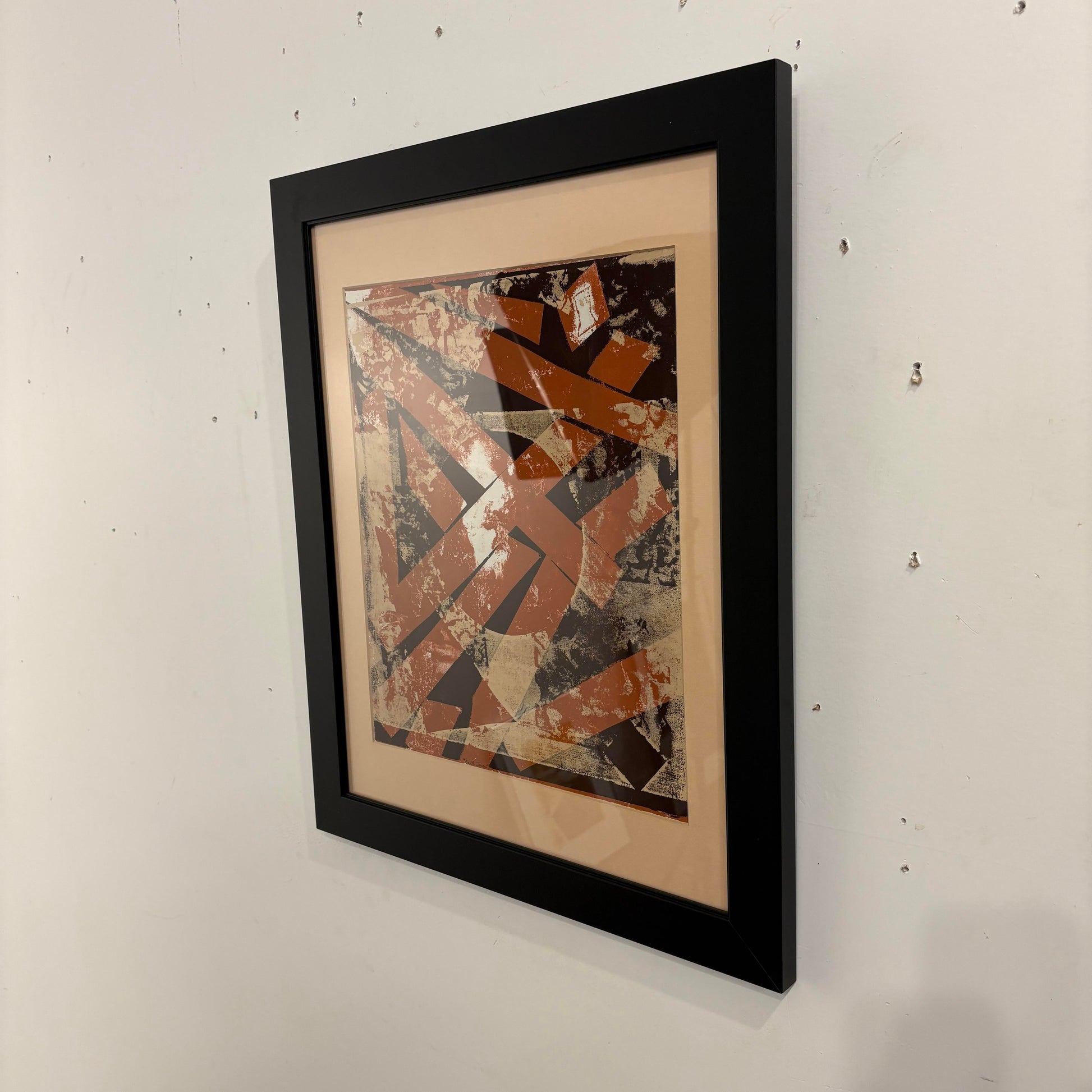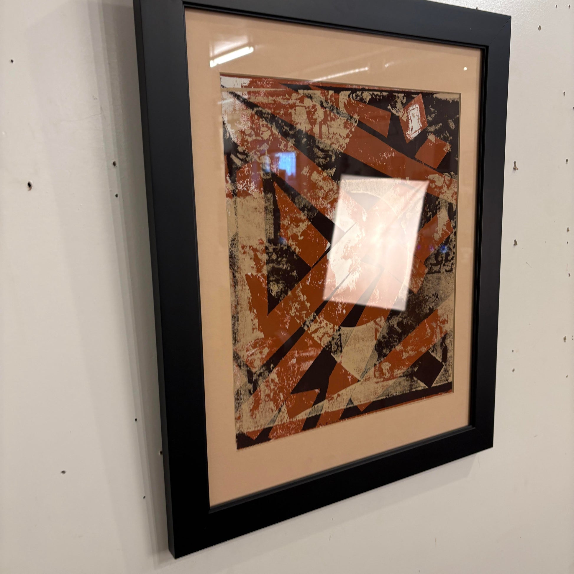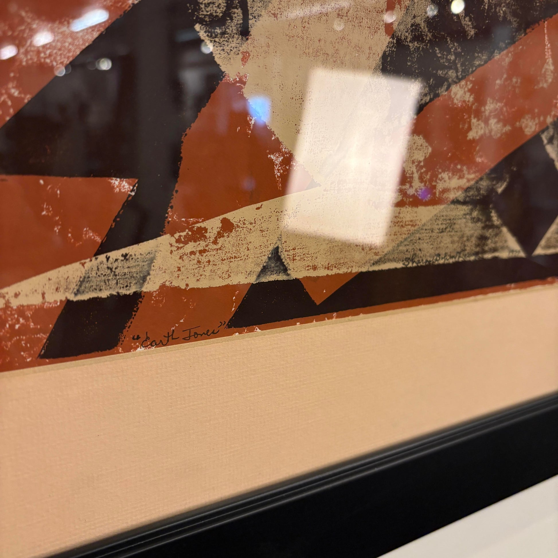 Framed and matted painting by Sharon Bohm Levy titled “earth tones” 1977.