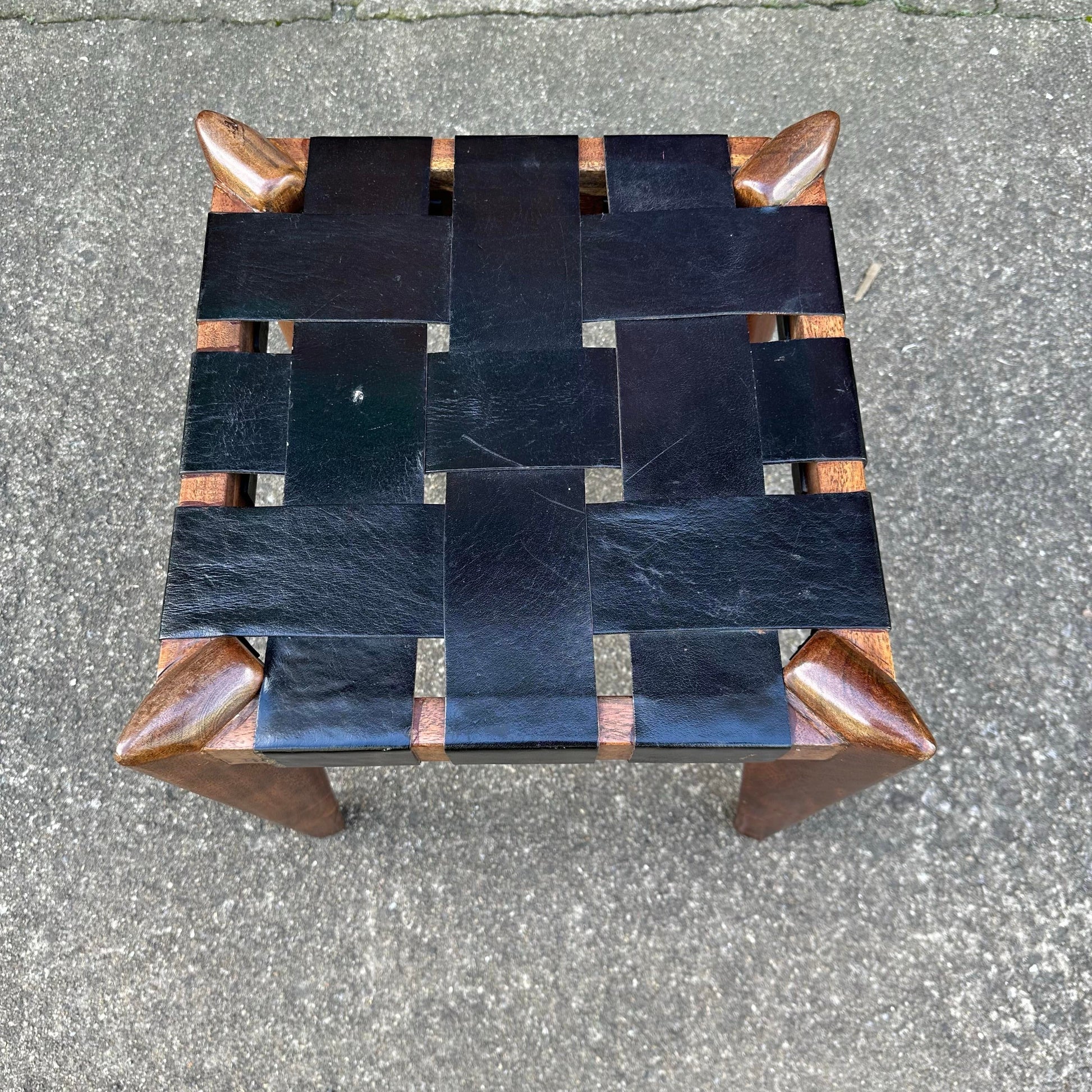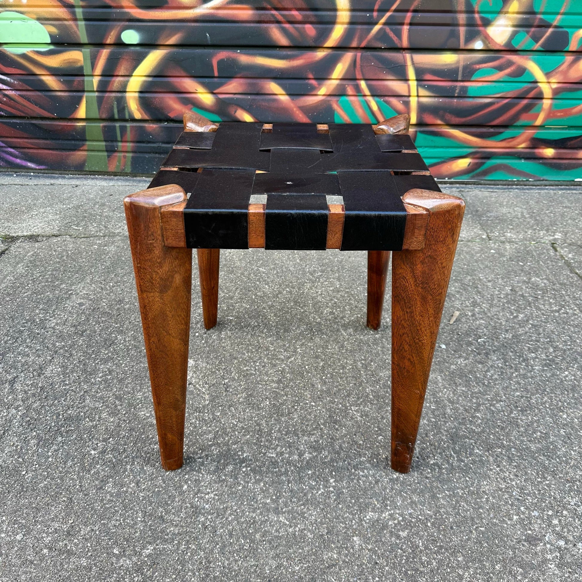 This stool has a woven black leather seat with angular tapered legs.
