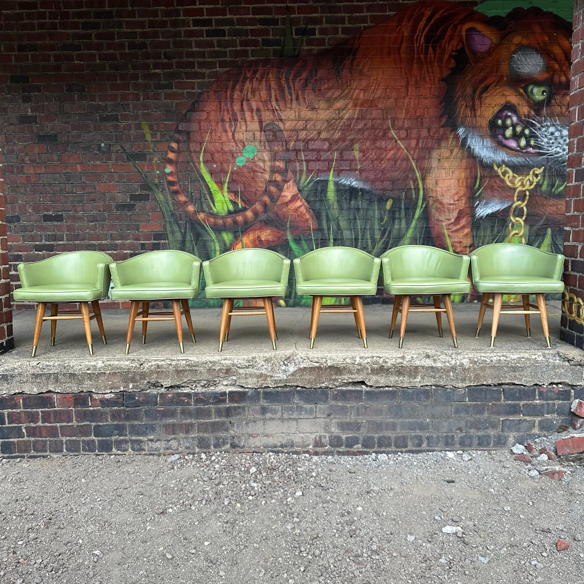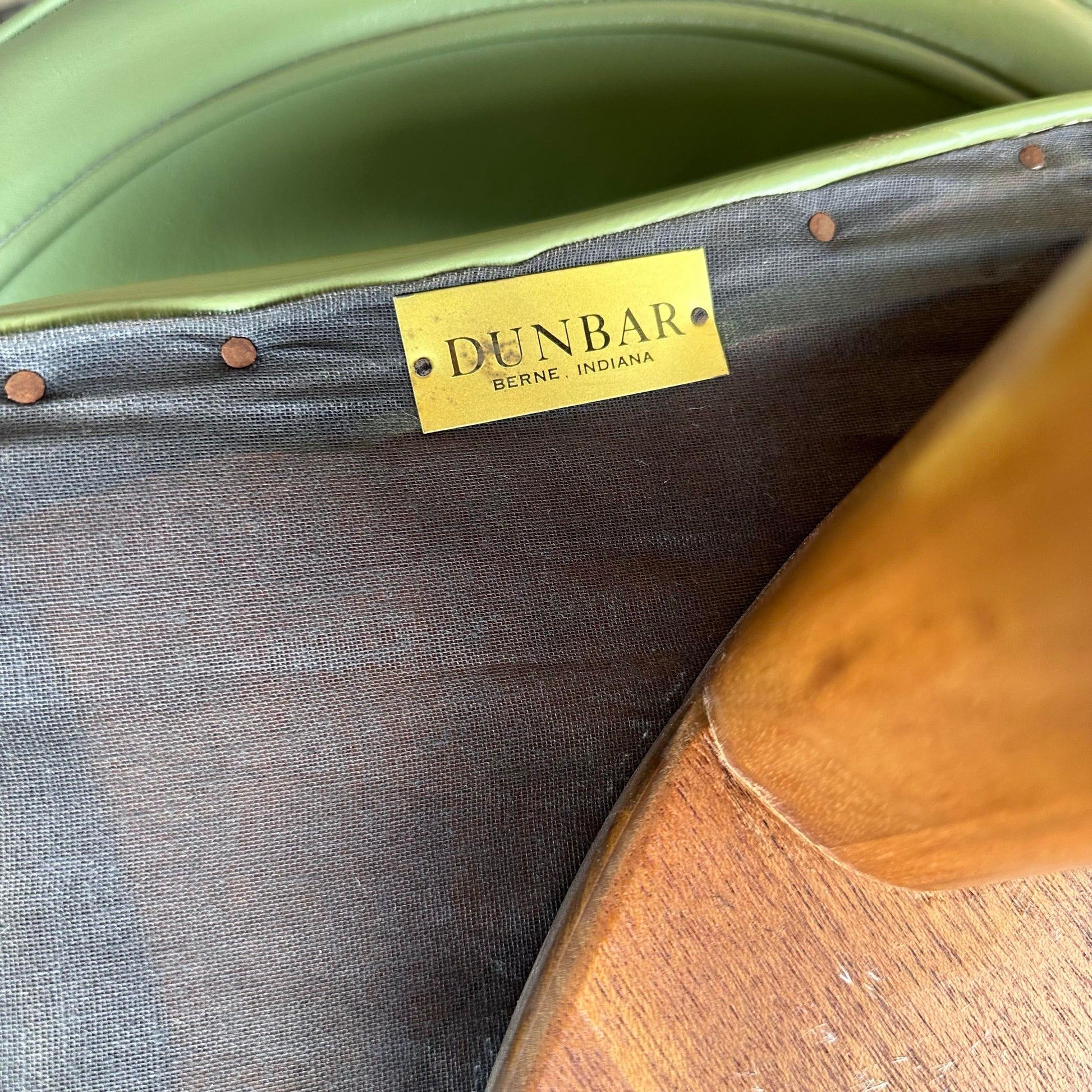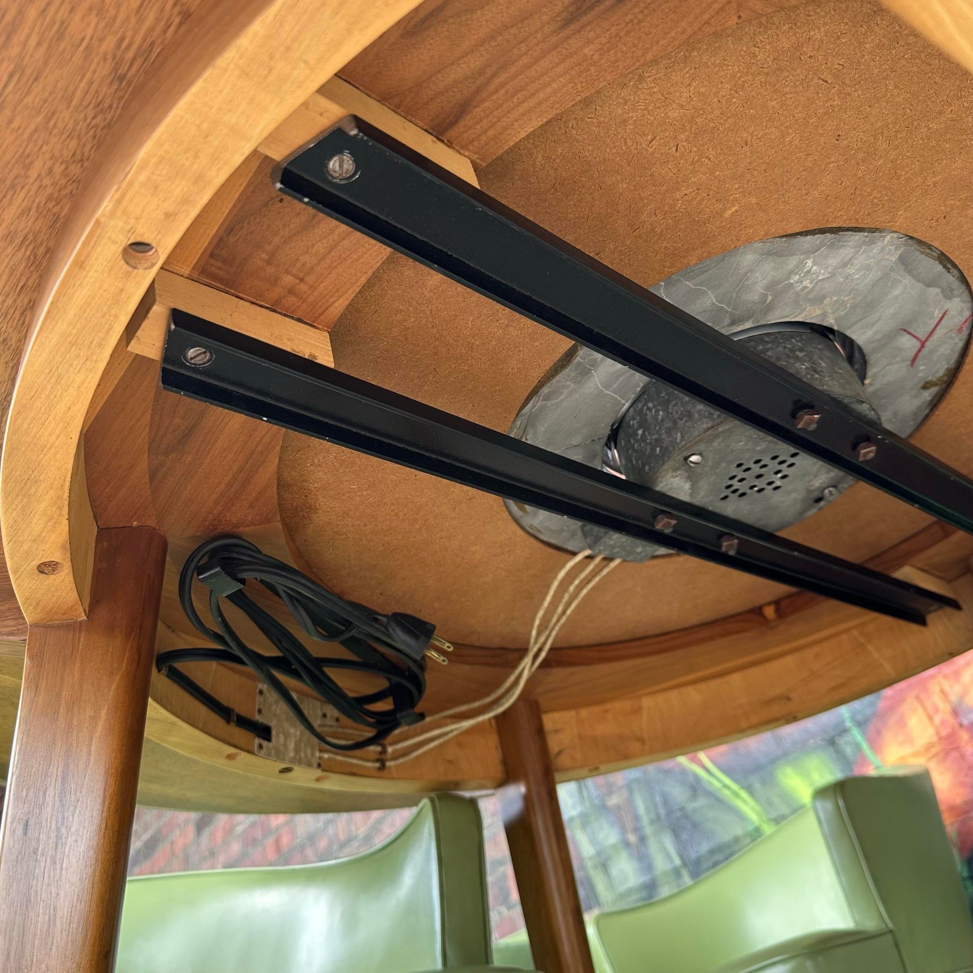 Very rare Edward Wormley for Dunbar dining set with working heated center that ranges from low, medium, and high. Perfect for keeping fondue/food warm. This set comes with 6 swivel chairs covered in a light green leather.