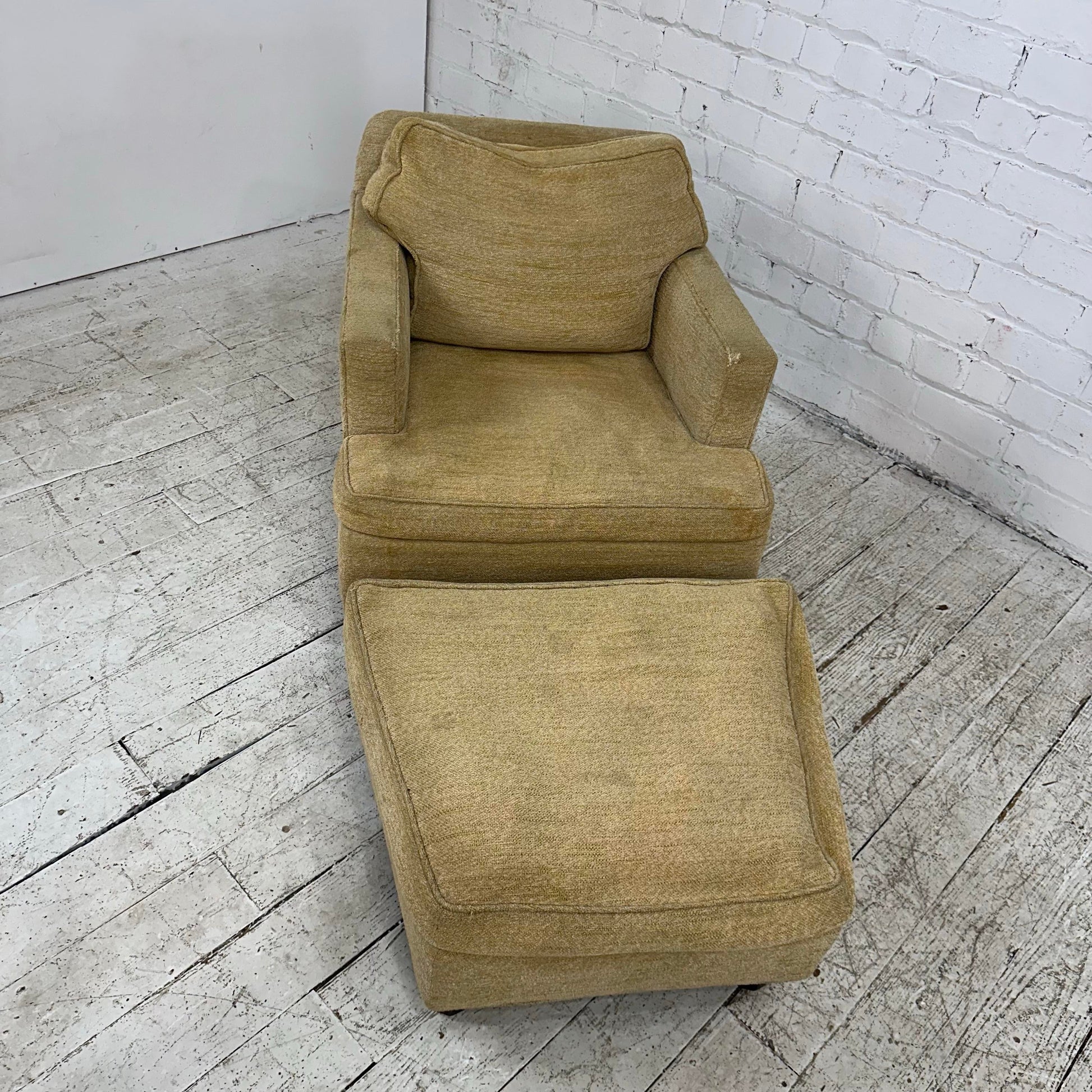 Mid century modern Edward Wormley for Dunbar Lounge Chair and Ottoman. This chair features a slubby gold fabric and dark stained hexagonal legs. The chair has wheels on the backside of the chair. We are unsure if the wheels are original.