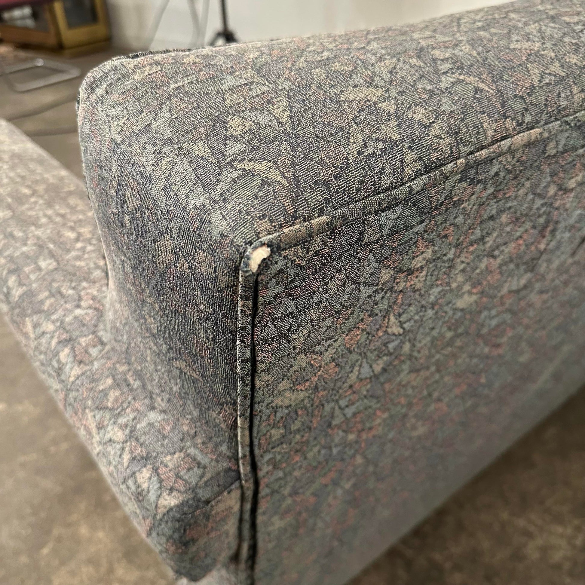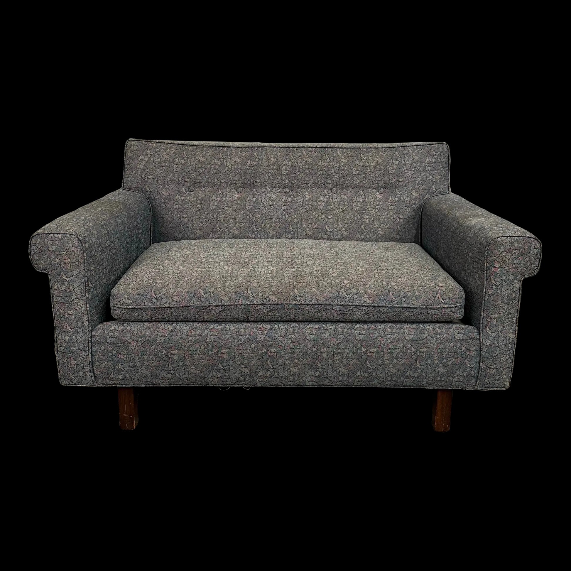 Mid century modern Edward Wormley for Dunbar Loveseat. This well made vintage sofa was designed by Edward Wormley in the 1950s and had been recovered in an abstract purple fabric. The legs are a solid sculpted walnut. We believe this was previously used at a college. There is no makers mark on the loveseat but we removed the dust cover on the bottom it it is clearly a Dunbar sofa