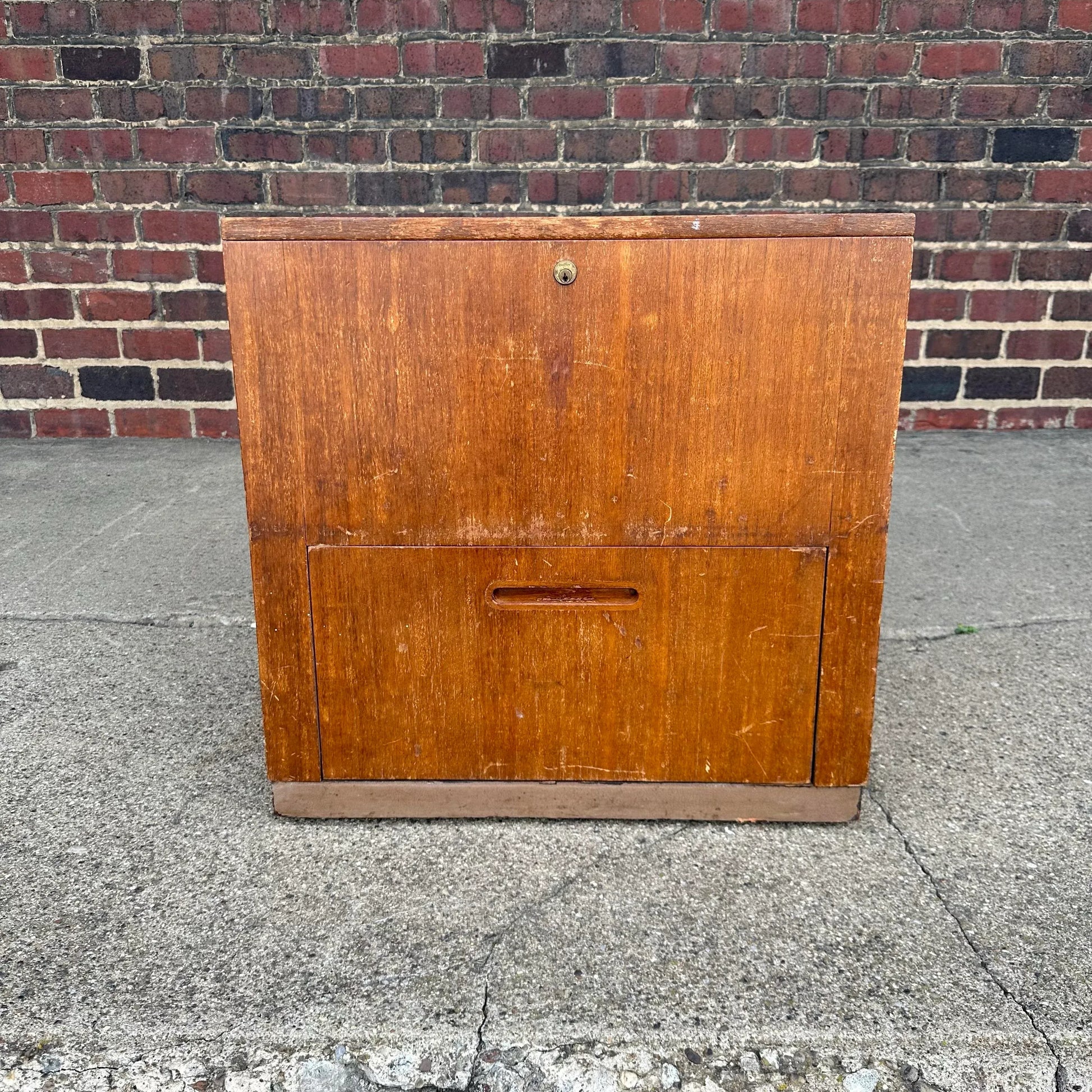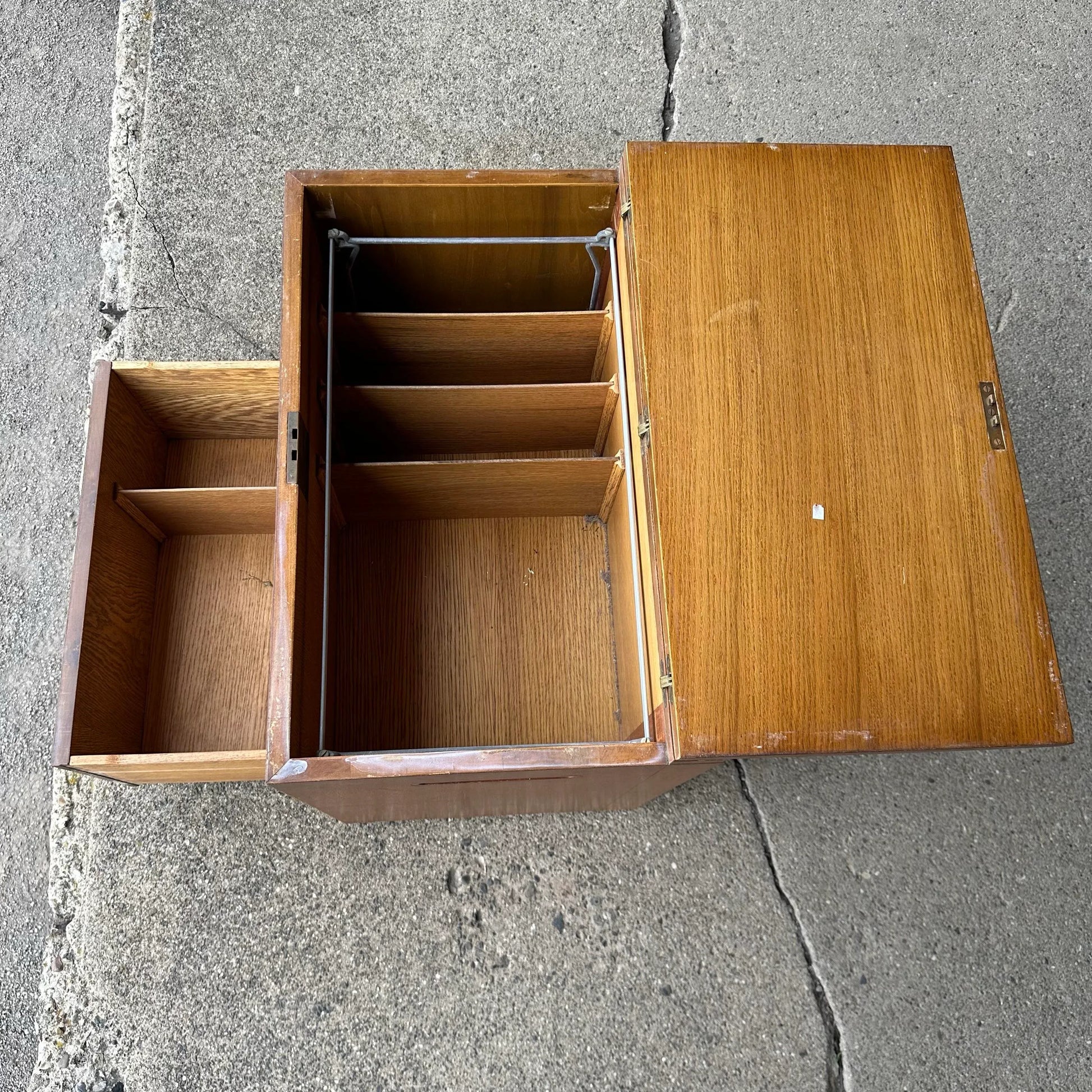 Designed by Edward Wormley for Dunbar, this petite file cabinet features one pull-out drawer and a top the lifts for the second storage space. There’s a beige leather trim that wraps around the bottom base. And the cabinet is in wheels to easily roll around