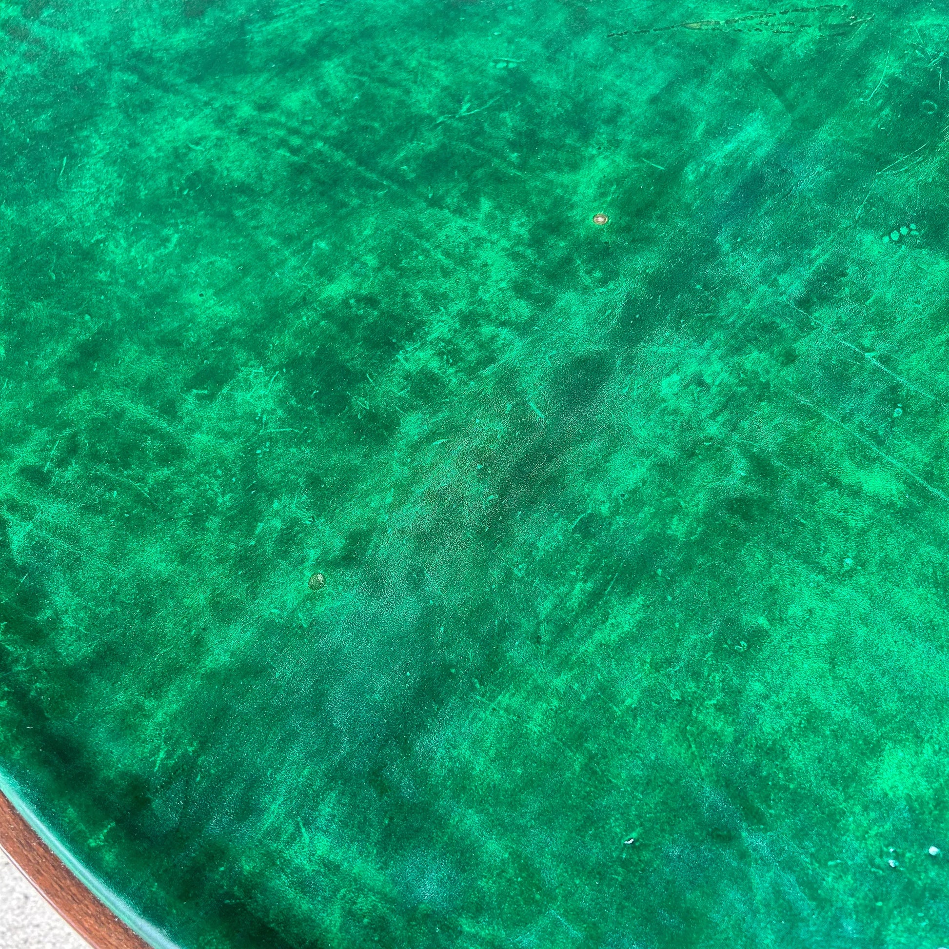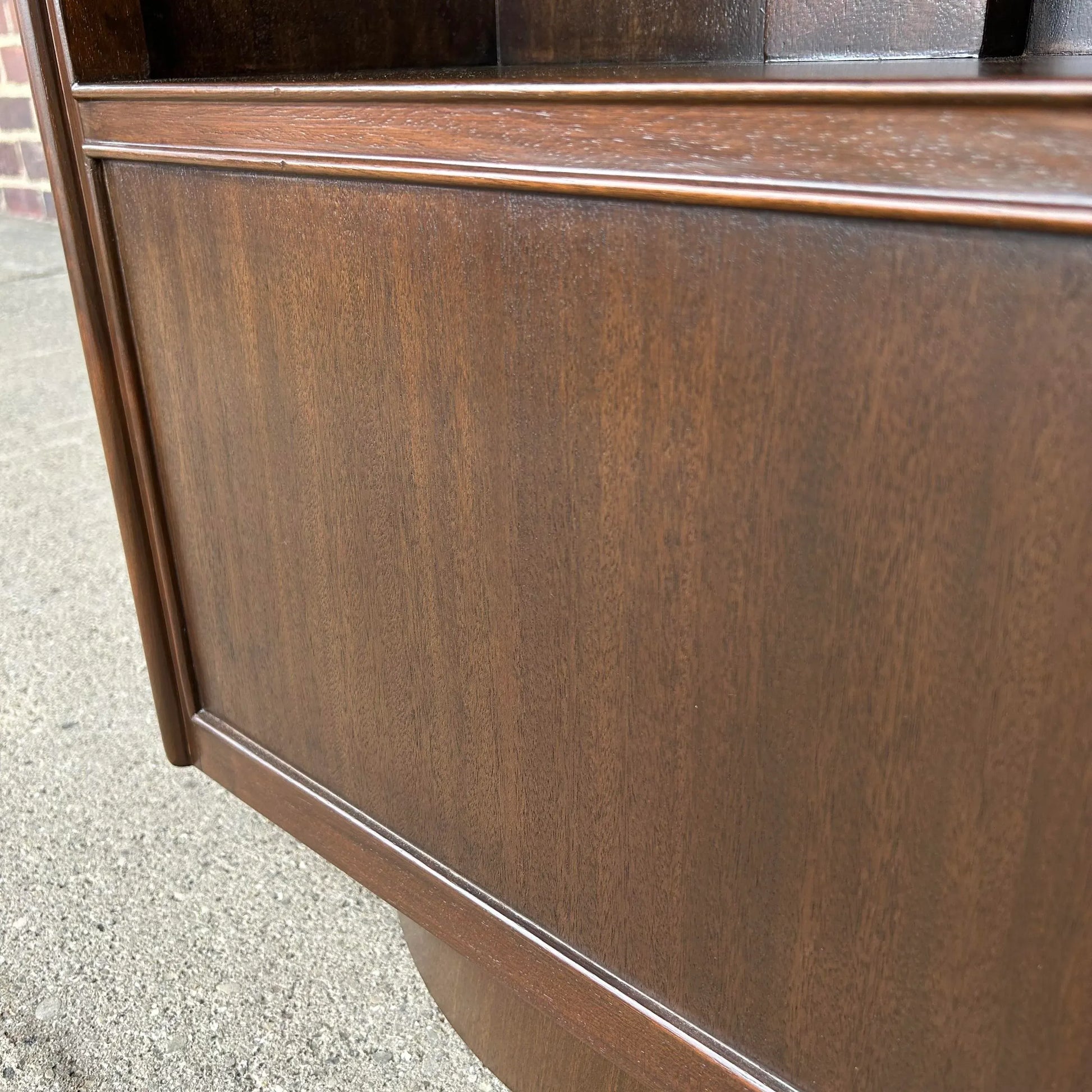 This Edward Wormley table sits a top a rotating base and has a beautifully patinaed leather wrapped top. The pedestal style base features cubbies for book storage perfect for a home office or conversational seating nook. The wood has all be professionally restored to new condition