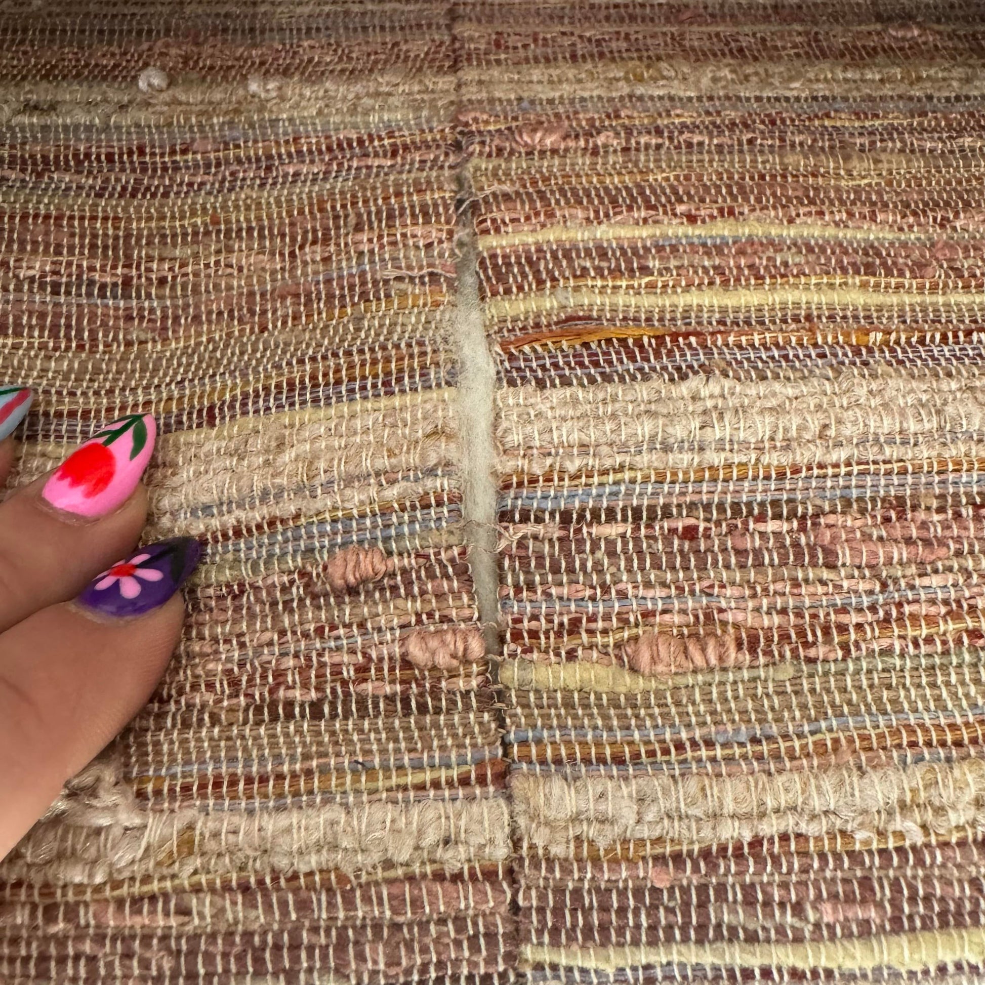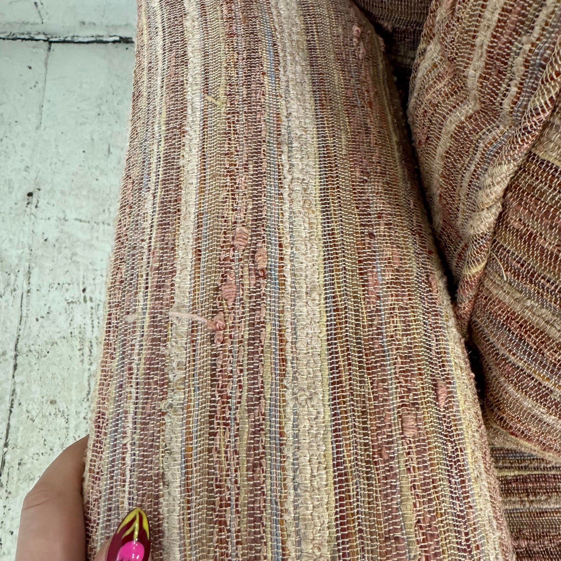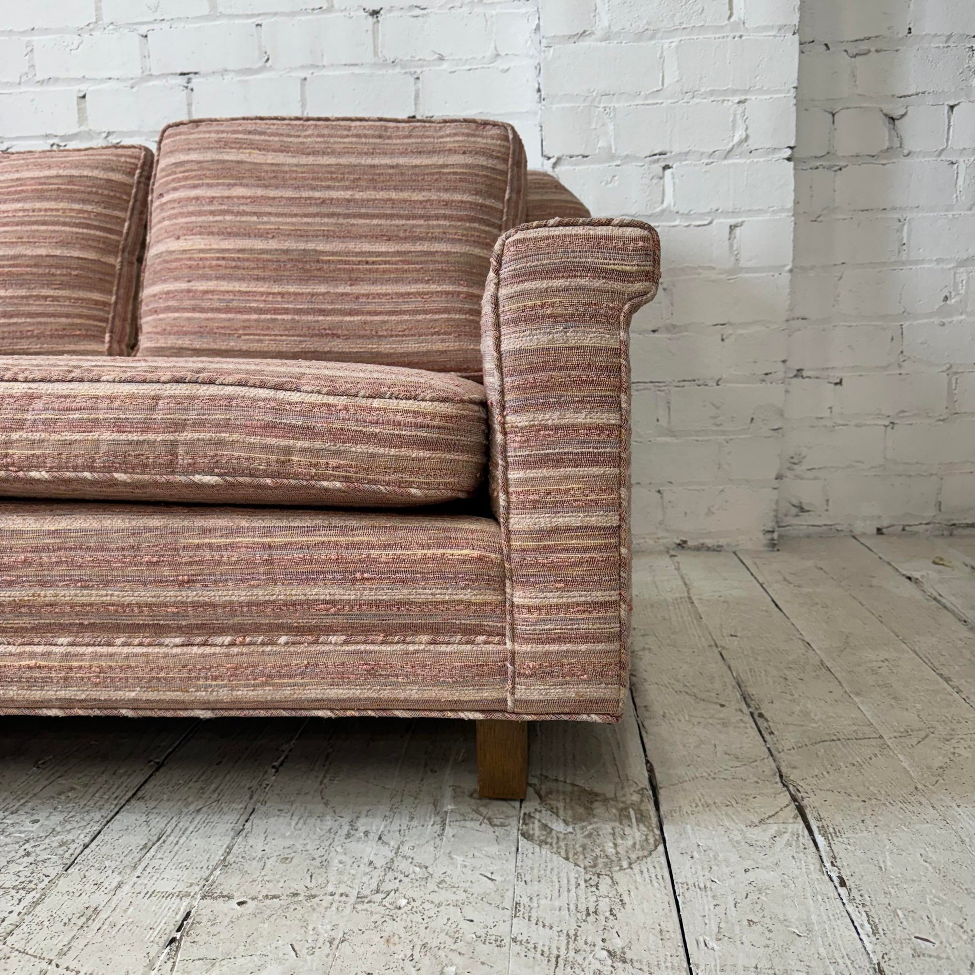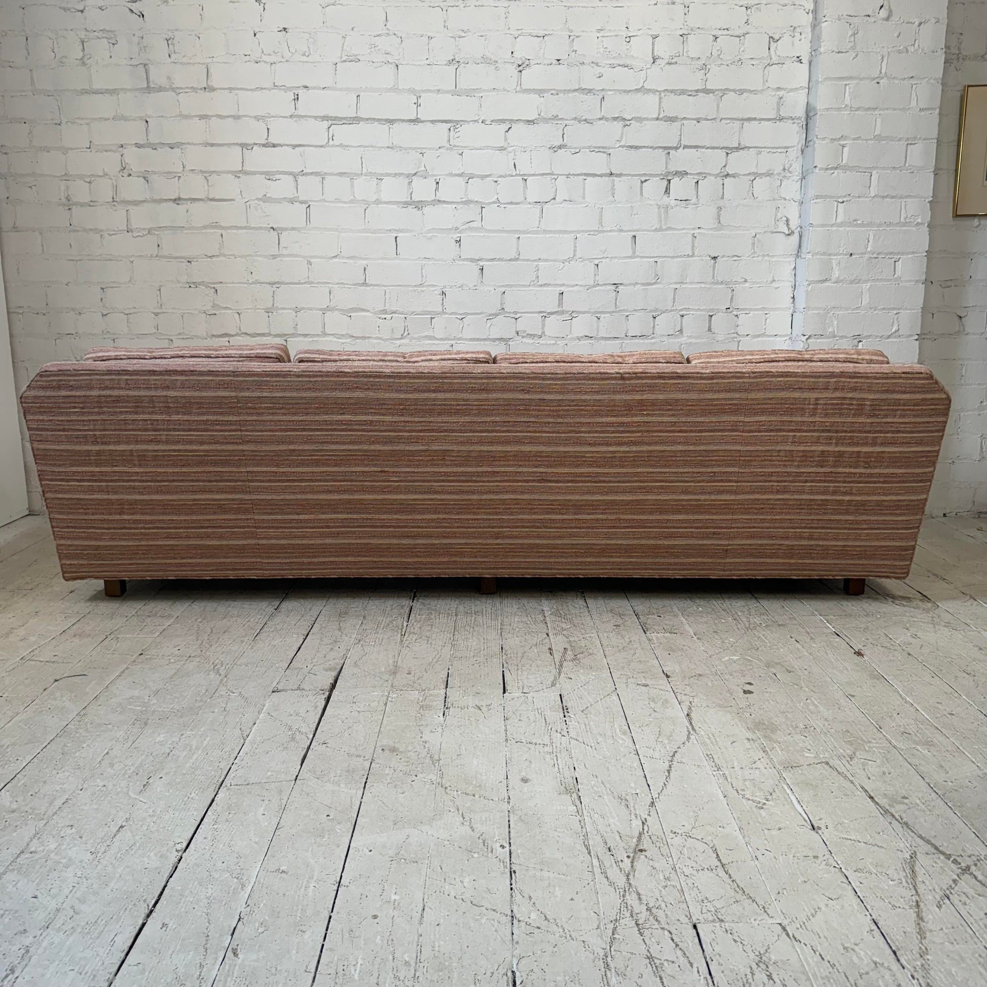 Designed by Edward Wormley for Dunbar, this sofa is well-built and features a great scale and comfortable design. The current fabric features a tonal pink stripping with touches of blue, orange, and yellow threading. The legs are a mid-dark toned walnut.