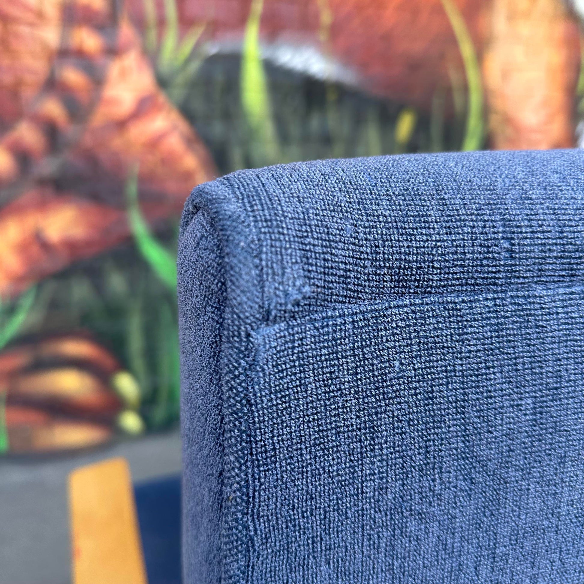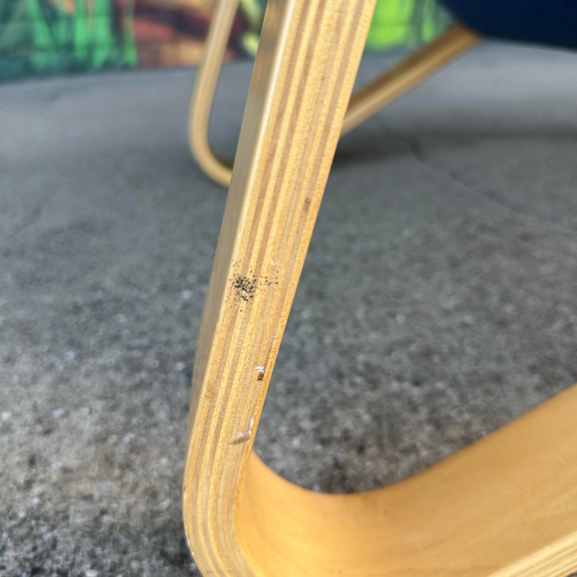 Grasshopper chair designed by Eero Saarinen for Knoll in a blue fabric with light wooden legs/base.