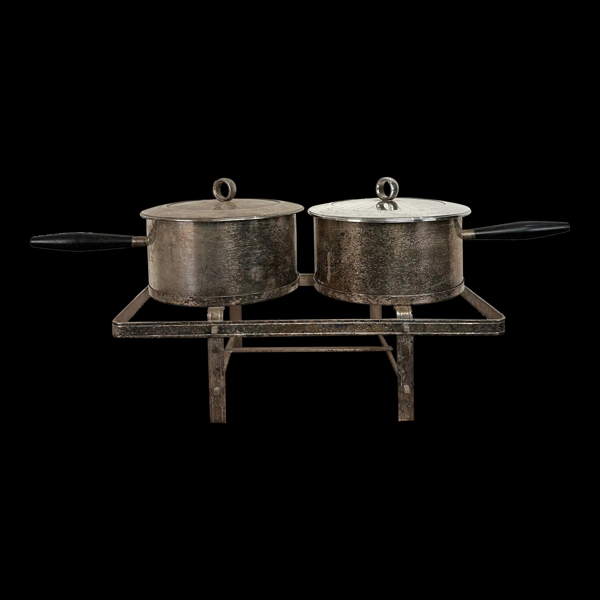 A fabulous example of Georges Briard’s “El Dorado” line for English Manufacturing. These pieces are made of English silver. Included is a serving stand, two pots and two lids.