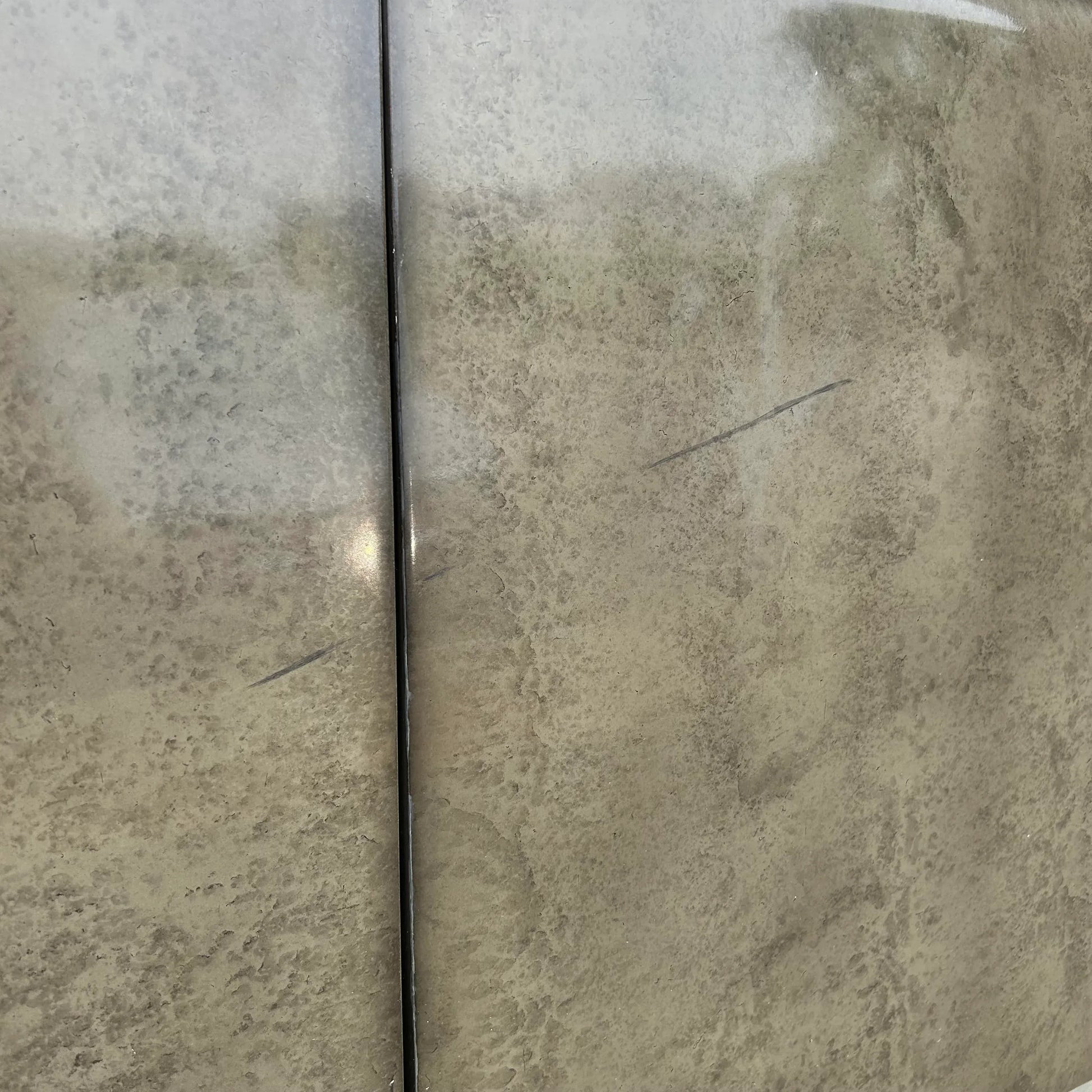 Faux marble laminate wrapped cabinet with storage inside. The doors on the front open to reveal shelving, as well as one pull out drawer.