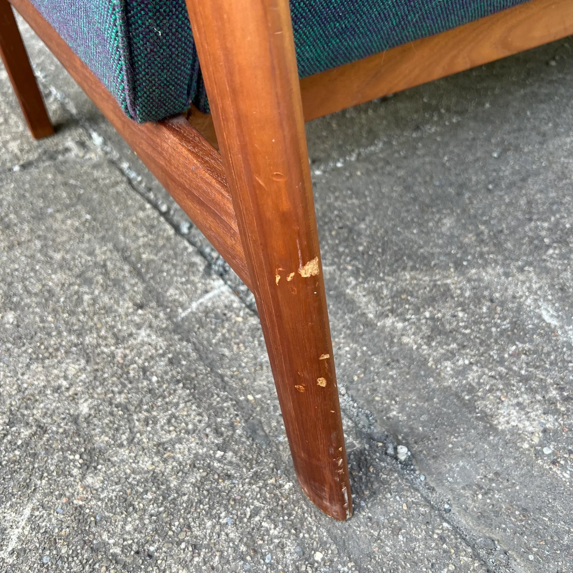 Finn Juhl Danish teak Jupiter Sofa. This petite teak sofa feature excellent angles and curves. It is currently covered in a blue/purple fabric, but would benefit from reupholstery due to the foam being in rough shape.