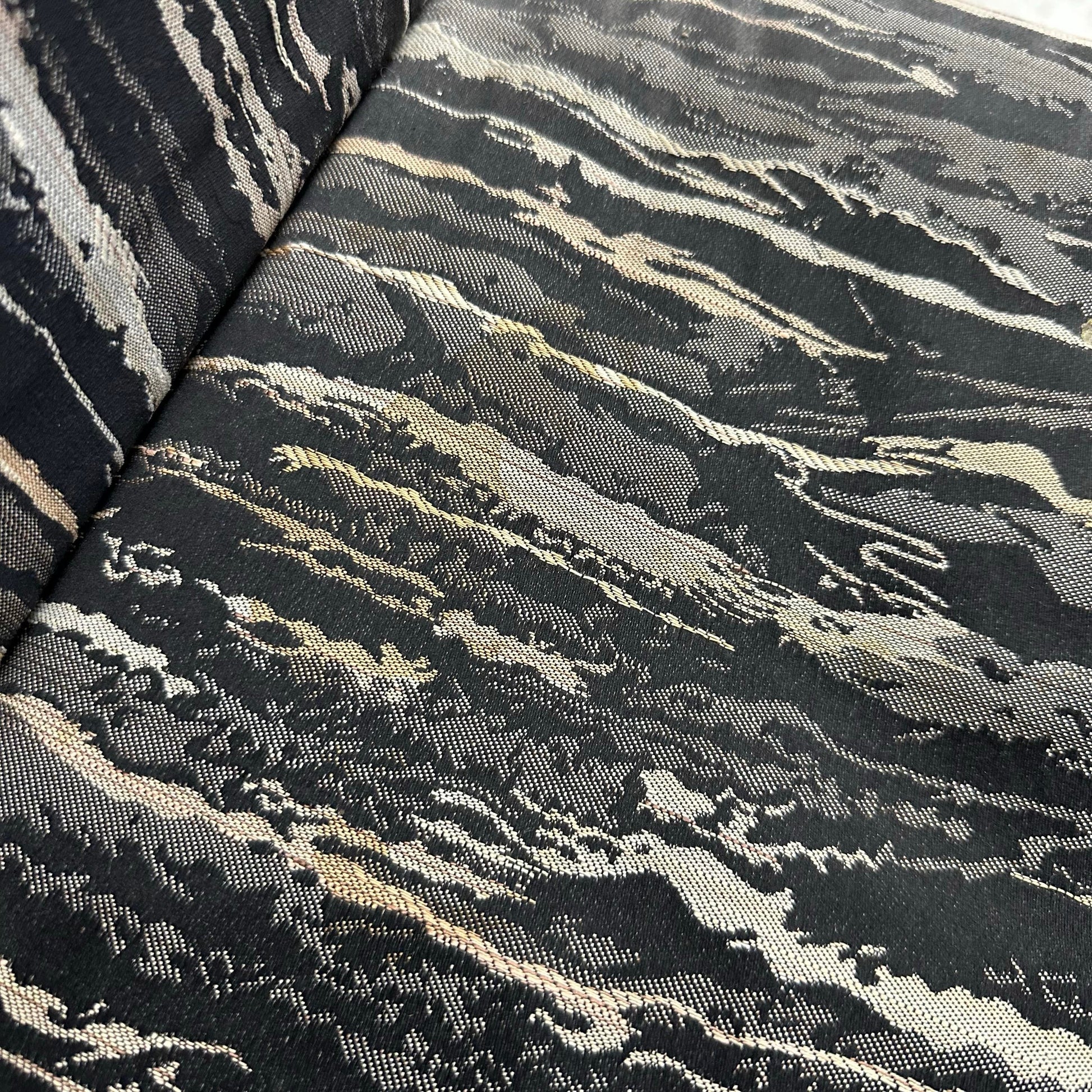 This set features 4 flat bar cantilevered brass arm chairs with an abstract black upholstered seat. The brass base features a half moon design and a circular glass top. This base is modular.