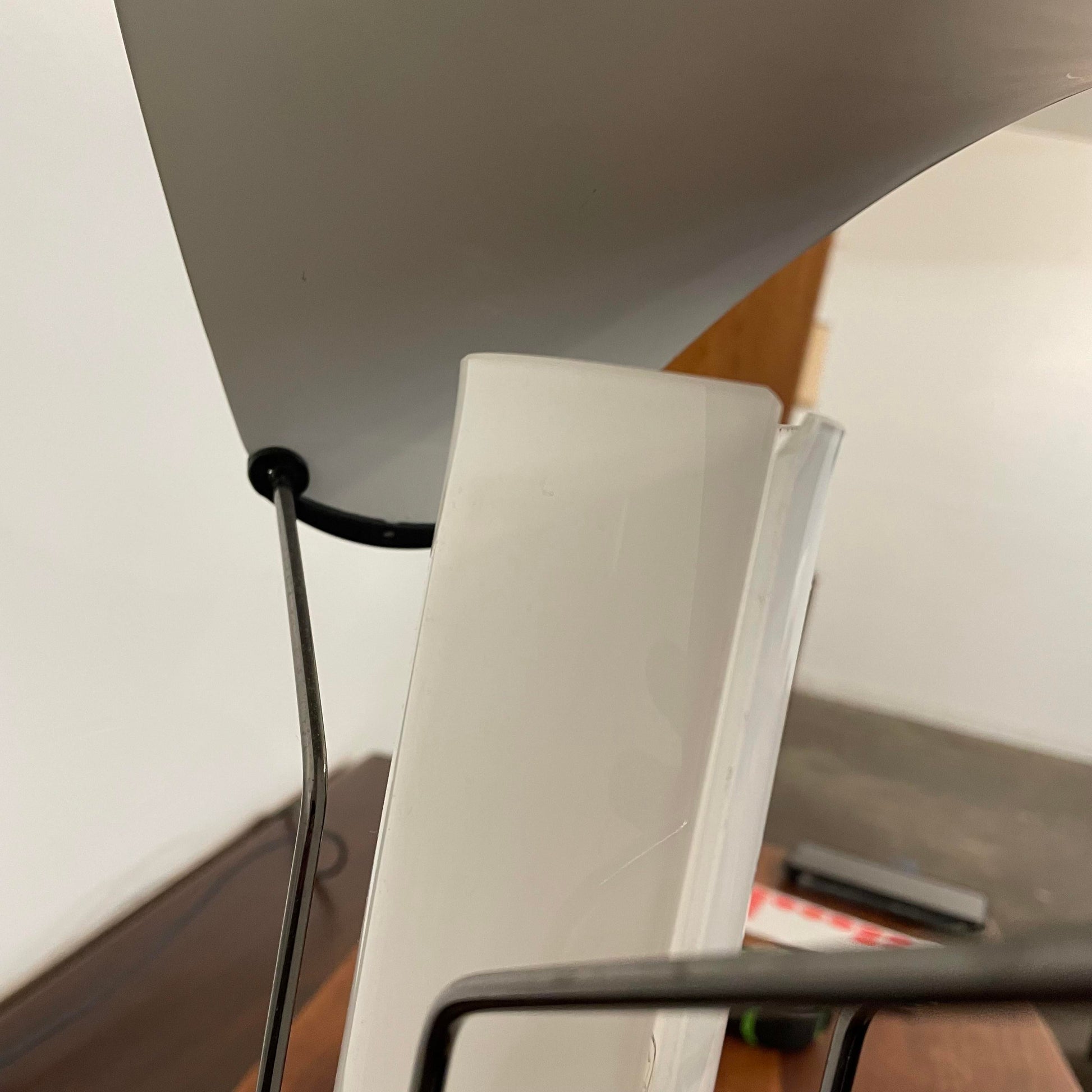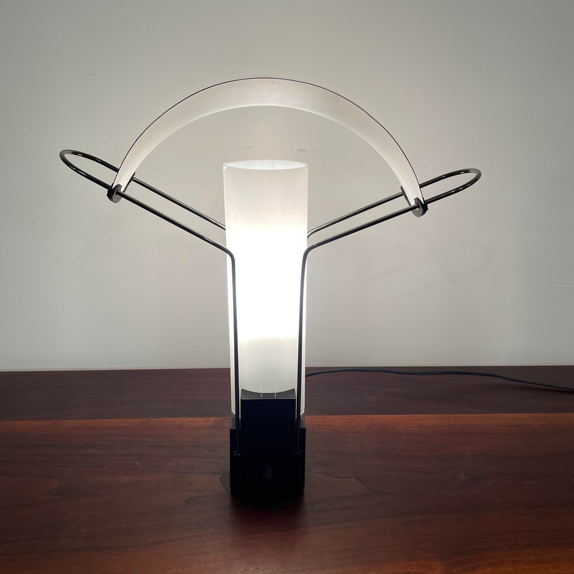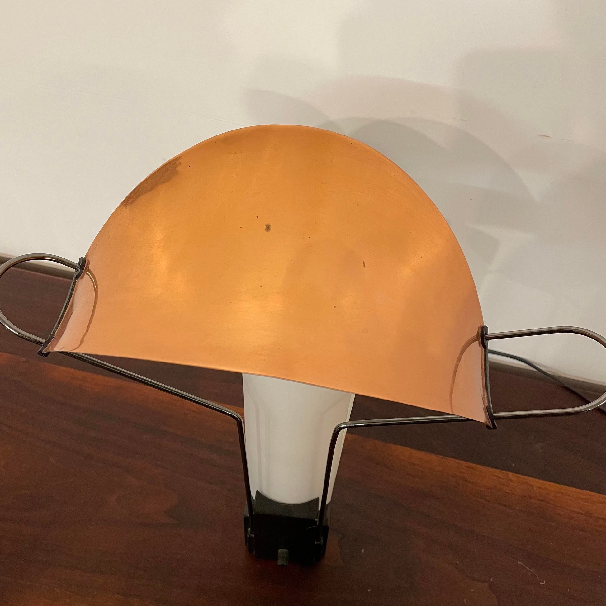 Italian Vintage Copper and Glass Table Lamp by Arteluce Palio. This design features a copper arched shade with two pieces of white glass down the center to diffuse light. The pieces of glass can be removed. Makers mark is located on bottom of lamp.