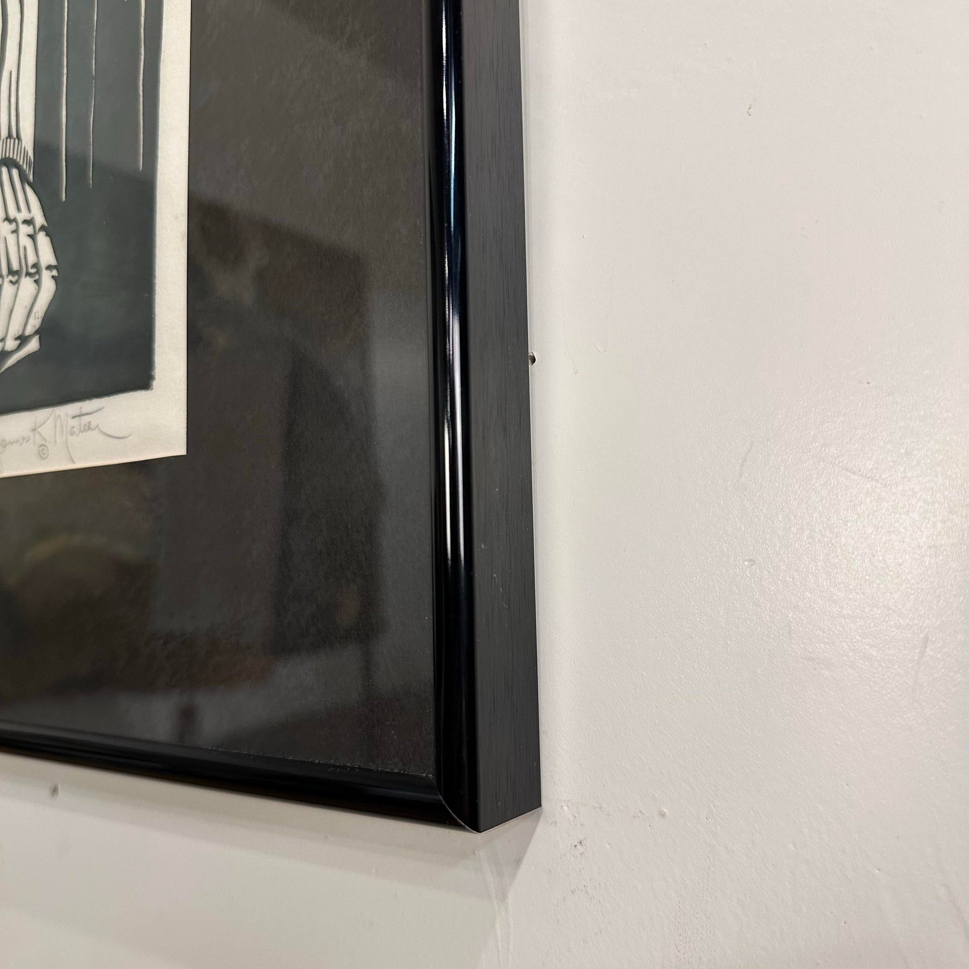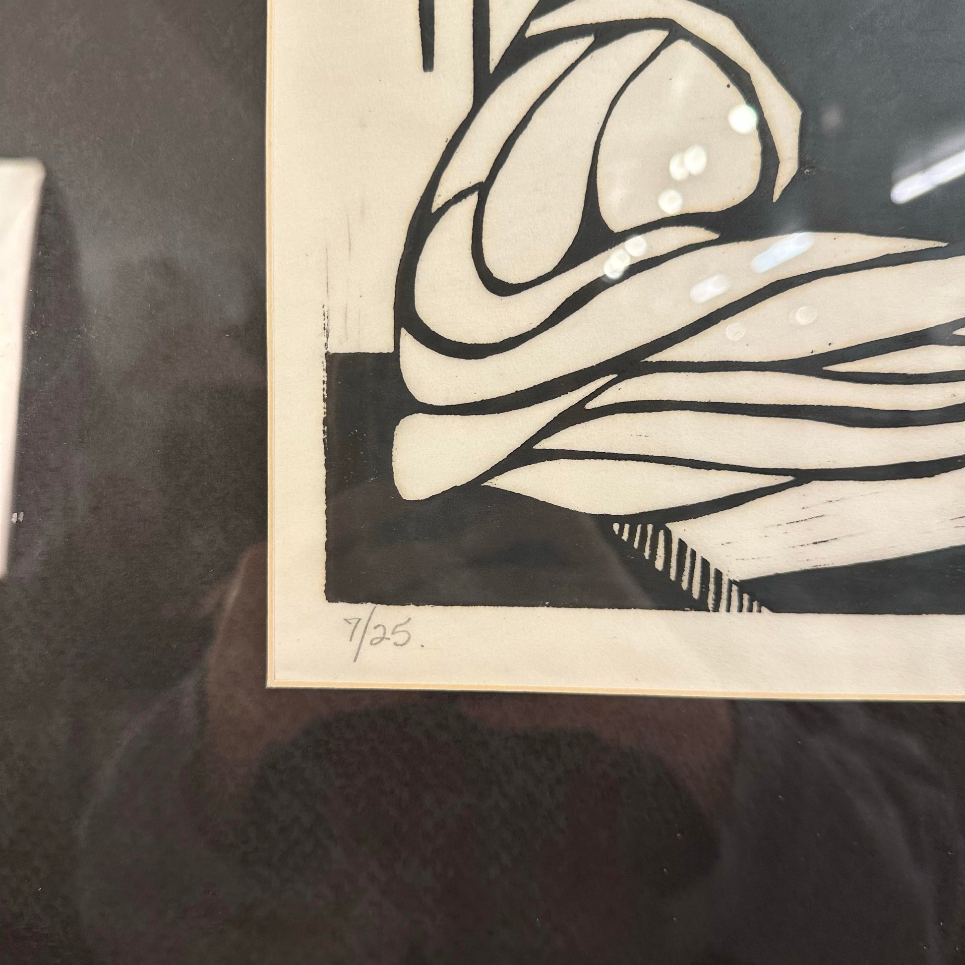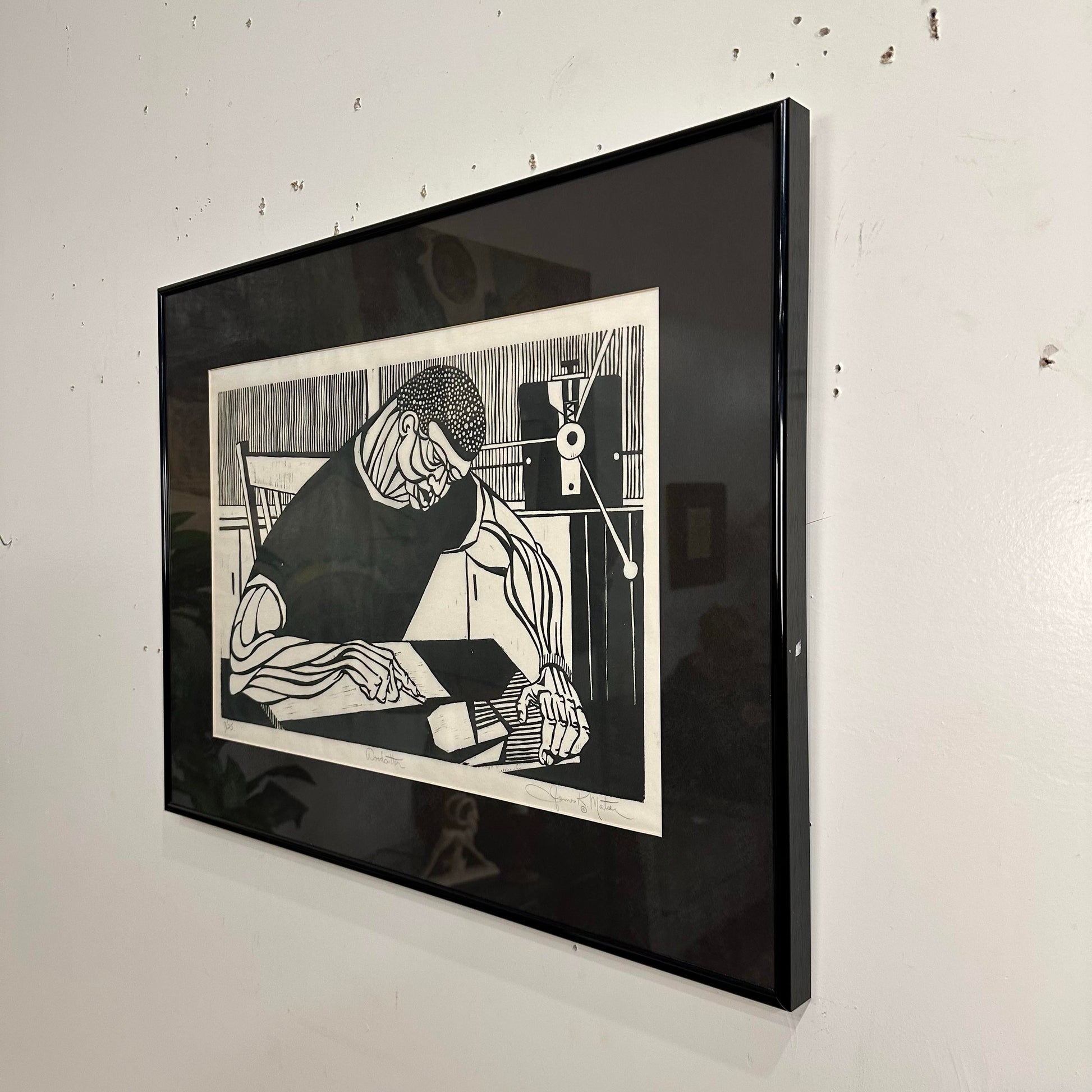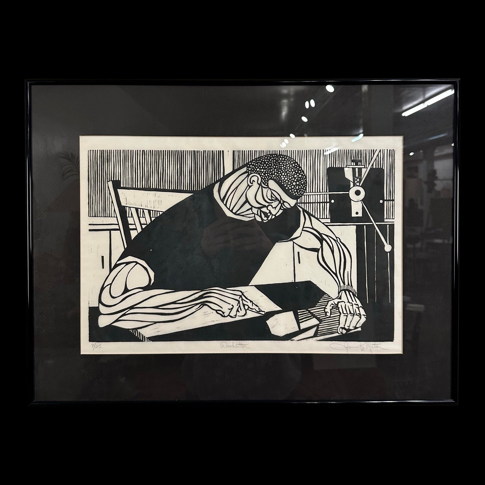 Relief print by James Mateer titled "Wood Cutter" numbered 7 of 25. This piece is depicting an artist carving a block print. Presumably this is a self portrait of the artist. James Mateer was a Cleveland, OH artist who graduated from Cleveland Institute of Art and passed in 2011.