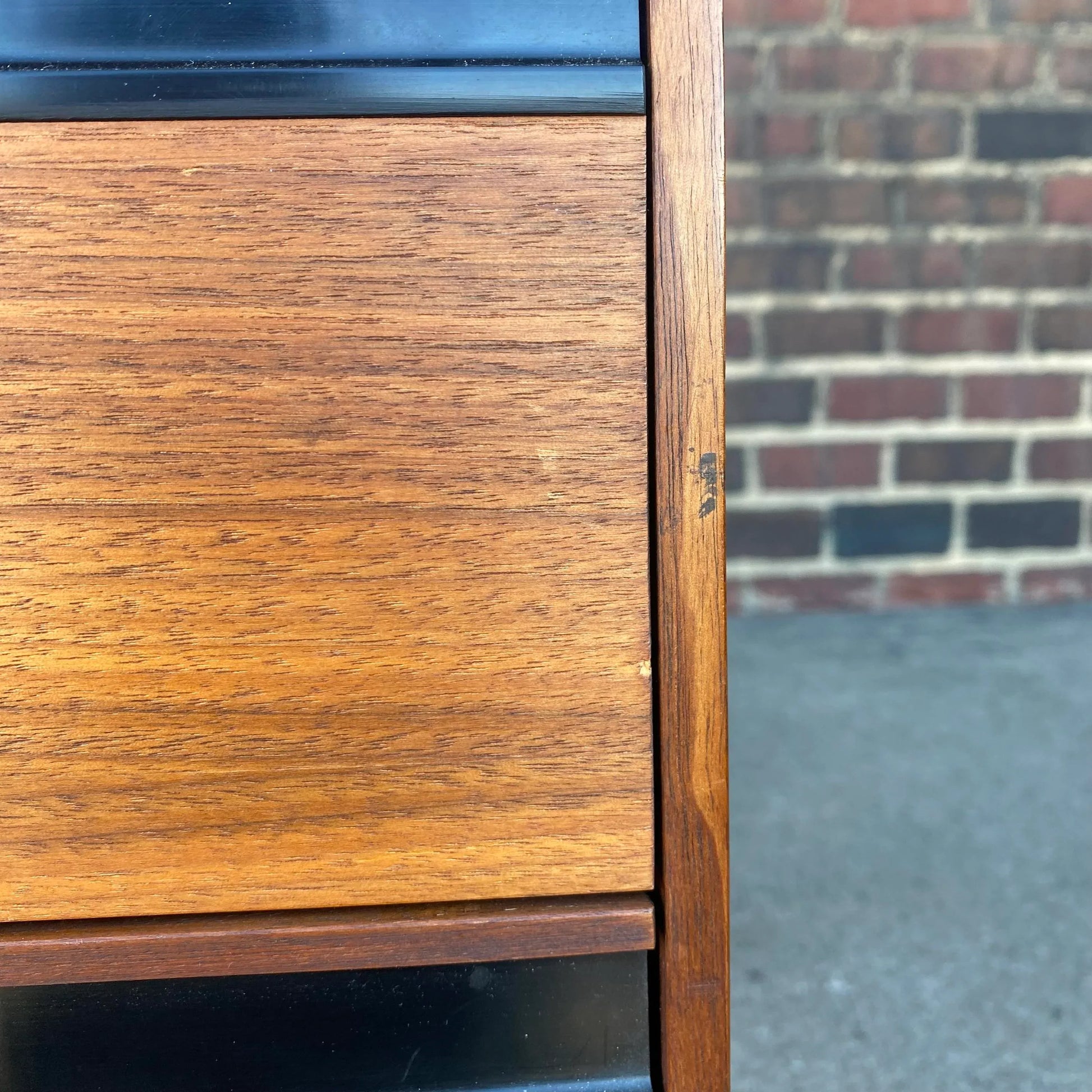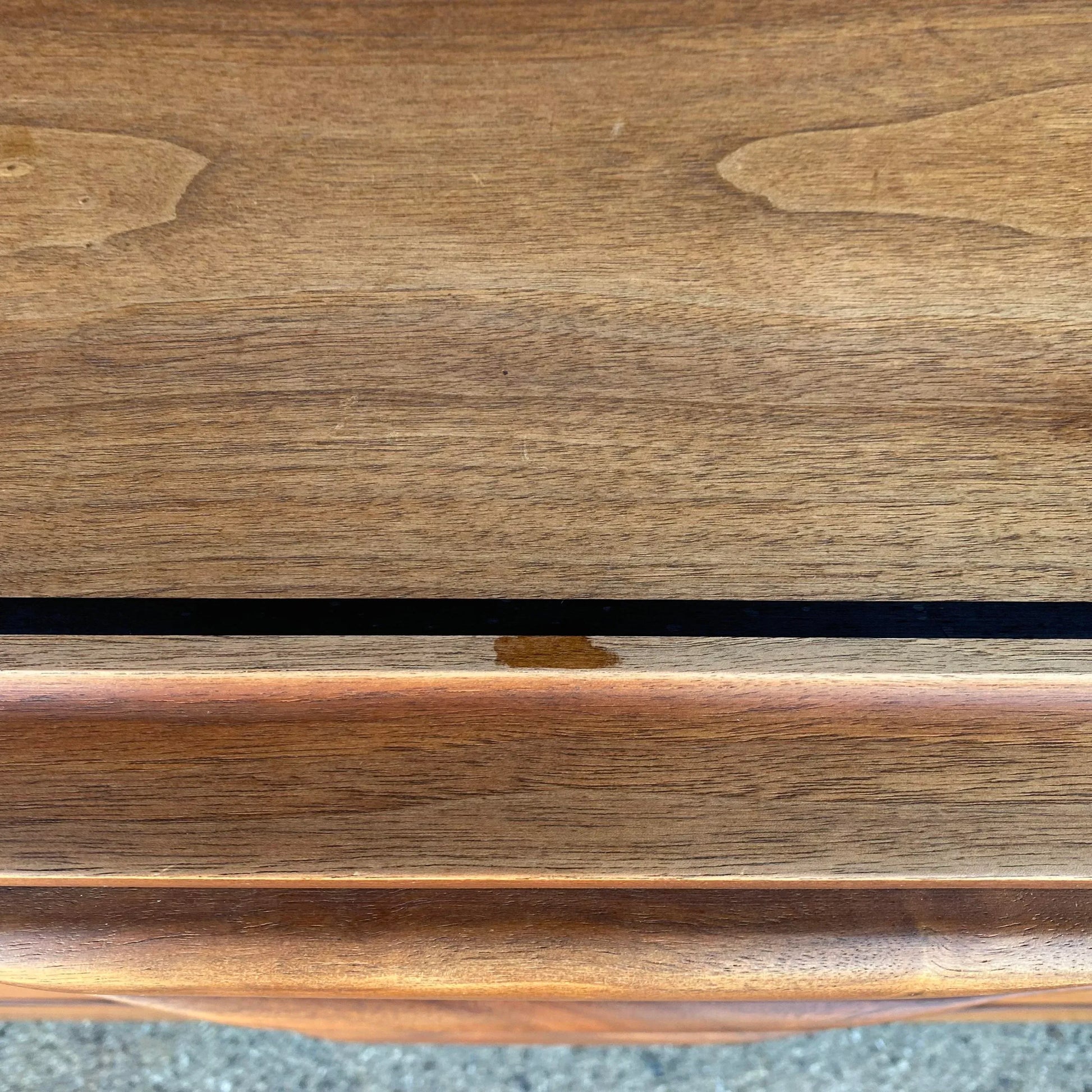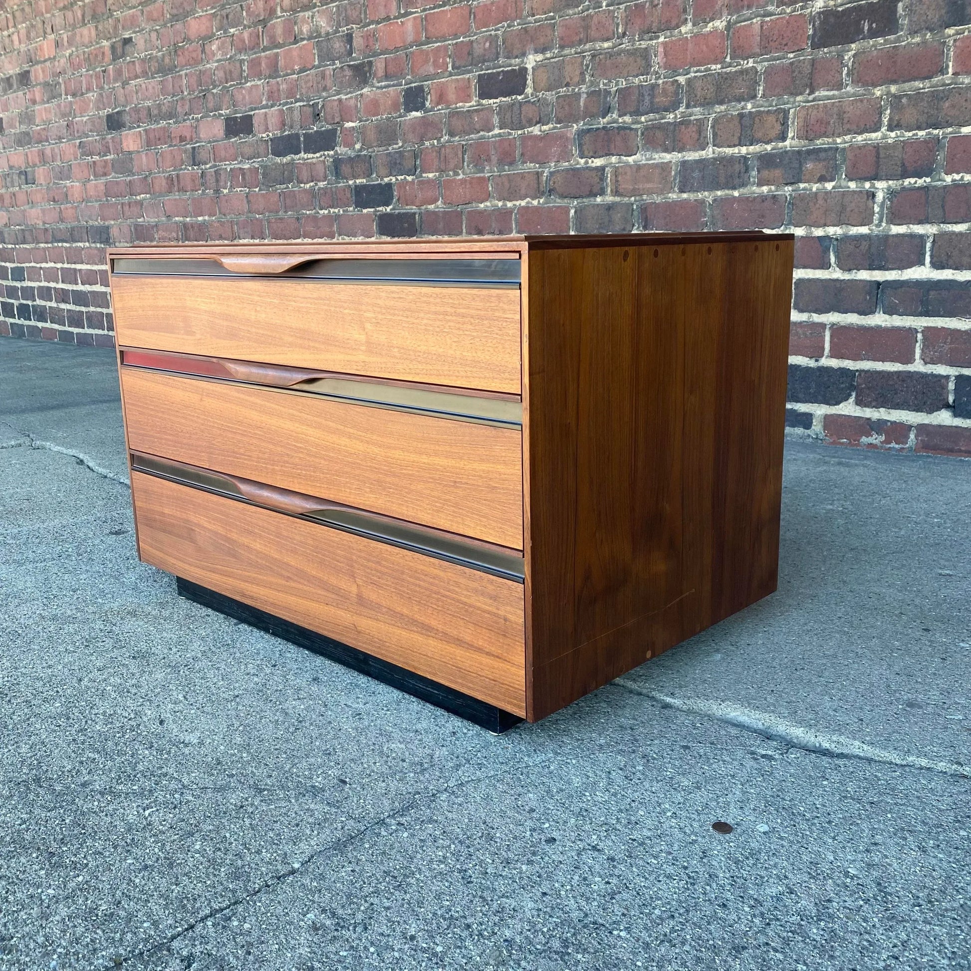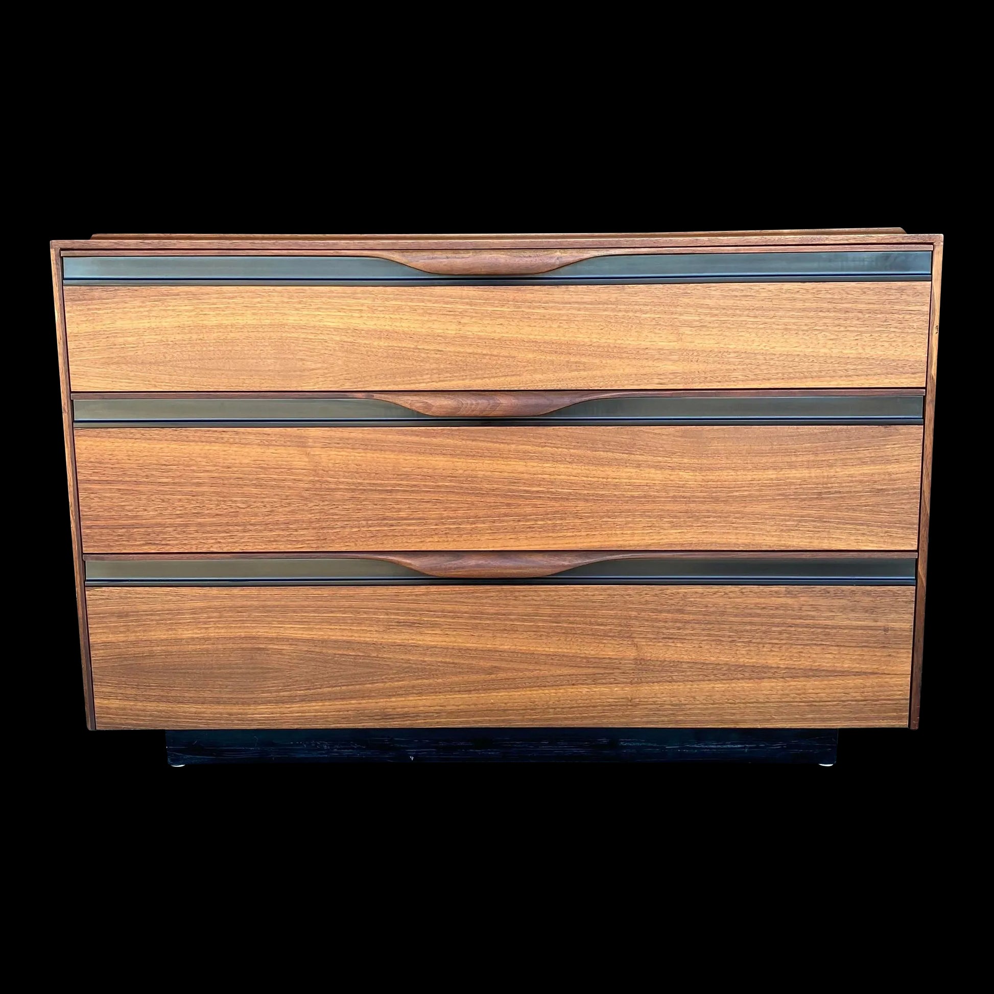 This chest of drawers, designed by John Kapel for Glenn of California is made of walnut with clean, long lines and features an inlayed black trim on the top. There are three drawers with black trim and beautifully curved drawer pulls.