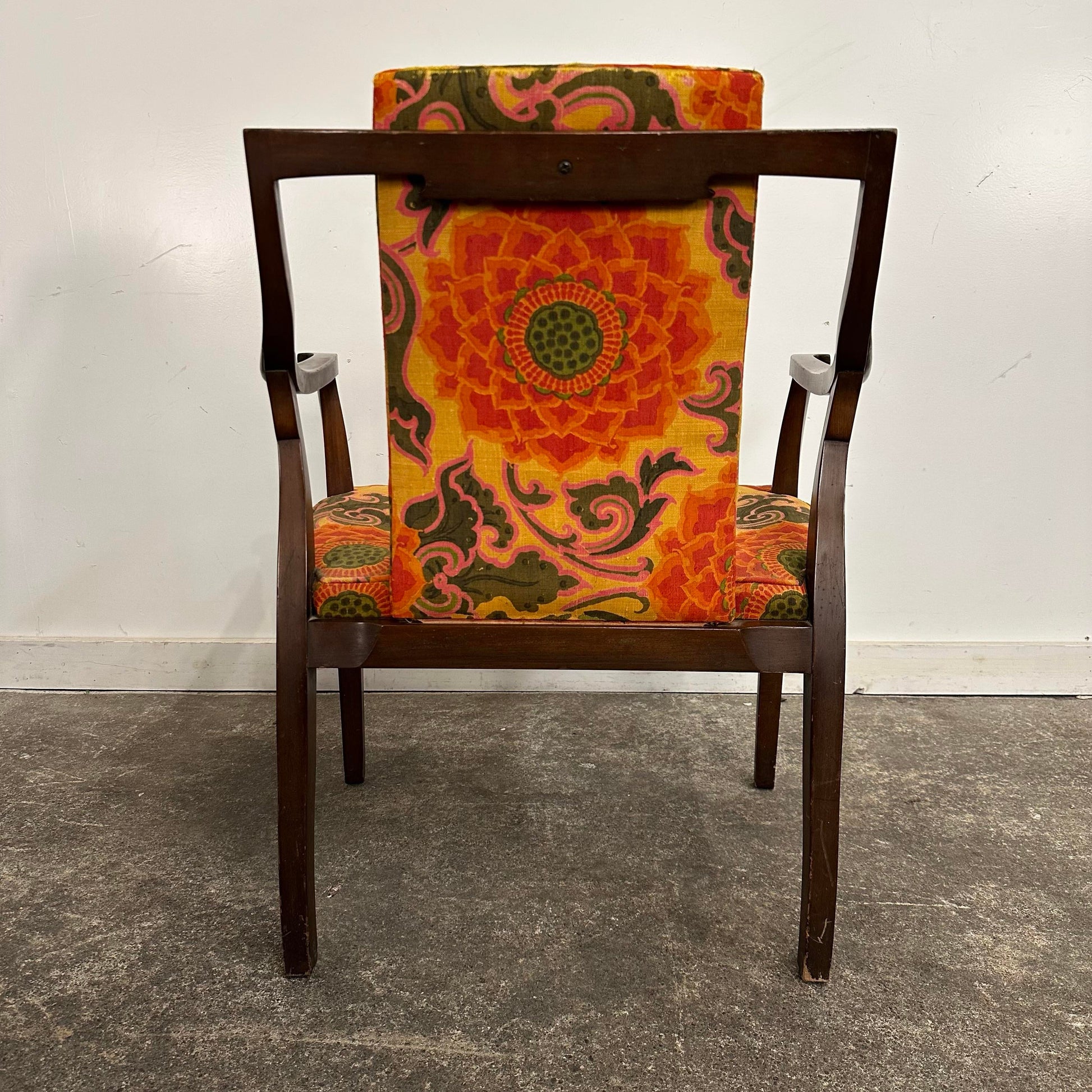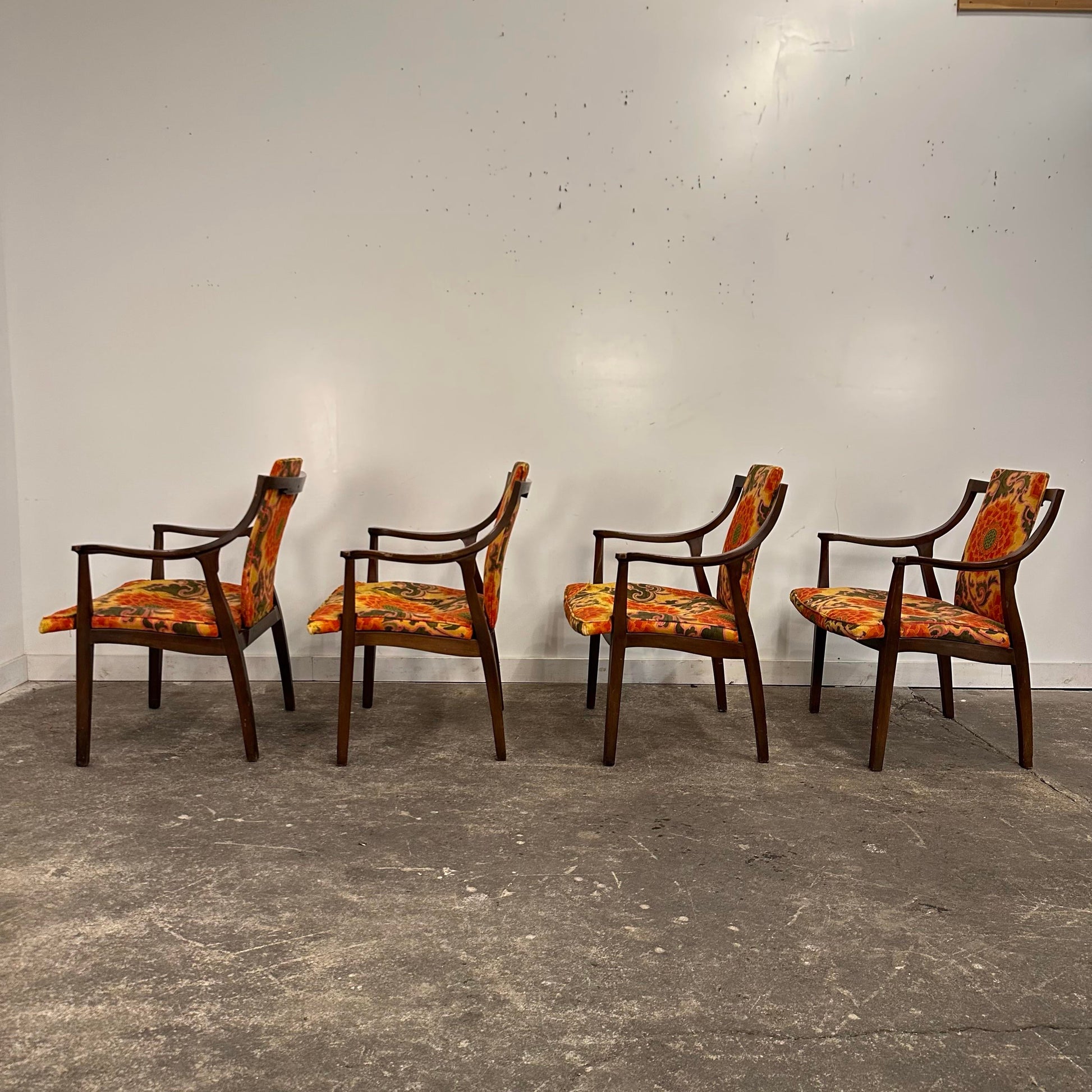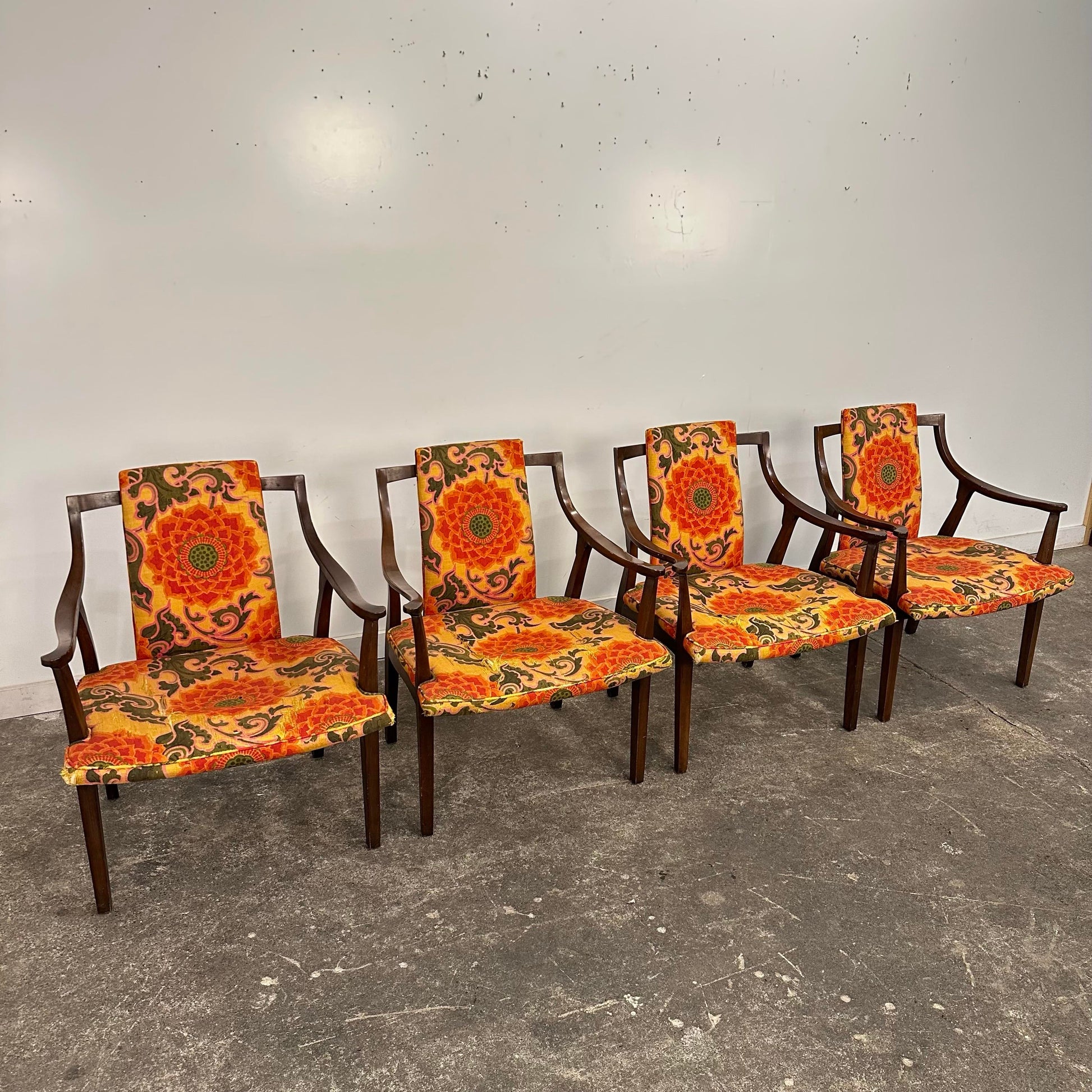 Set of 4 mid-century modern dining chairs by John Widdicomb. There is a very nice curvature to the chairs arms and back. These are currently covered in a lovely and vibrant floral pattern with yellow, orange, red, and green. There is no makers mark on the chairs.