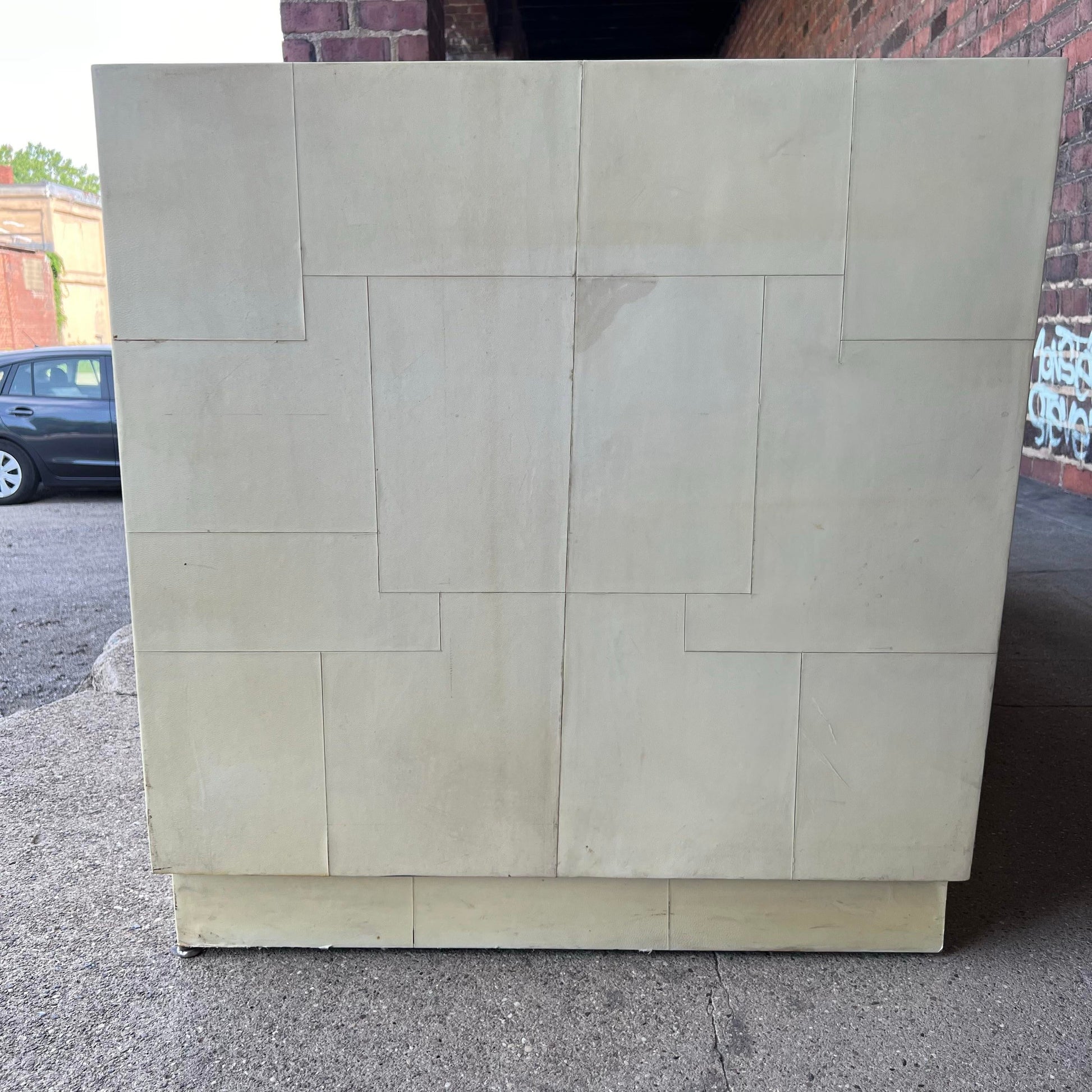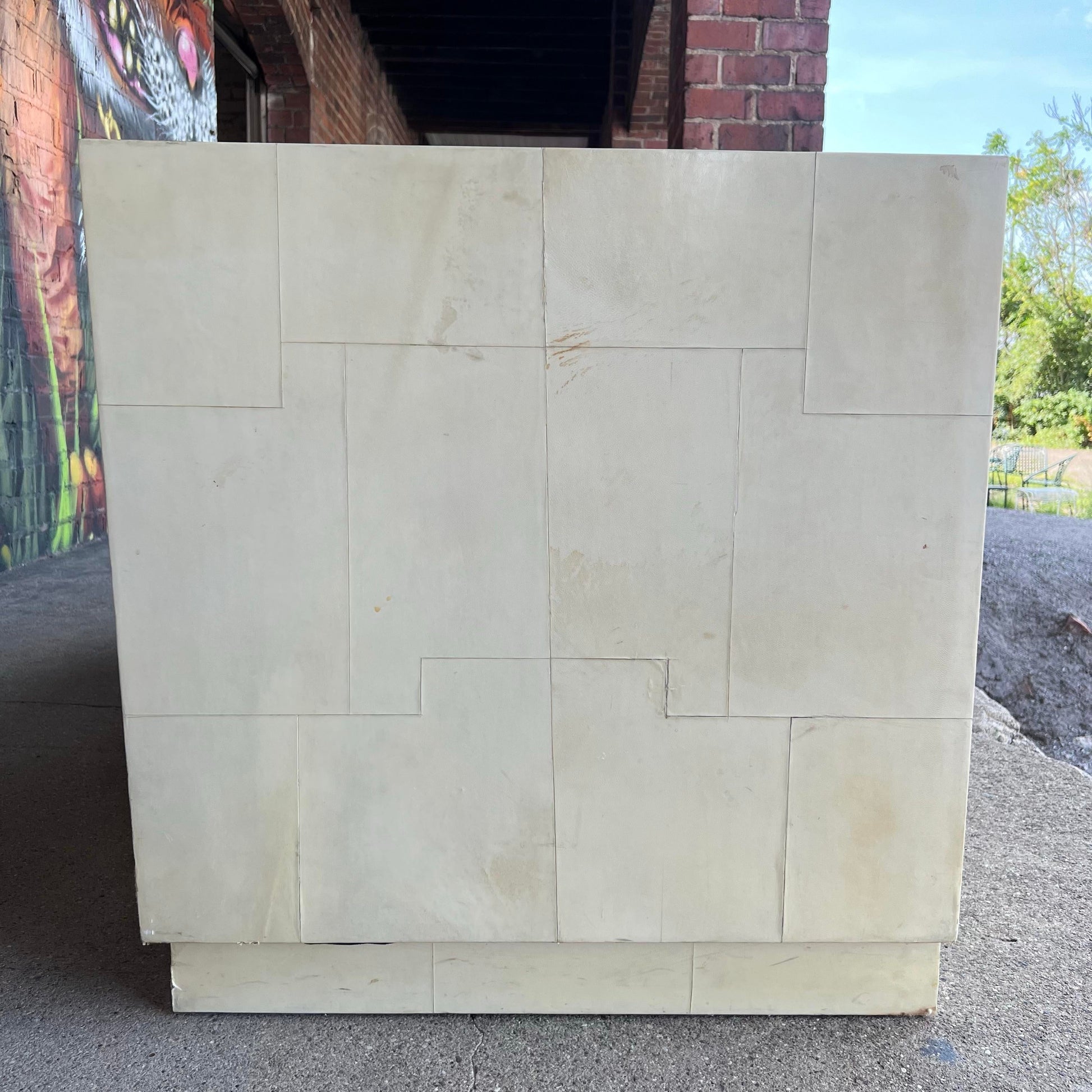 Goat skin wrapped loveseat with white boucle fabric by Karl Springer. We have two loveseats in total, listed separately.