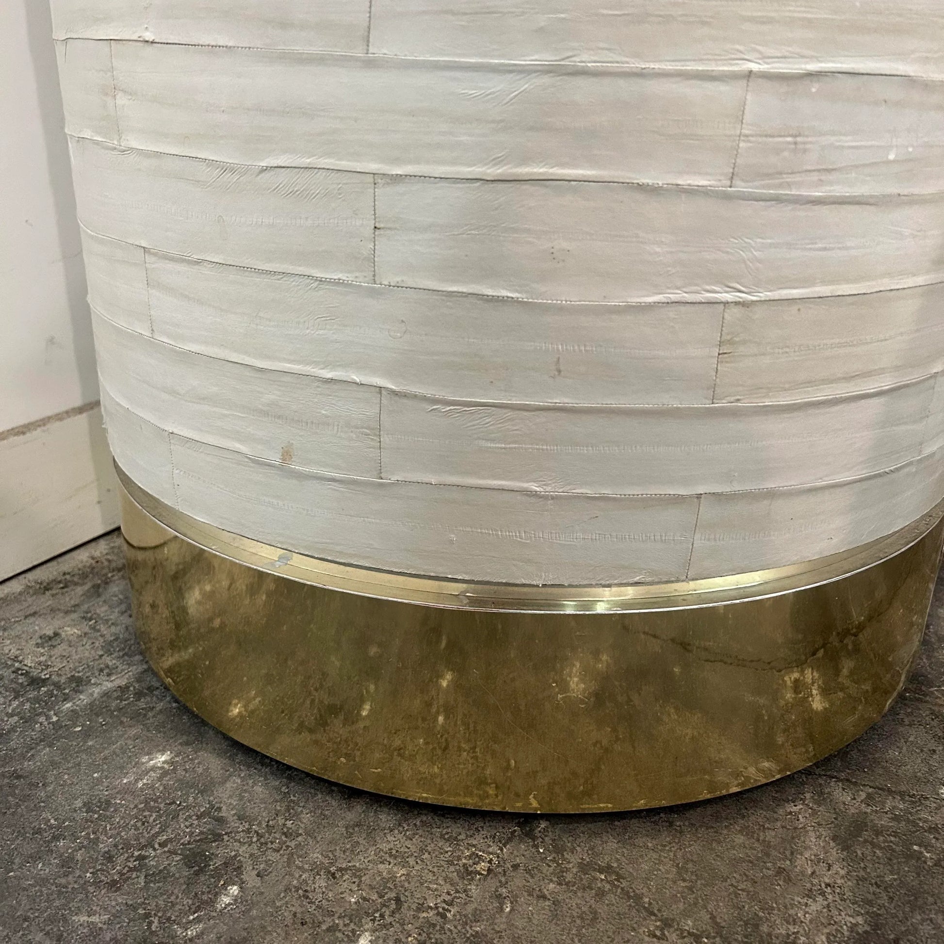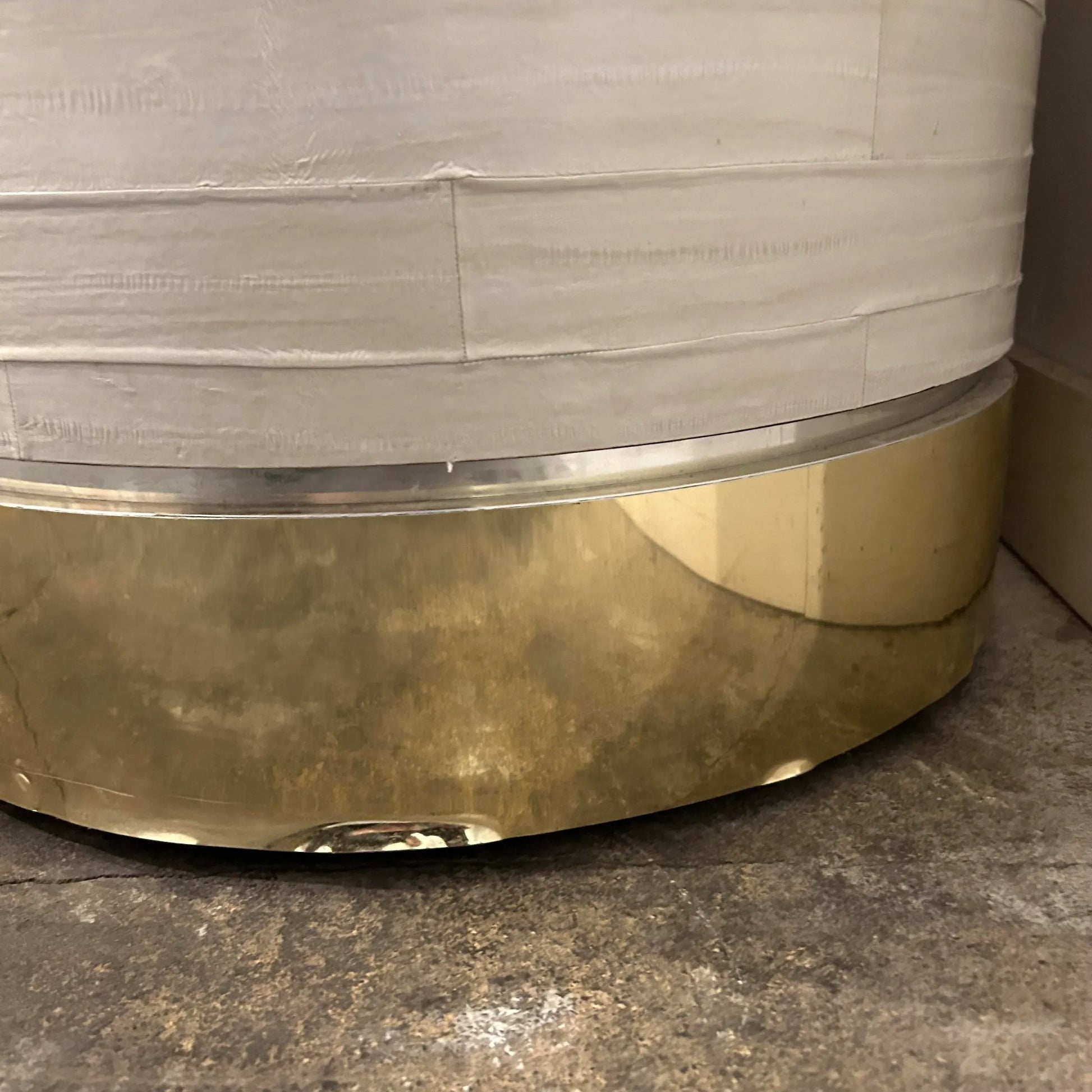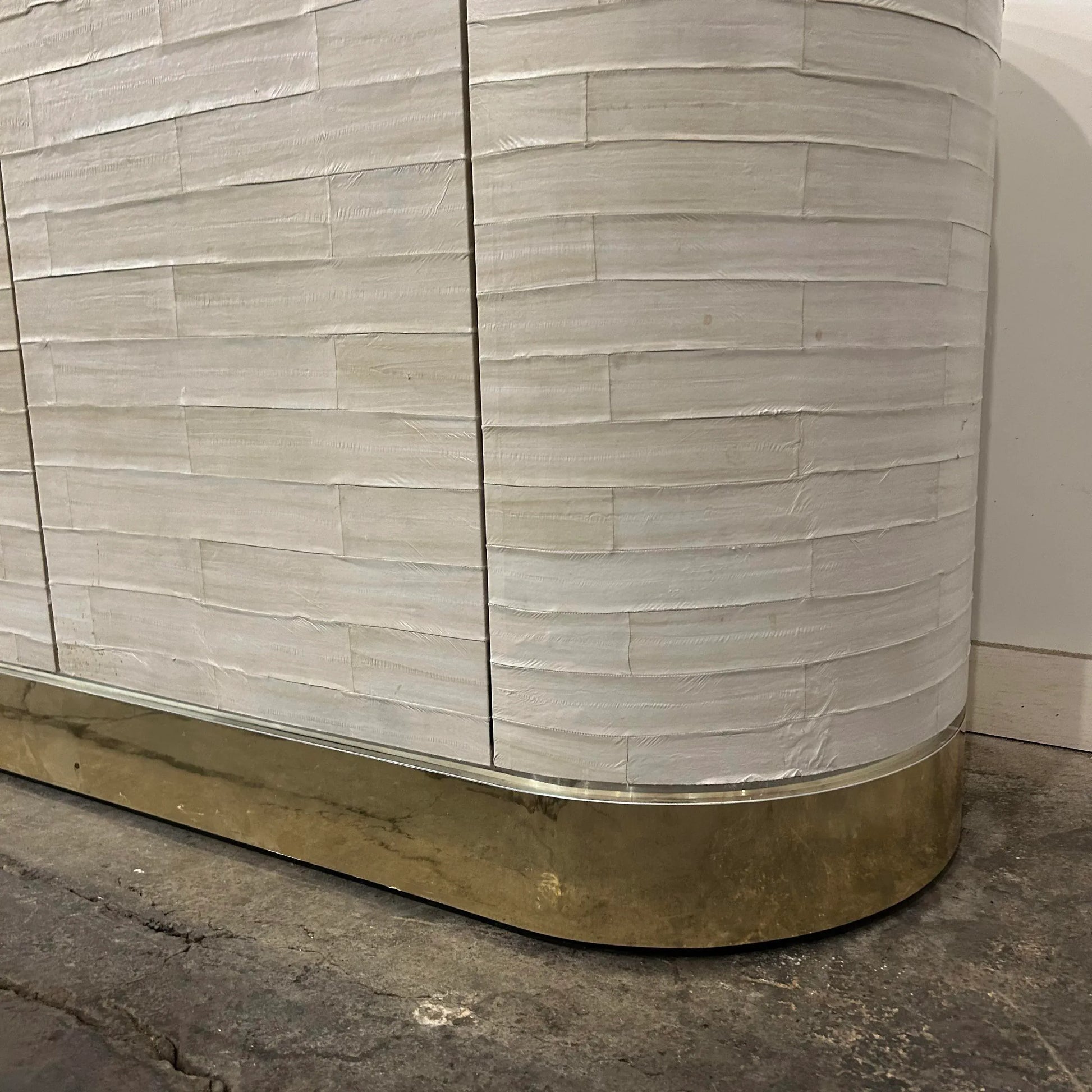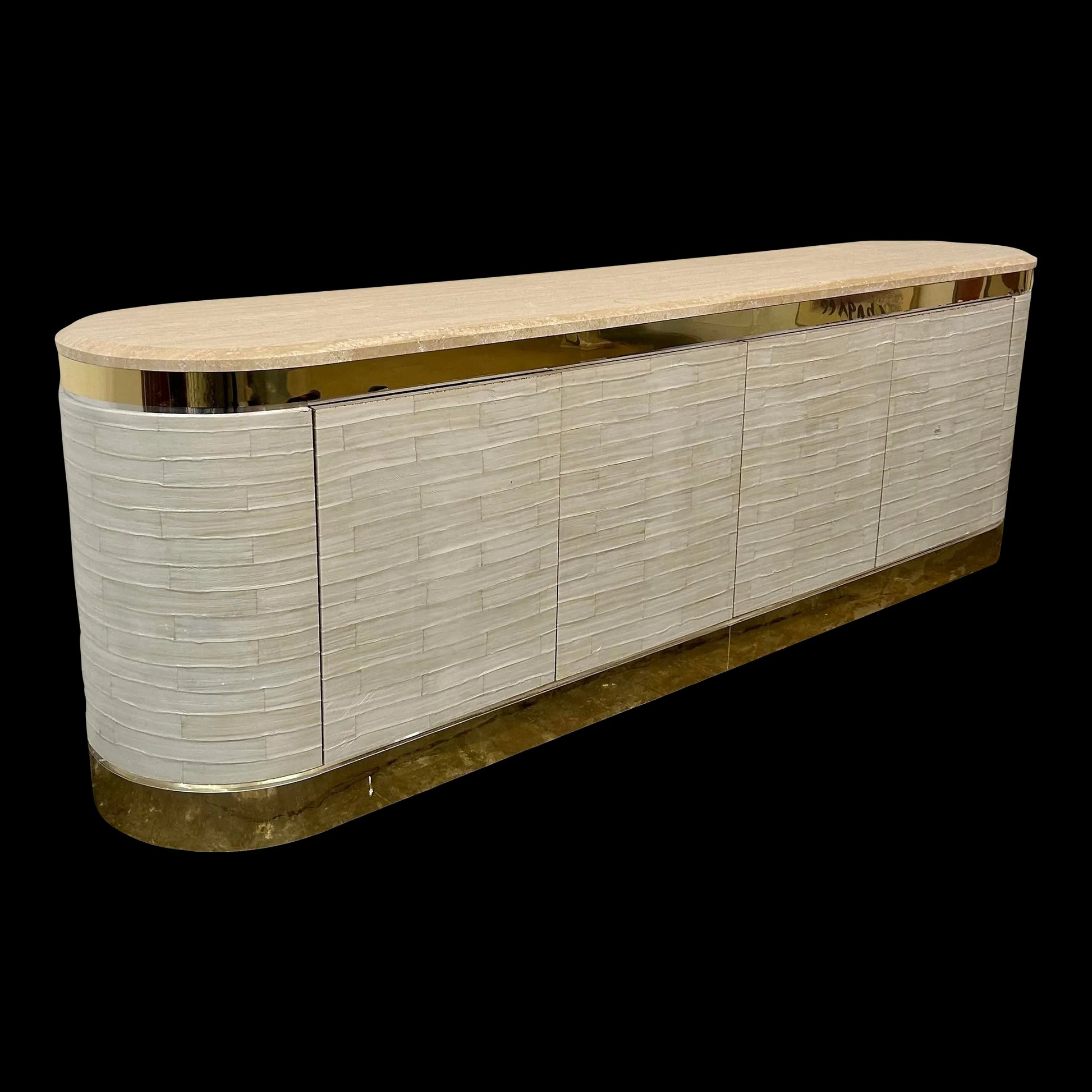 Real deal Karl Springer Custom made two sides credenza. This piece is extremely heavy with brass base and travertine top. It does have hidden rollers so it can be moved on a flat surface fairly easy. It is leather wrapped all the way around and has doors on both sides.