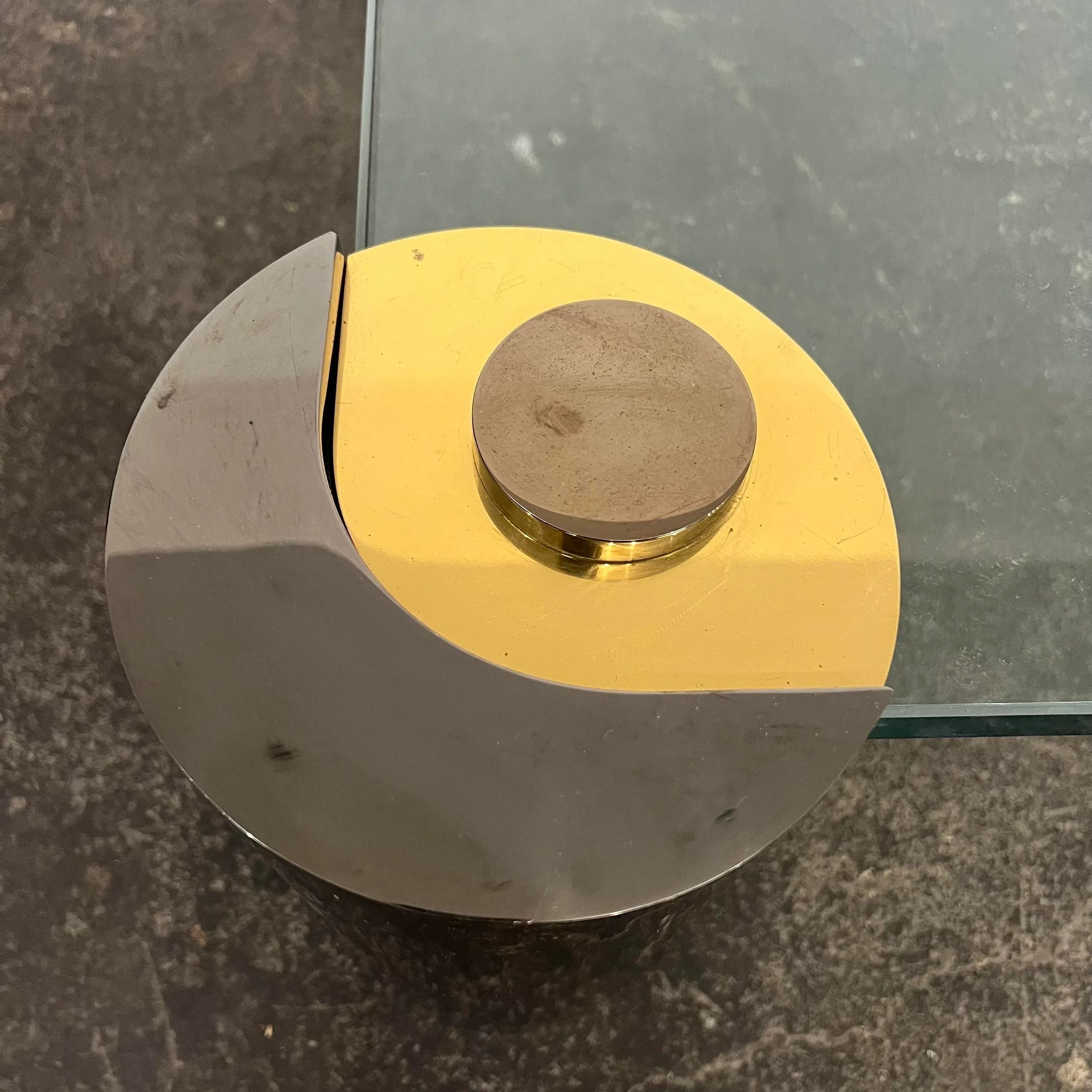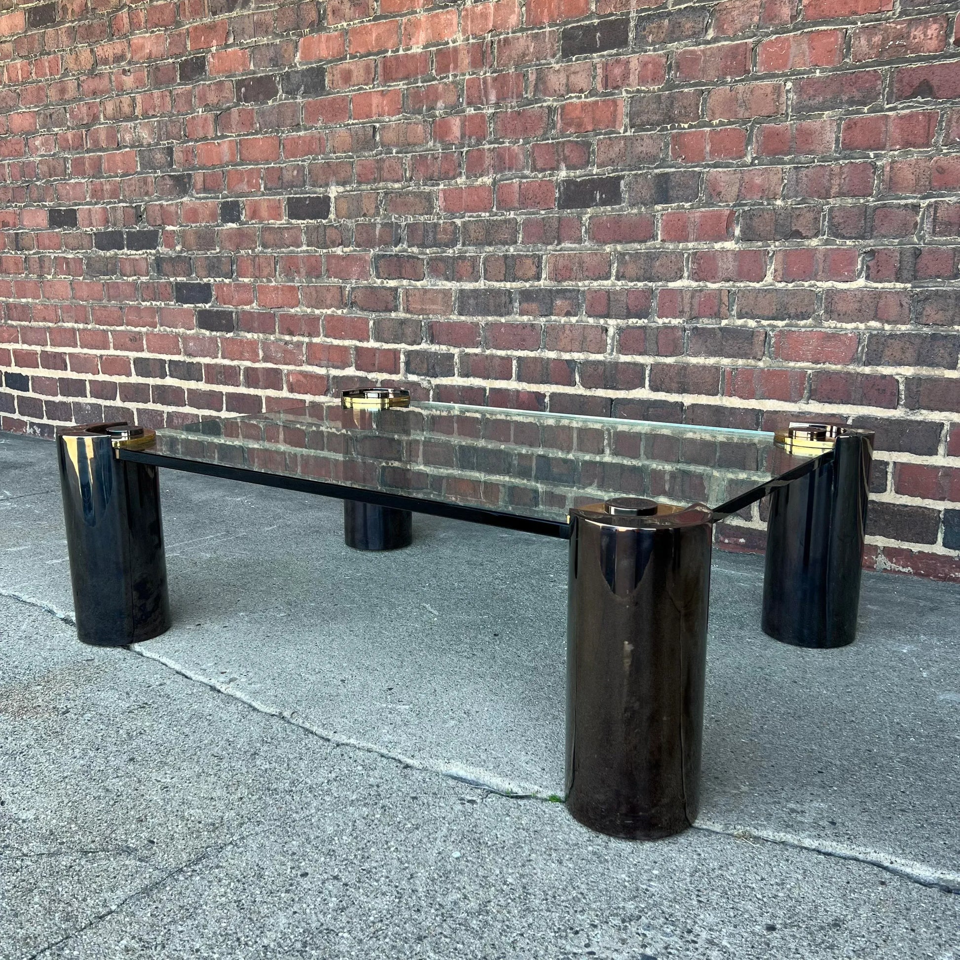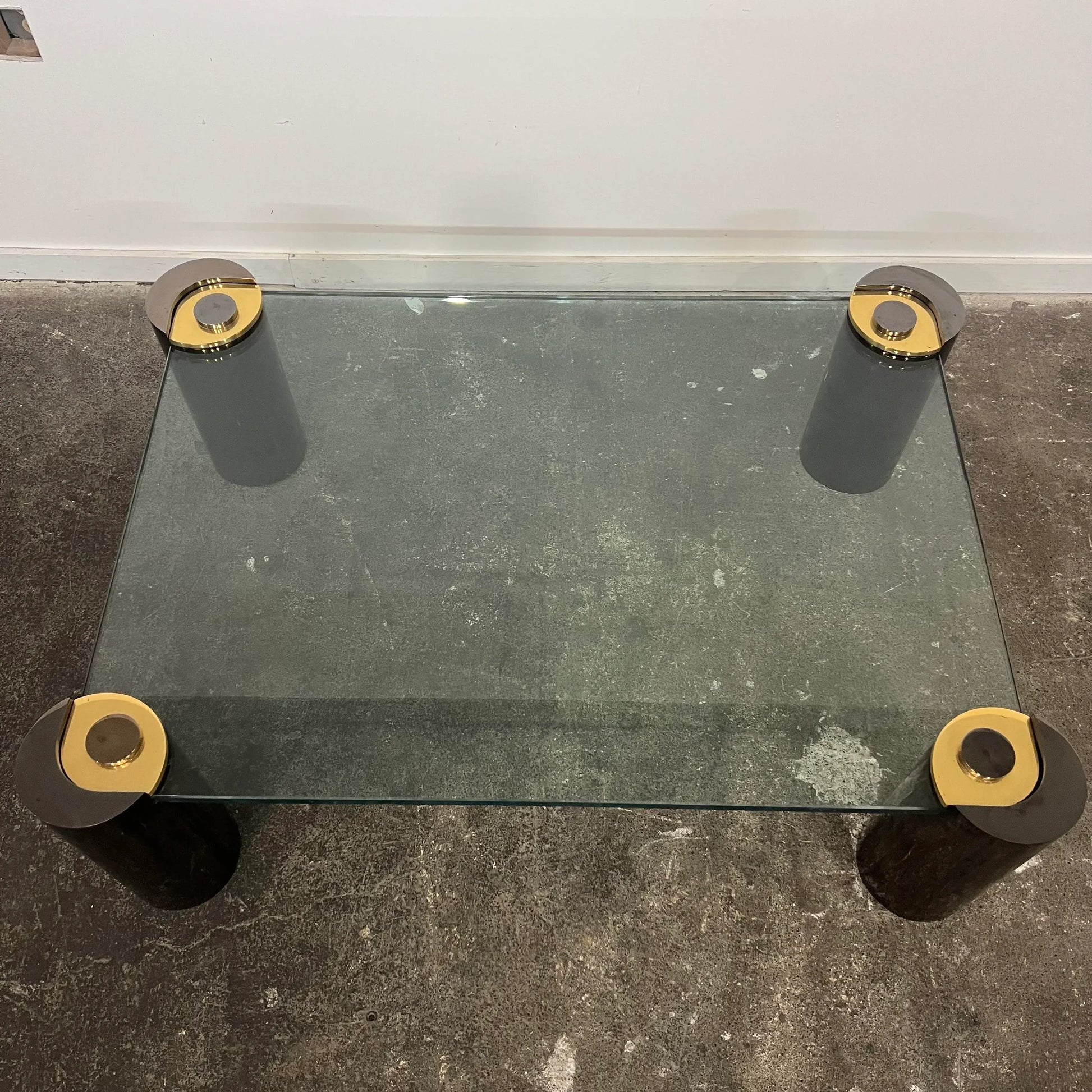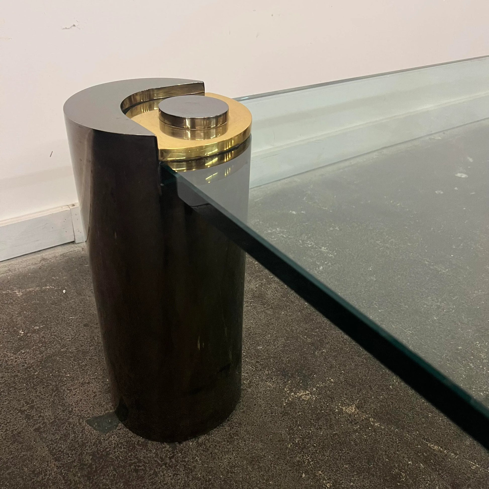 Large glass top coffee table by Karl Springer. This table features 1 inch thick beveled glass and accents of brass. Signature on table leg.