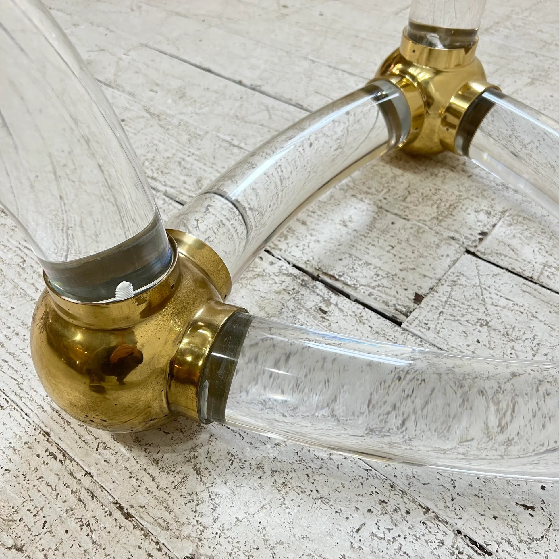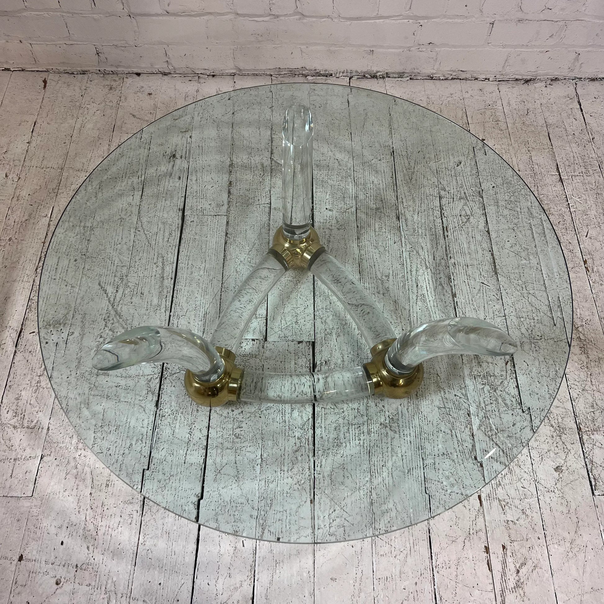 Circular glass coffee table in the style of Karl Spinger. The table base is constructed out of lucite and brass.