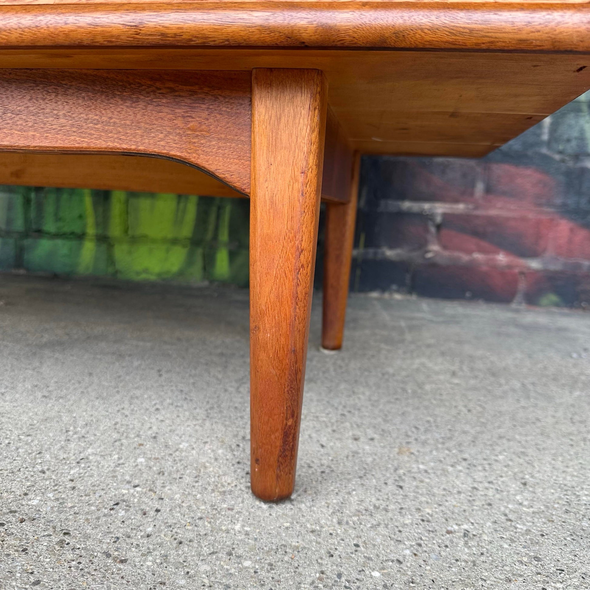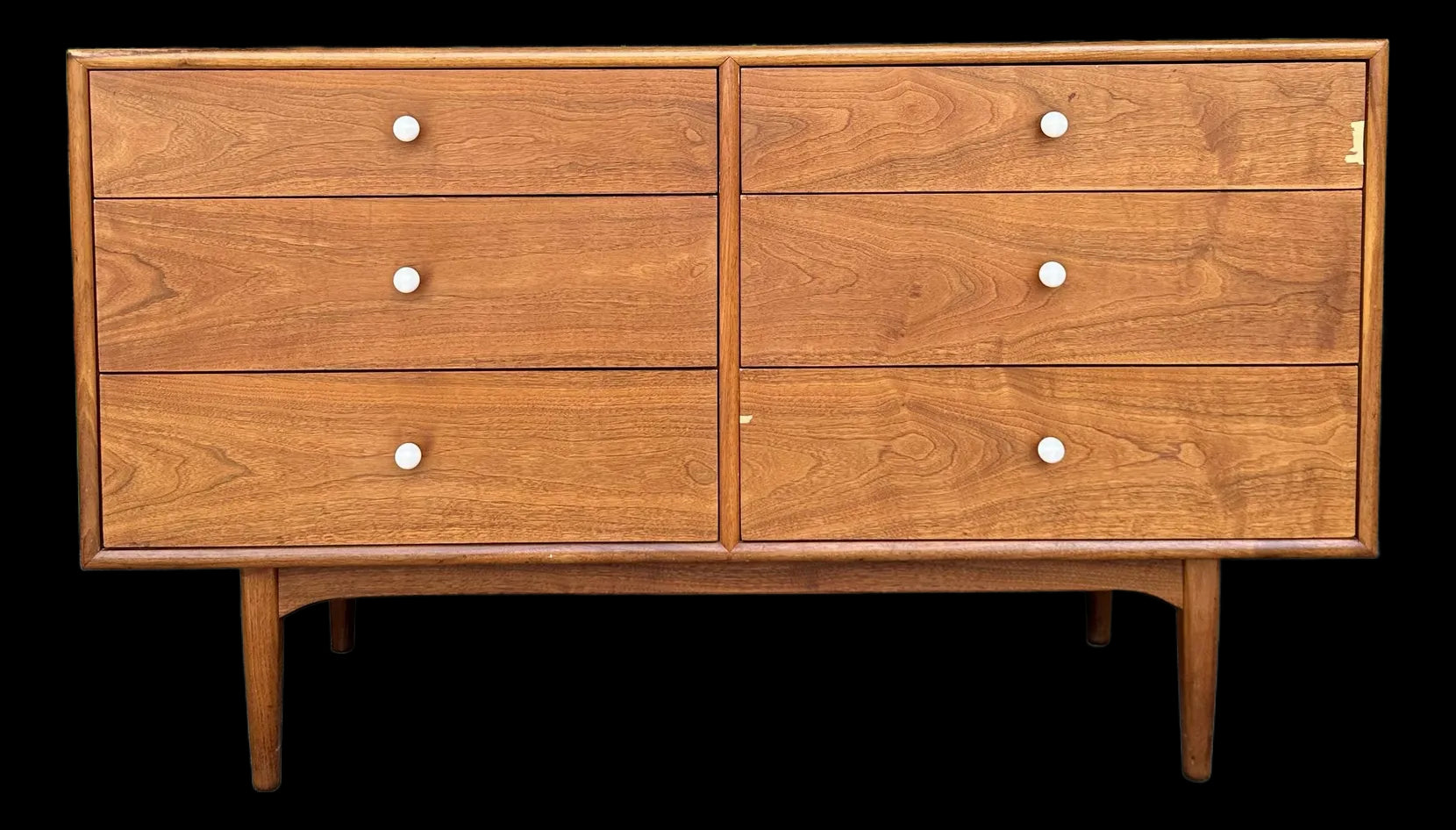 Mid-century modern low dresser by Kipp Stewart for Drexel’s Declaration line. This piece features 6 drawers with white porcelain round knobs. There is a makers mark in top drawer.