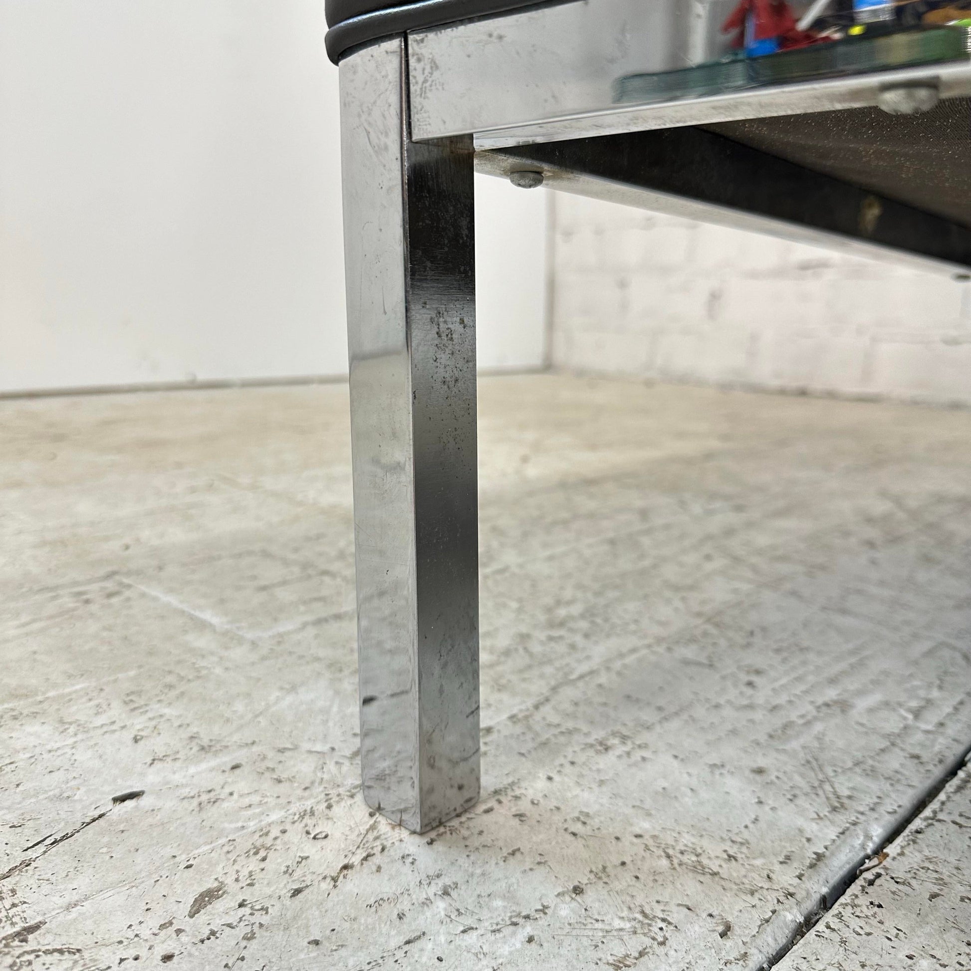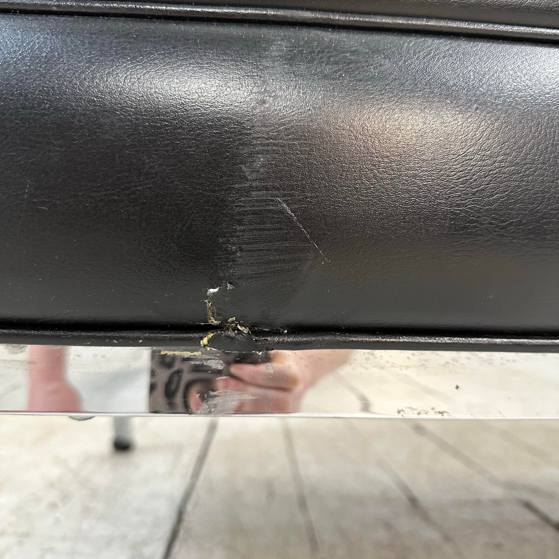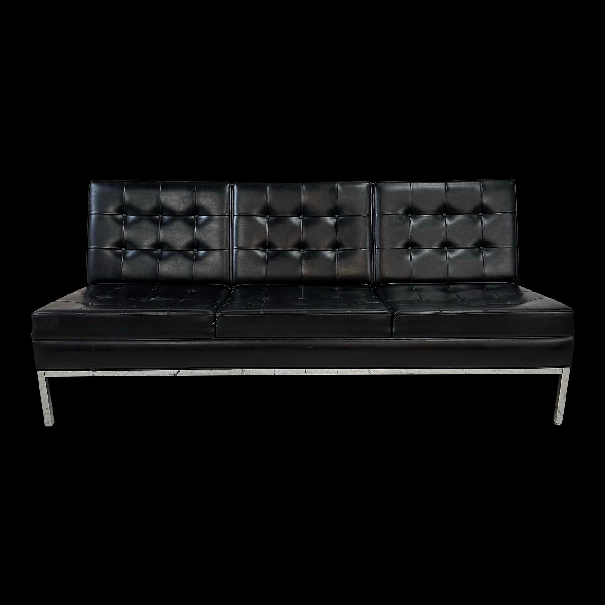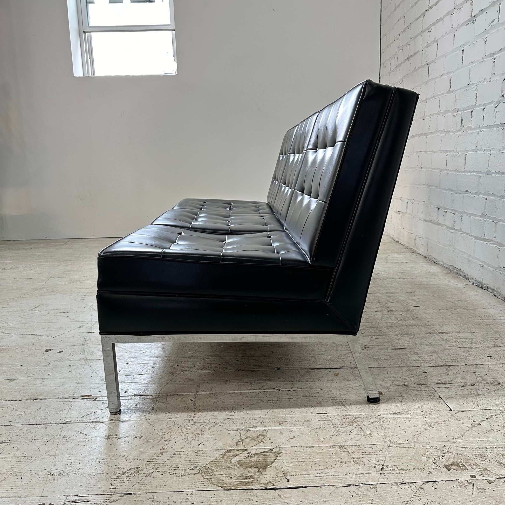 The sofa features an iconic armless design by Florence Knoll with a modern chrome base and legs. The sofa is covered in a black vinyl with tufted buttons. The sofa has a Knoll tag on the bottom side of the seat.