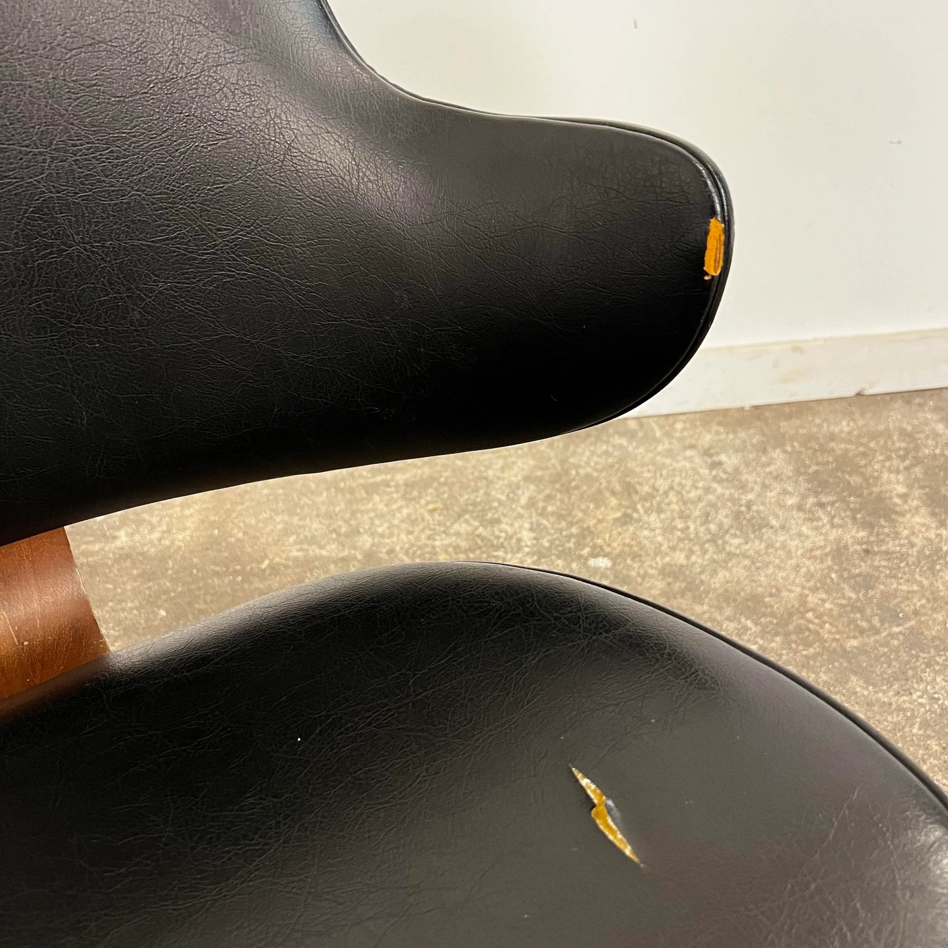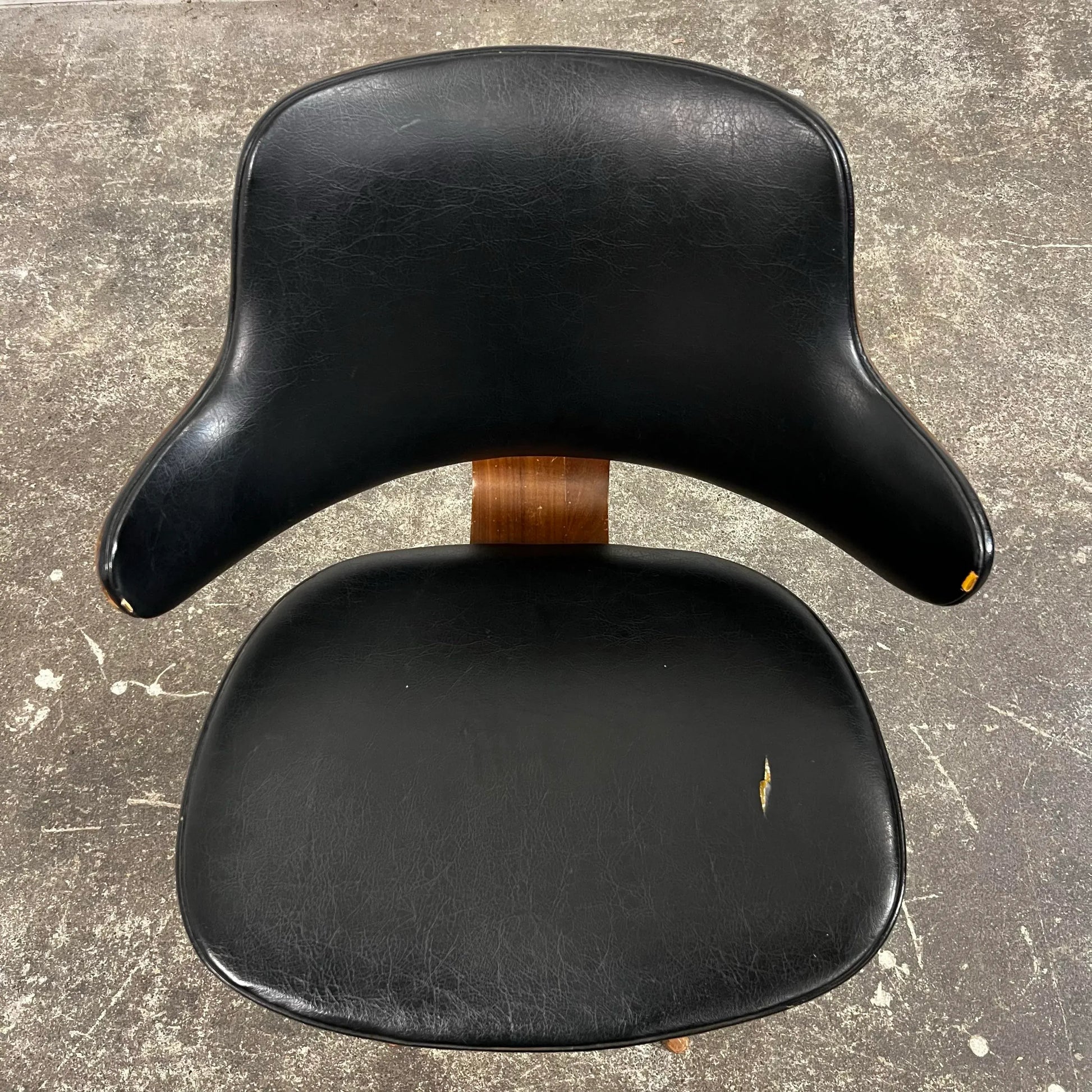 This is an eye catching design by Kodawood! The chair features a bentwood walnut back rest that appears floating above a sleek black vinyl seat. The chair swivels on a walnut wooden base.