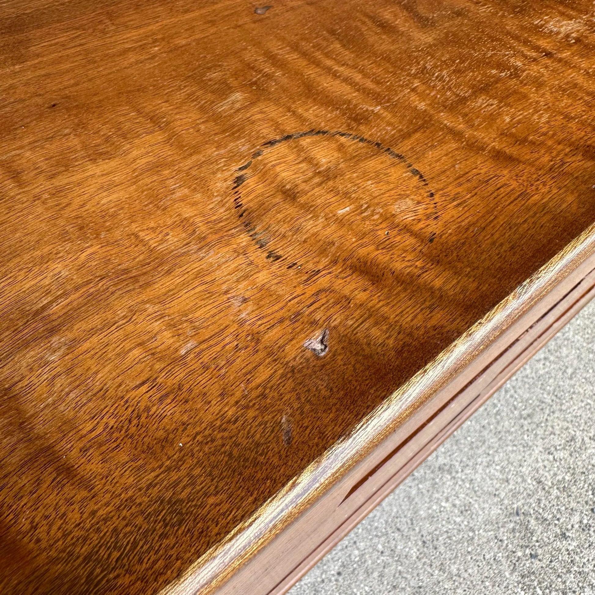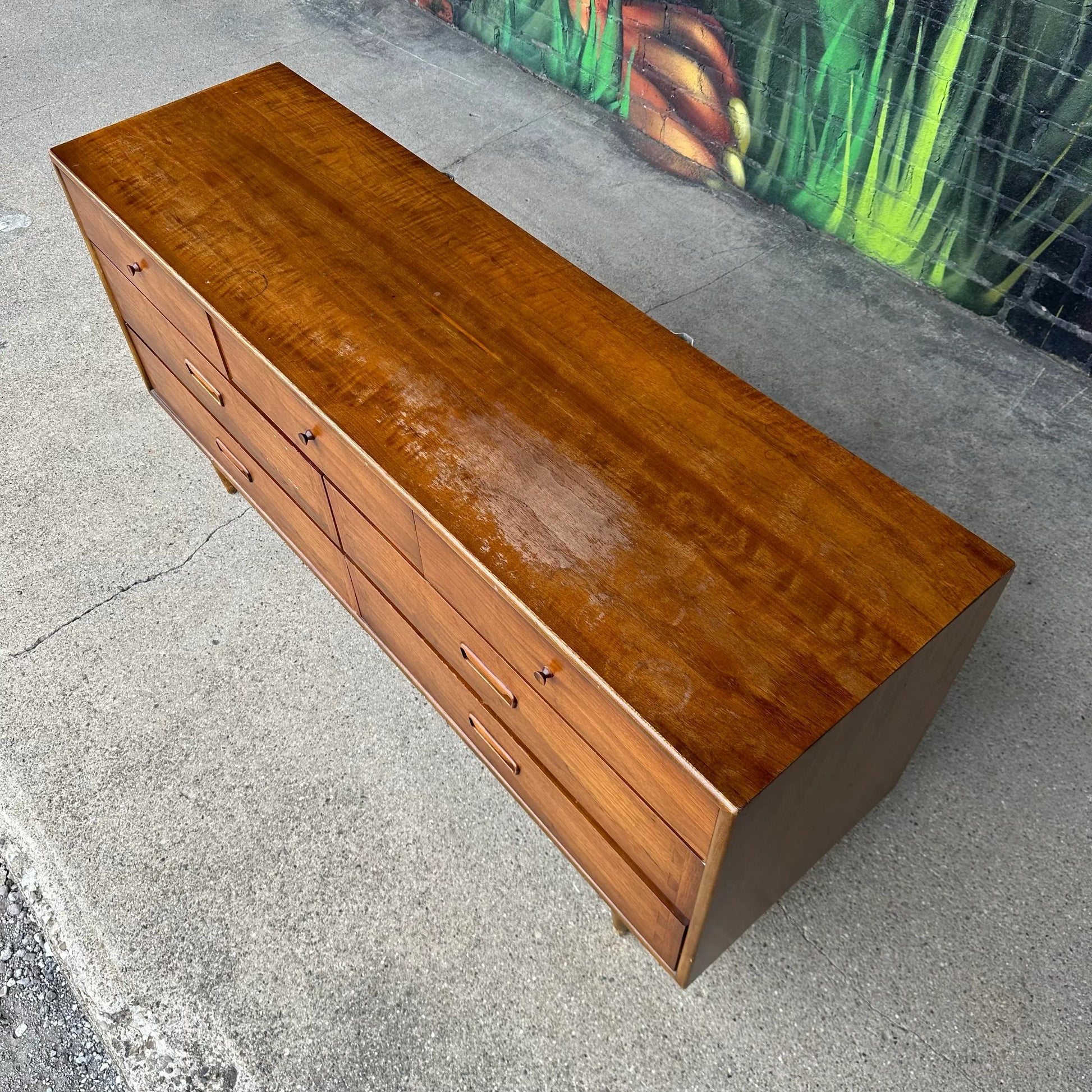Walnut 7-drawer dresser by Lane Furniture featuring the classic “dove-tail” detailing of the “Acclaim” furniture line. This mid-century modern piece has clean lines with tapered tall legs and interesting carved wooded ‘U’ shaped drawer pulls.