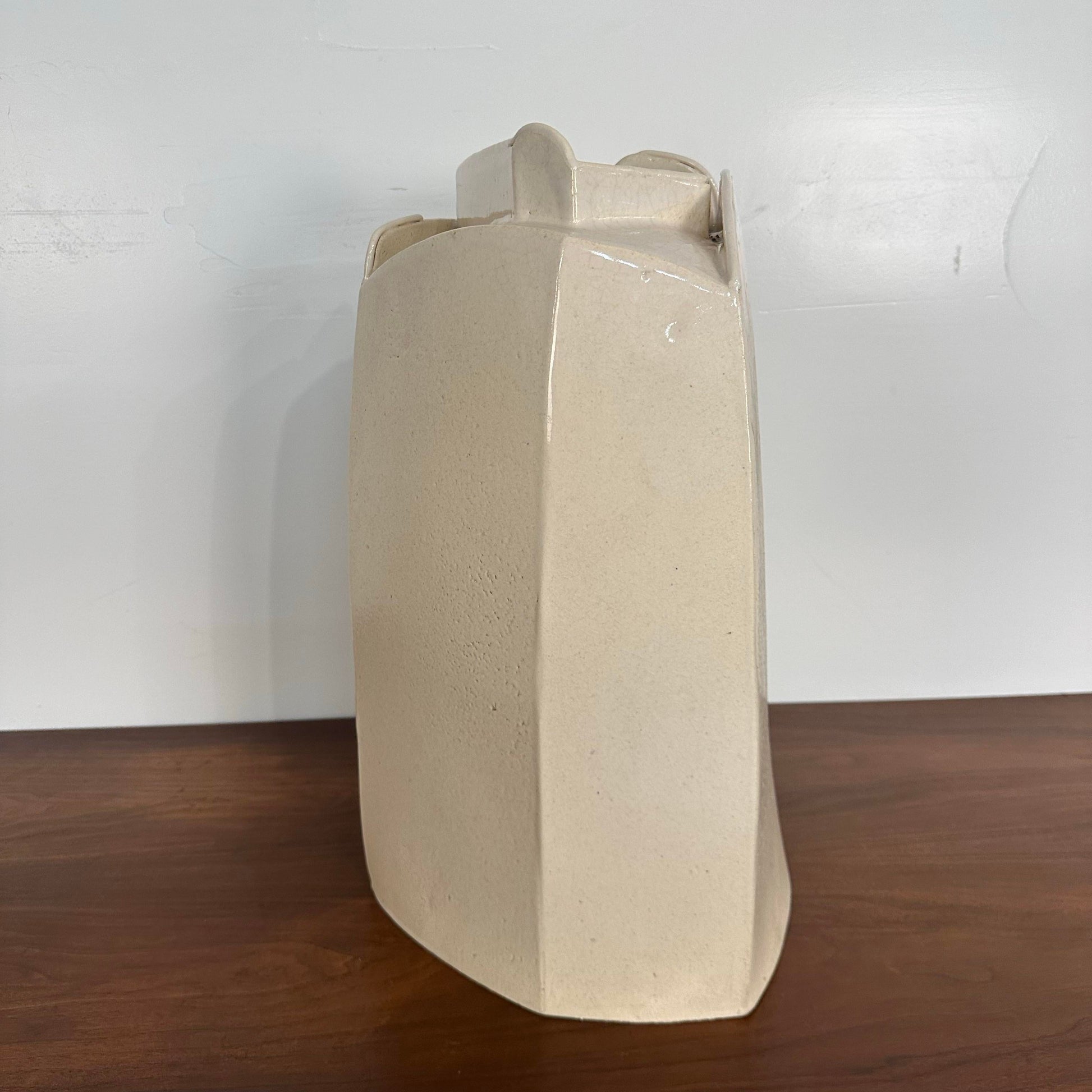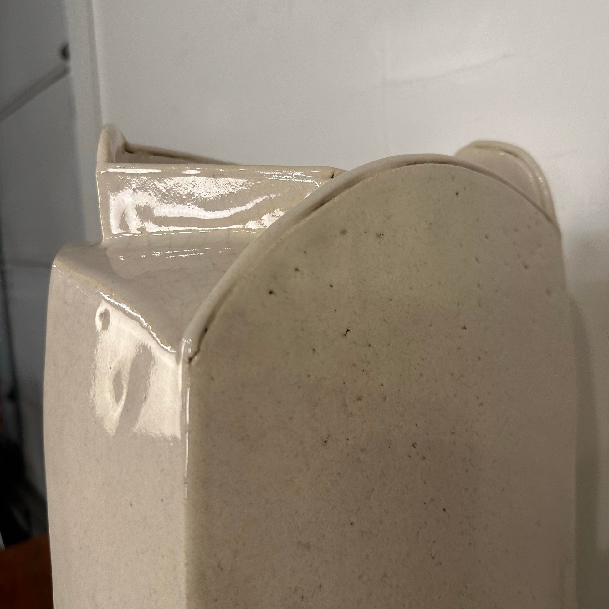 Large glazed slab-built ceramic sculpture featuring geometric forms, shapes, and folds. No signature.