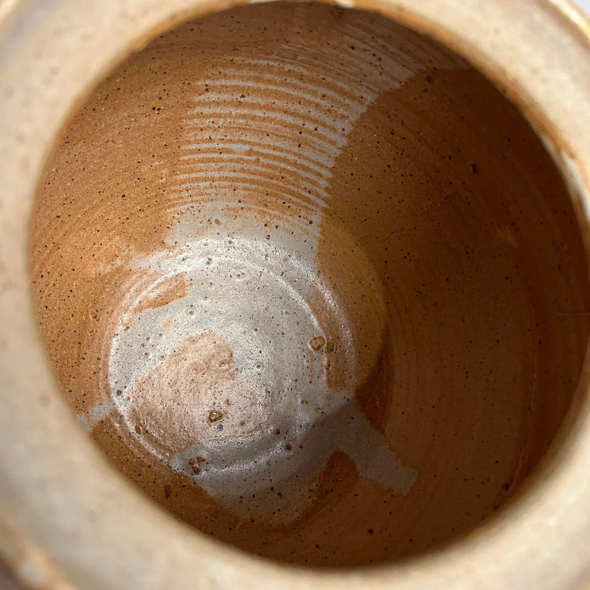 A large lidded ceramic jar adorned with an abstract glaze that echoes the artistic spirit of its era. This captivating piece, marked with a signature on the bottom, stands as a testament to the skill and creativity of its creator. The abstract glaze adds a touch of intrigue, while the lidded design infuses functionality with style. Immerse your space in the charm of Mid-Century Modern aesthetics with this unique ceramic jar, a timeless blend of form and artistic expression.