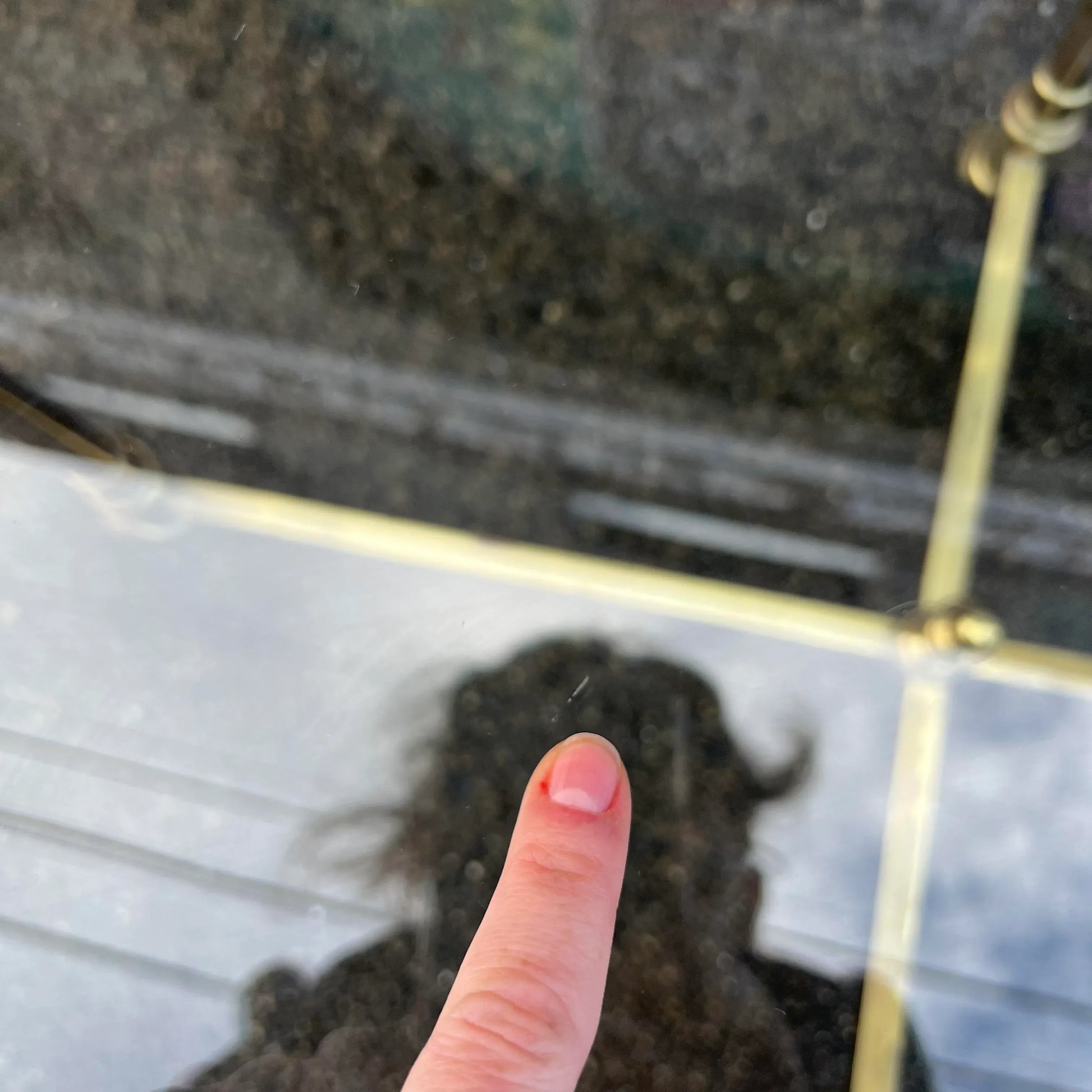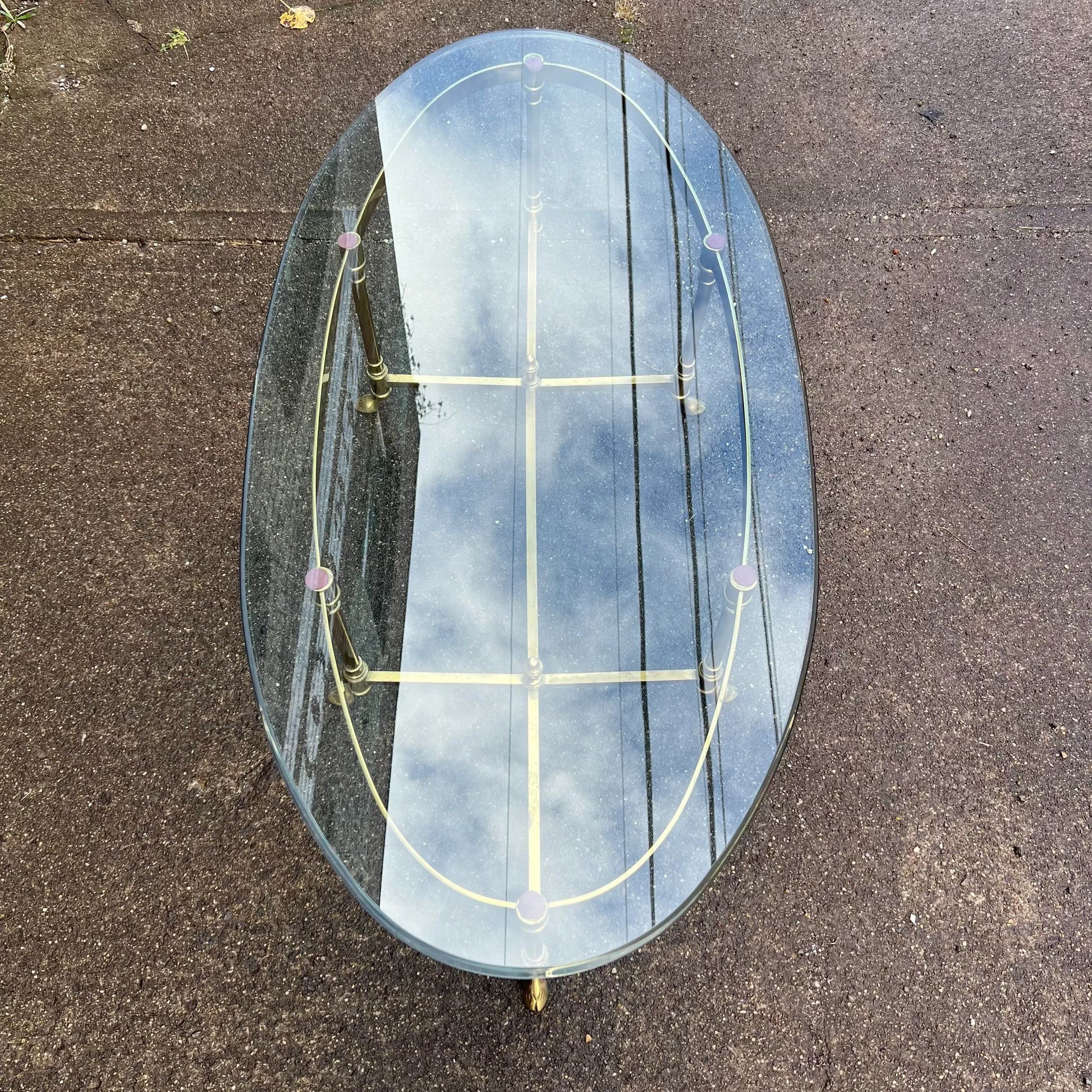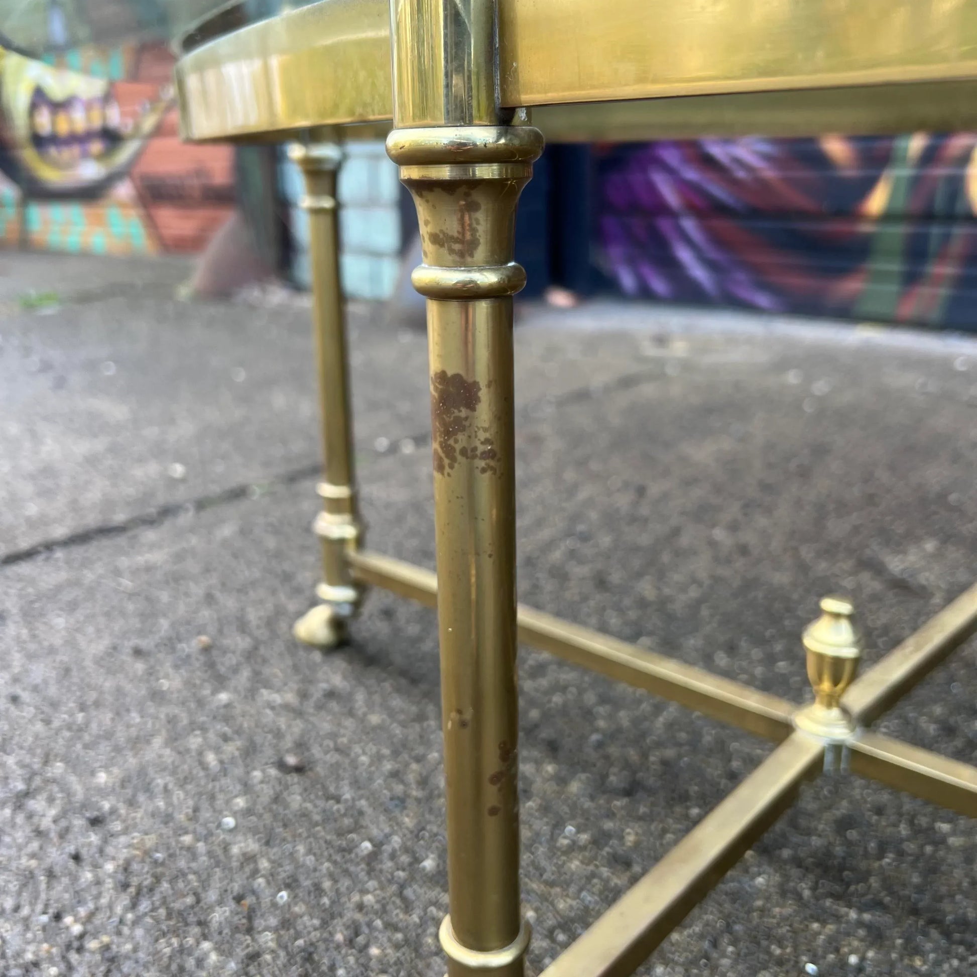 Racetrack style large glass and brass coffee table with hoofed feet by labarge. You don’t often see this larger version.