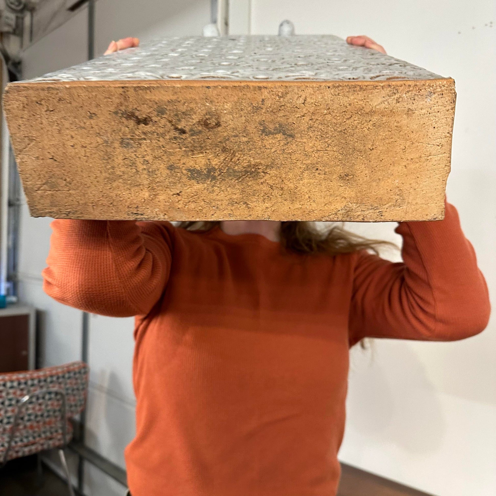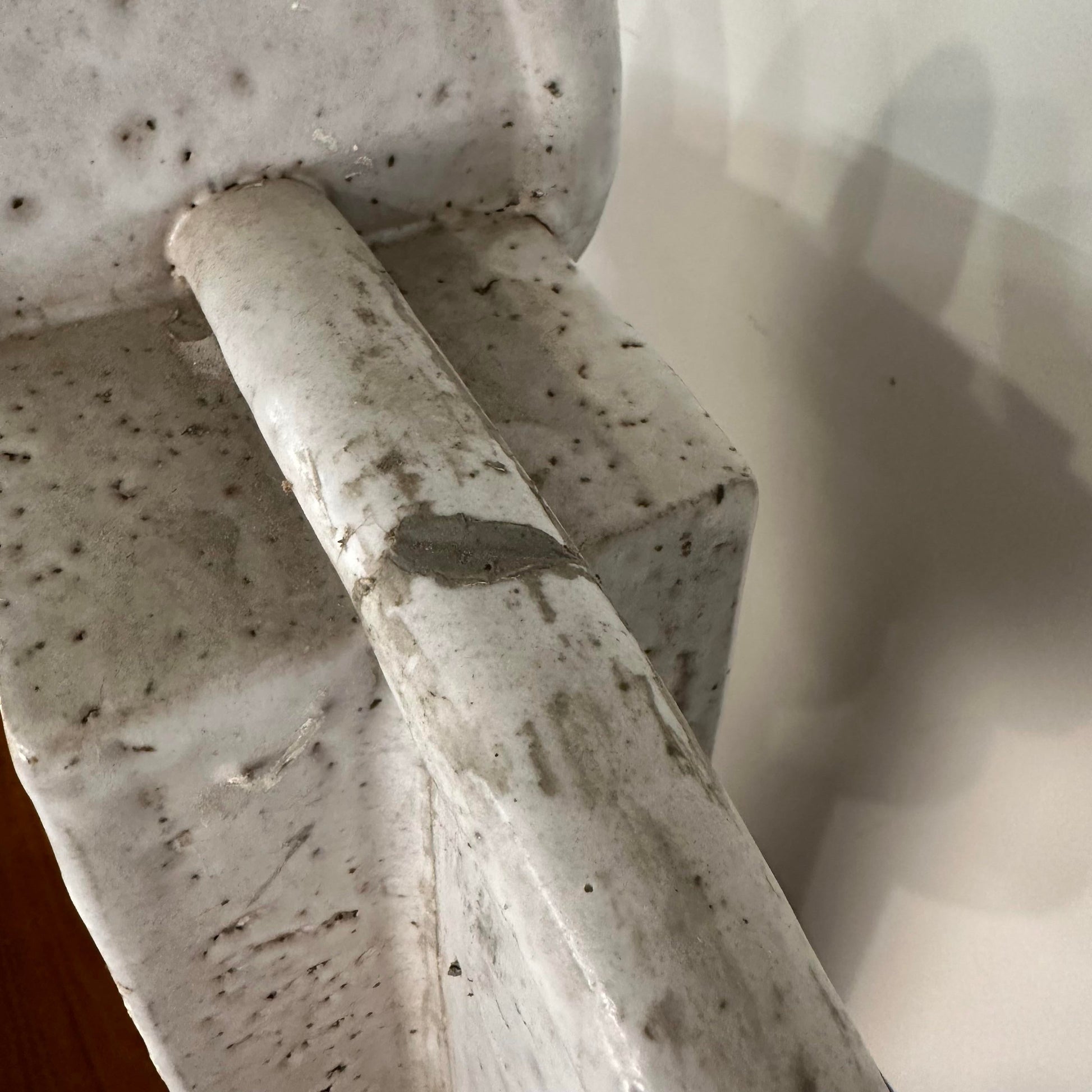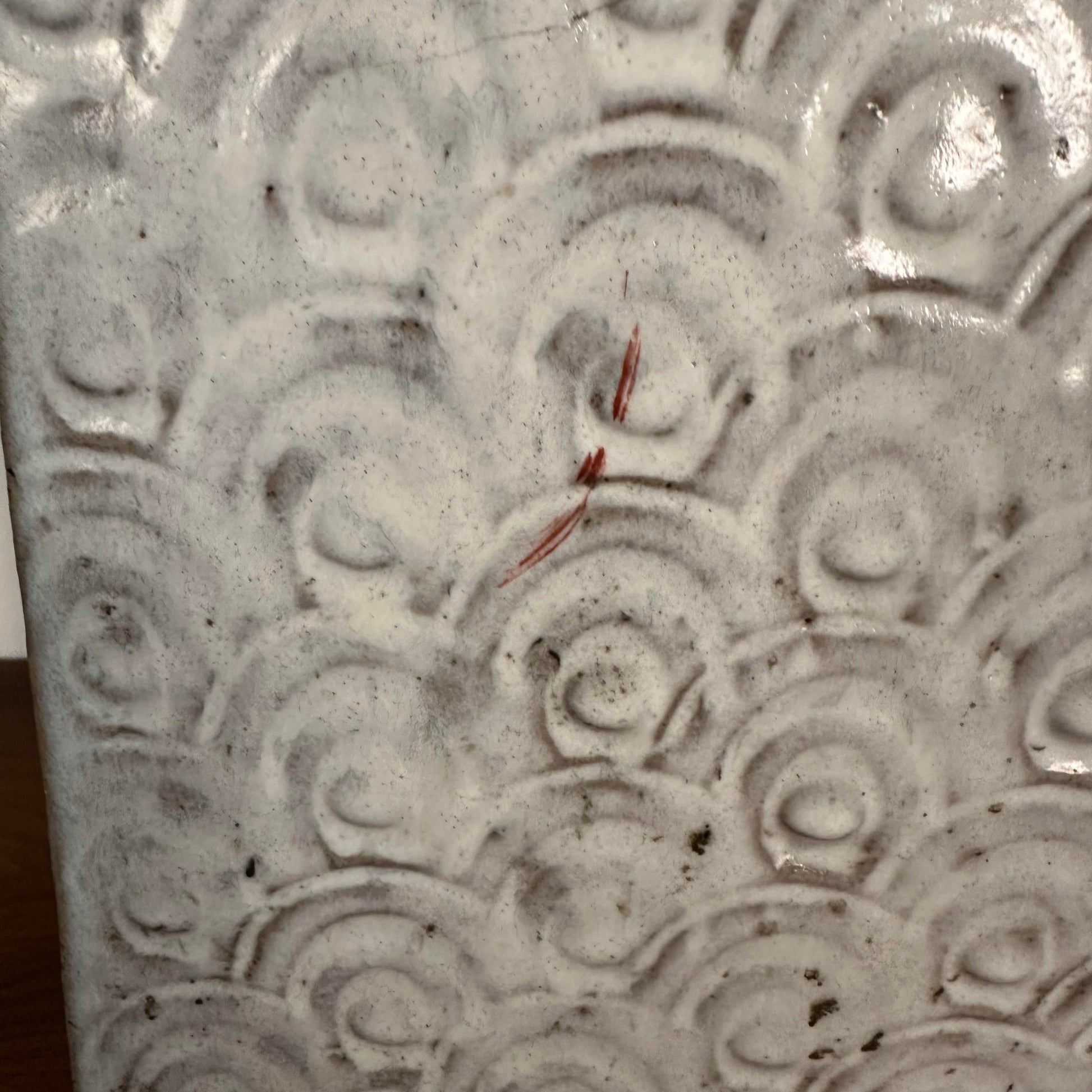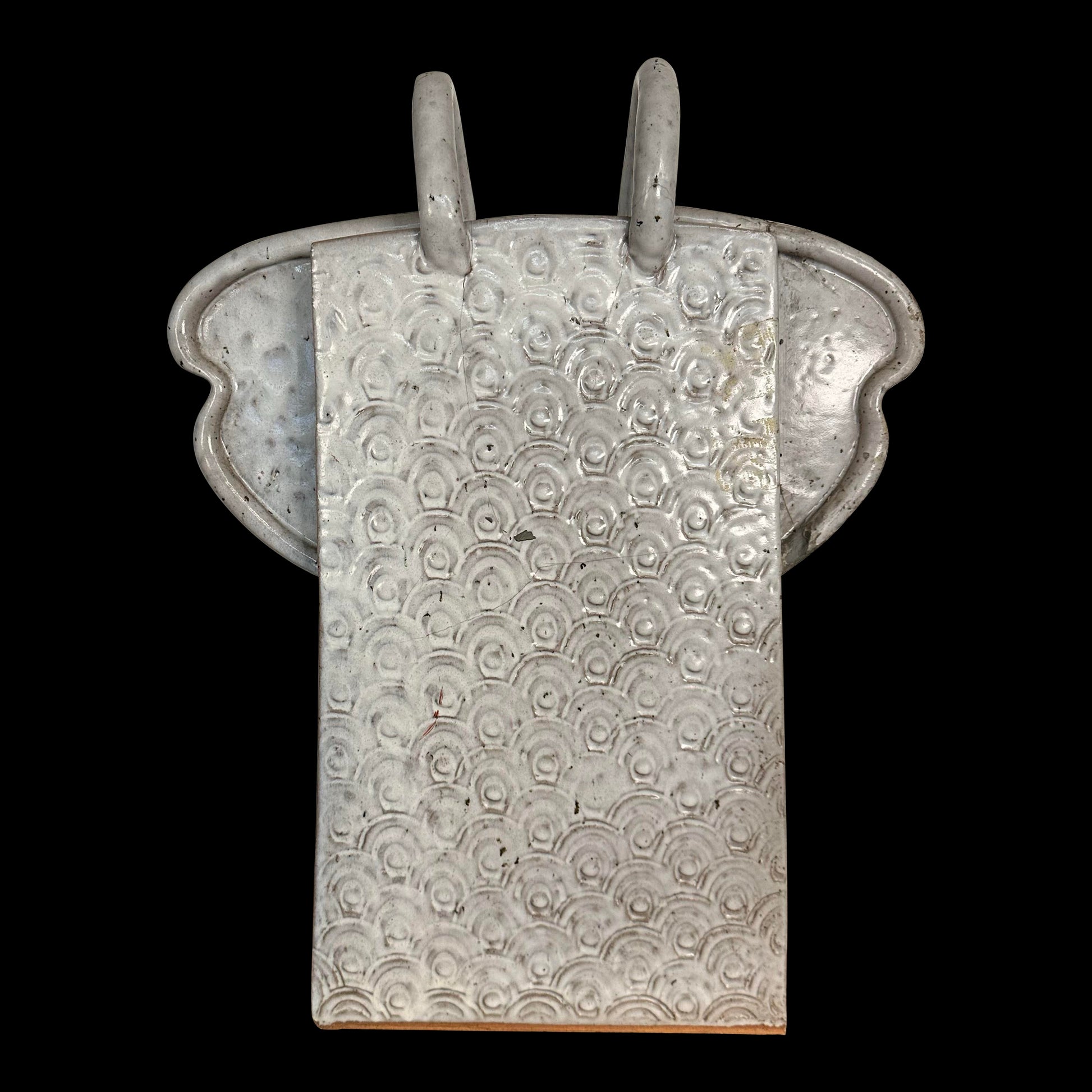 Tall oversized slab-built ceramic vessel. This piece features a stamped body and sculpted “wings” in a greyish white glaze. Unknown artist and date.