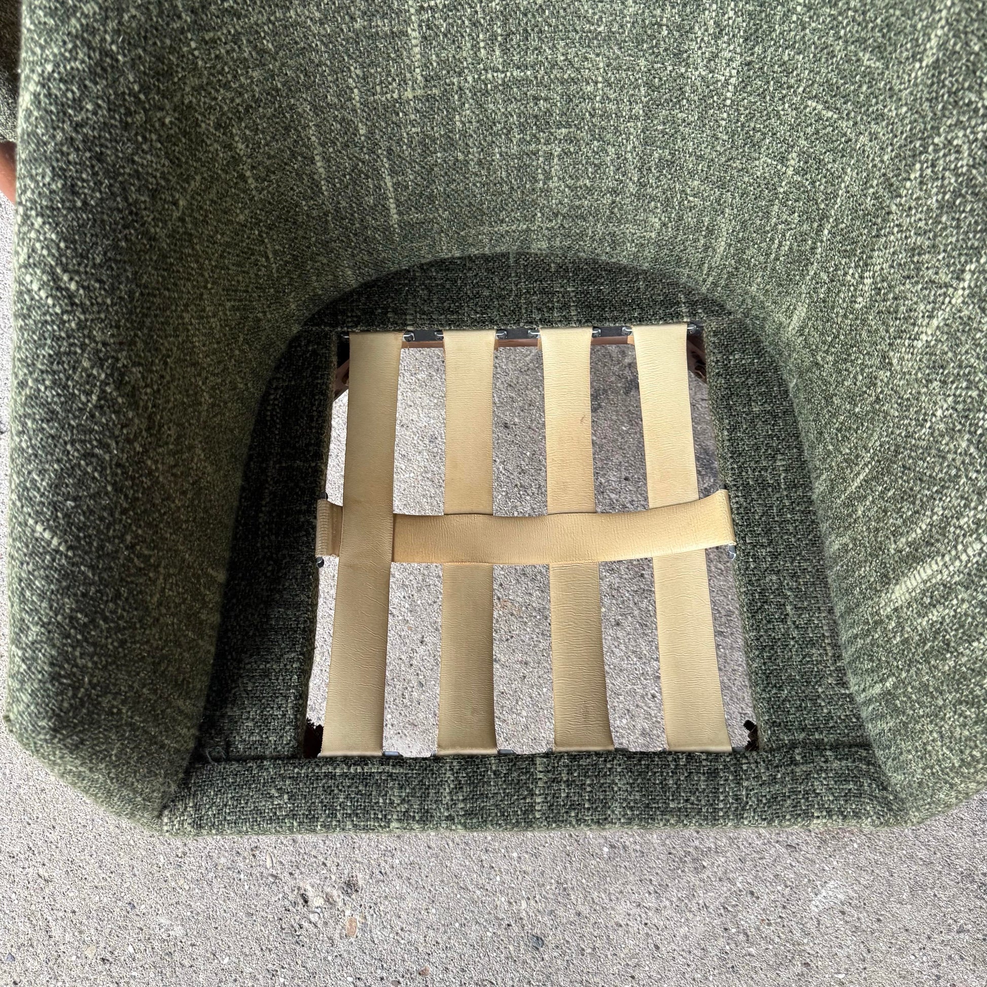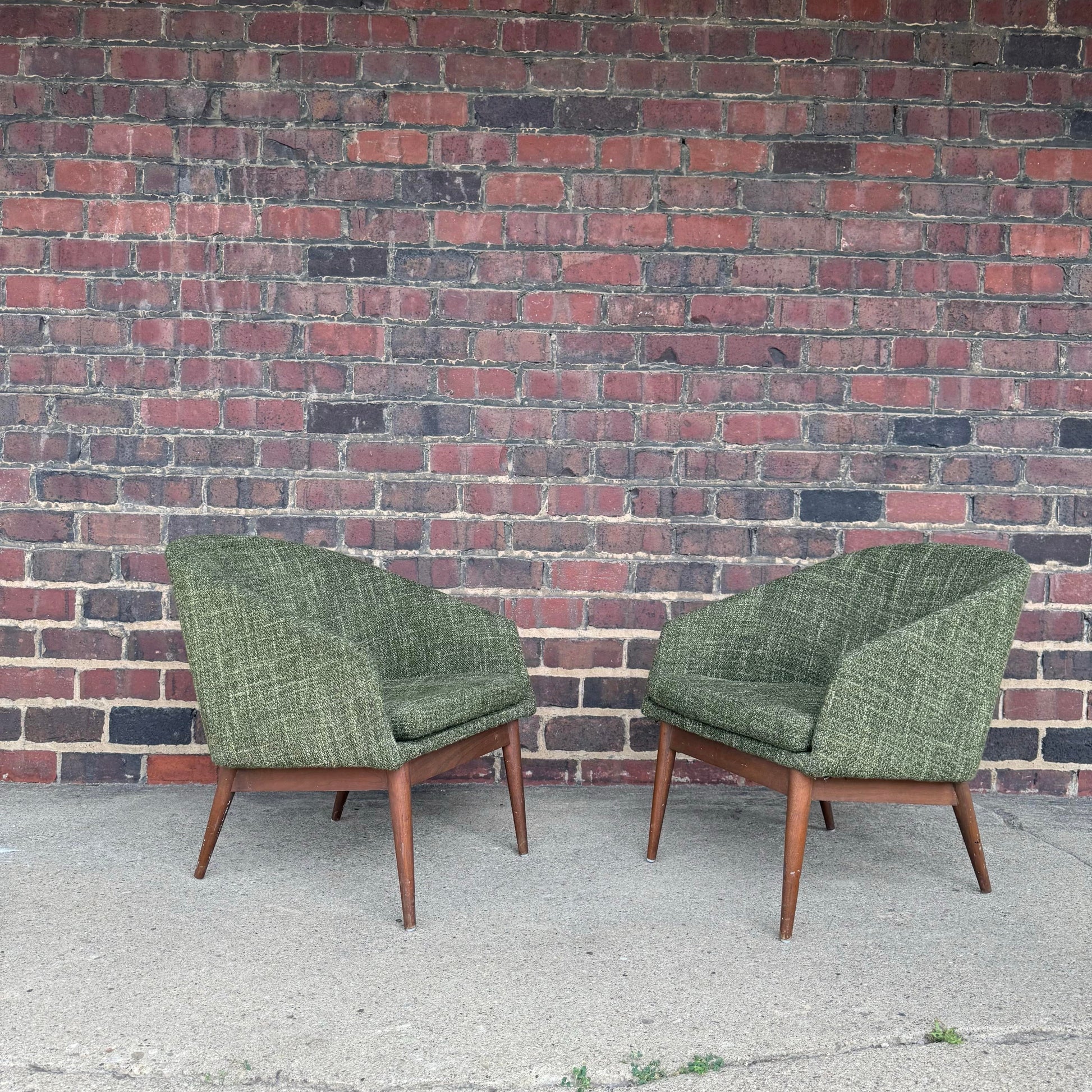 This pair of sculptural lounge chairs is commonly attributed to Lawrence Peabody for Craft Associates, and several similar examples are currently listed under his name. While the construction and design elements are consistent with Peabody’s known work—particularly the angled legs, sculpted seat form, and upholstery profile—we have not been able to locate a definitive catalog reference to confirm the attribution. Offered as found, with attribution based on design characteristics and marketplace precedent.