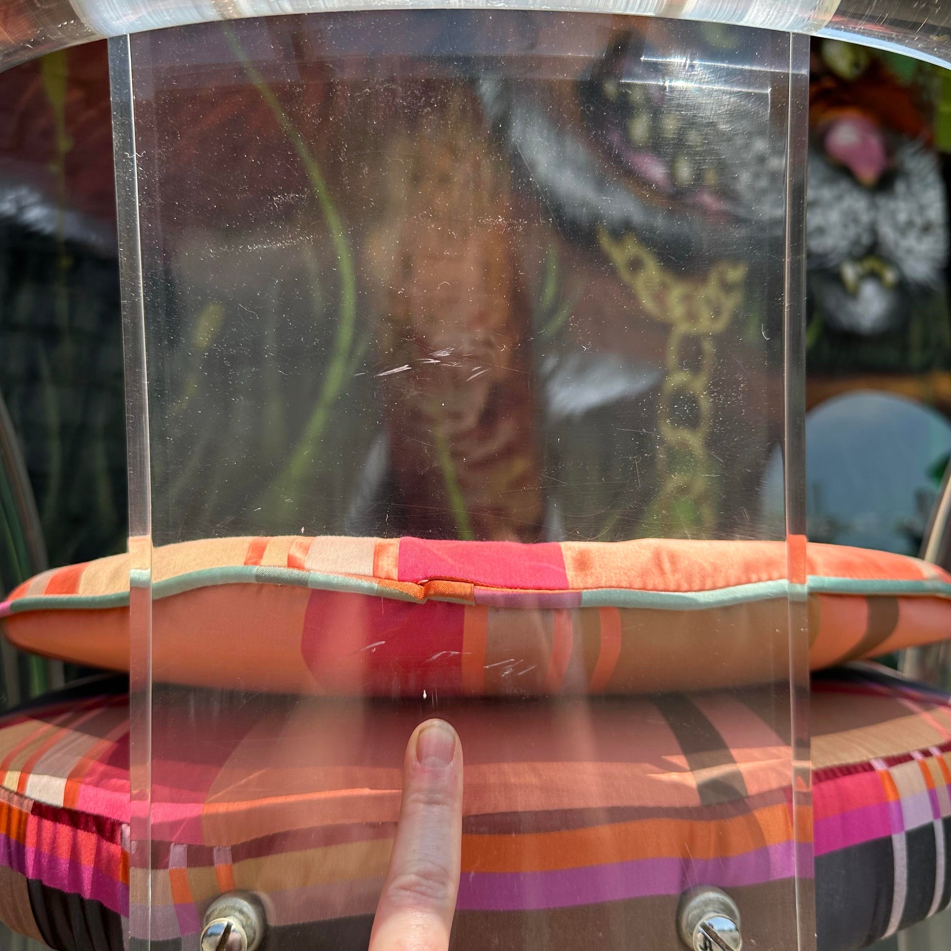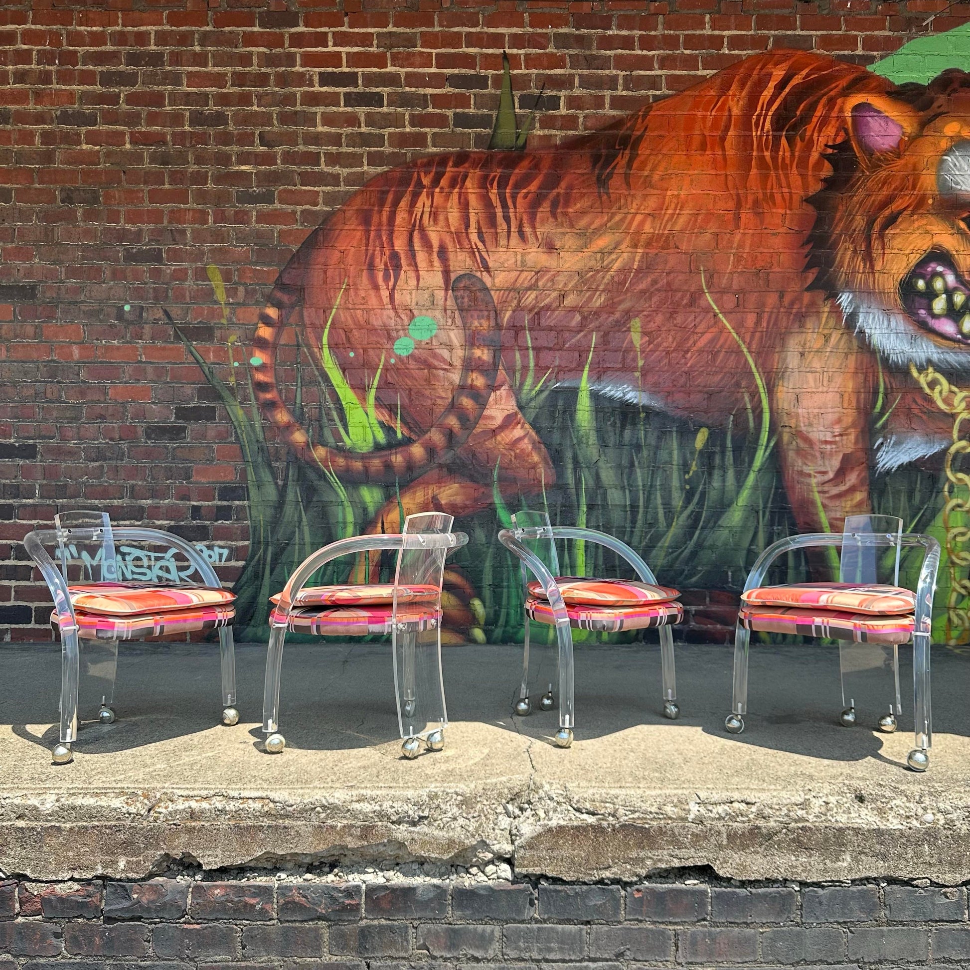 This stunning dining set by Charles Hollis Jones includes a round glass-top table with Lucite legs and four Lucite chairs just reupholstered  in a red, pink, and white plaid fabric. Known for his innovative use of acrylic and Lucite in furniture design, Charles Hollis Jones’ pieces often feature clean lines and a minimalist aesthetic, emphasizing the transparency and sculptural qualities of the materials.
