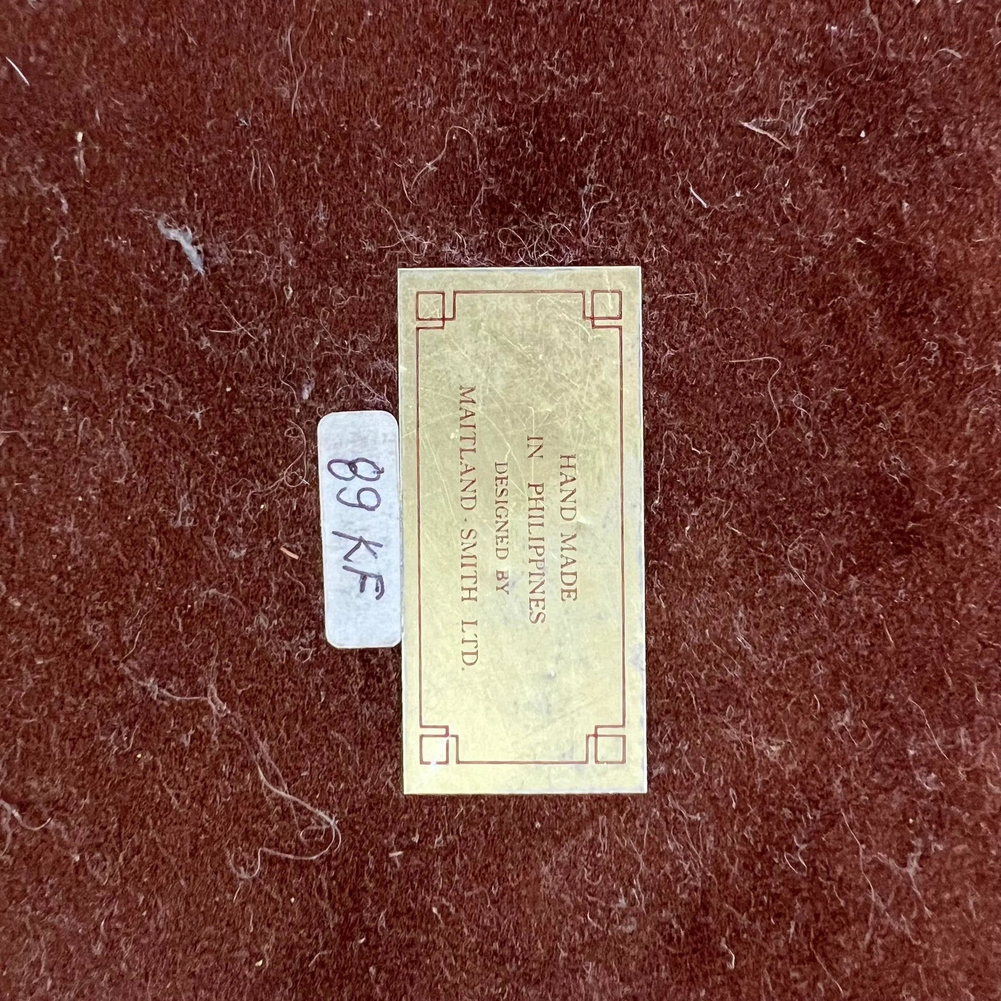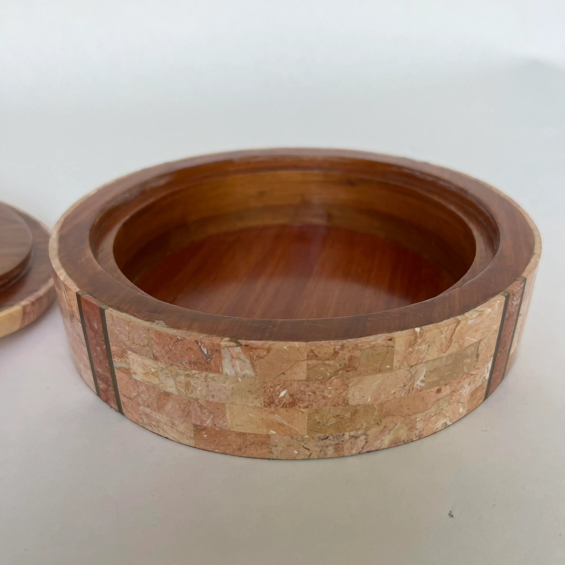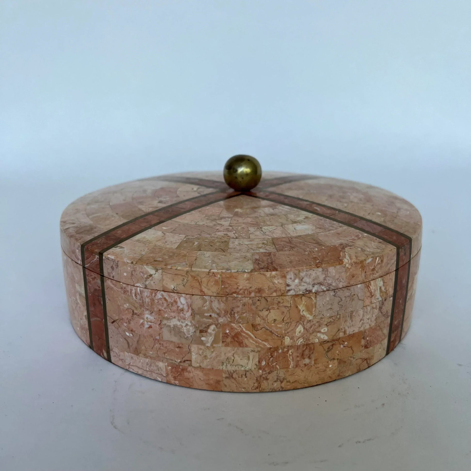 Circular tessellated marble box designed by Maitland Smith. Made in Philippines. Only opens when the pattern is lined up.