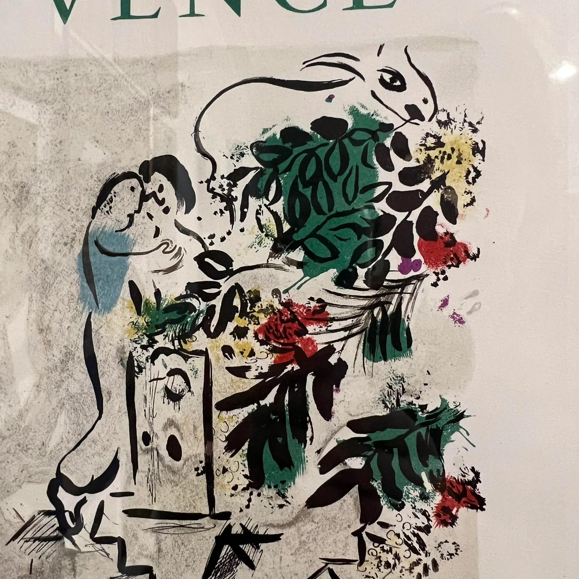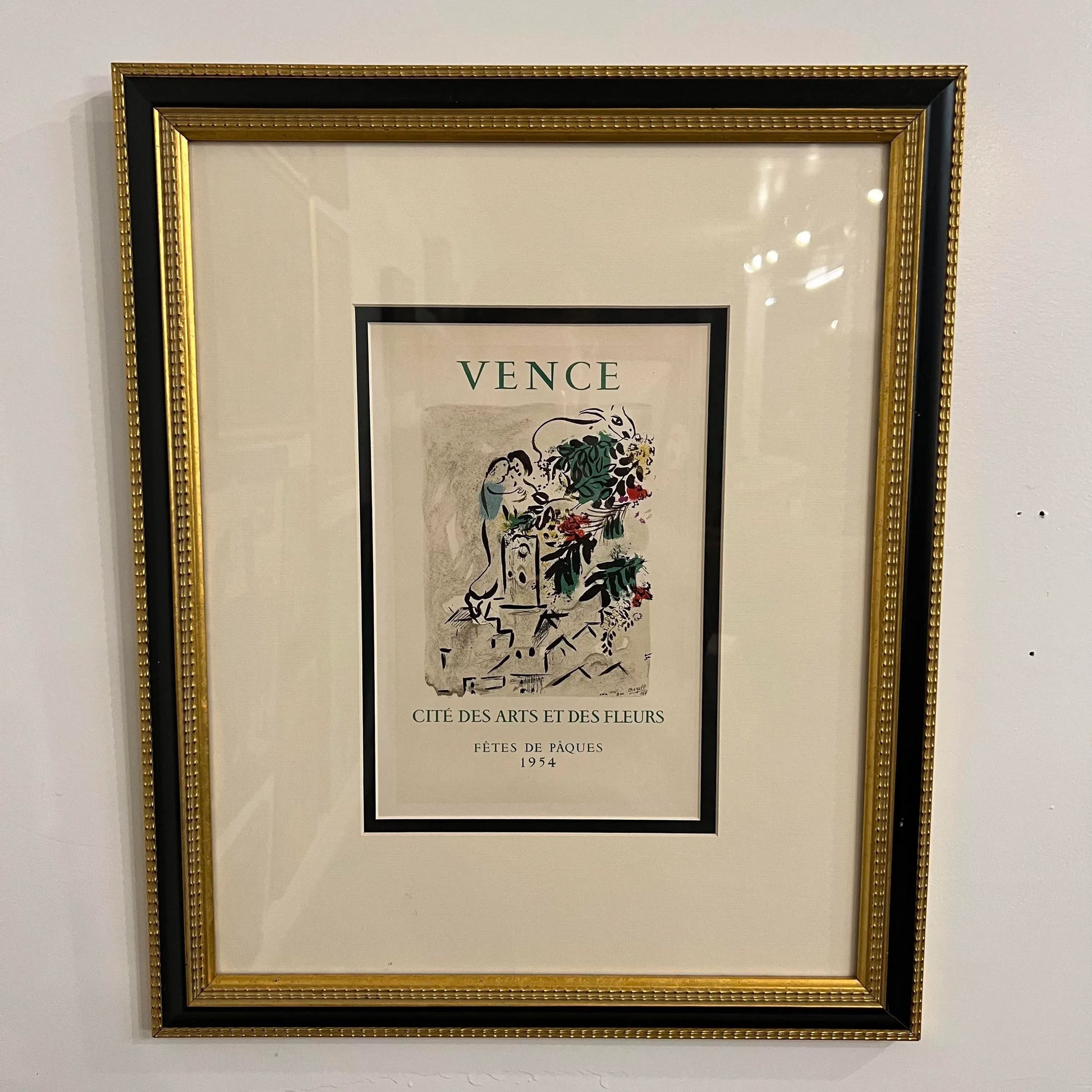 Print of Marc Chagall’s “Vence - Cite’ Des Arts Et Des Fleurs” made in 1954. The poster was made to celebrate Easter in Vence, a town in the south of France. Print is framed and matted behind glass.