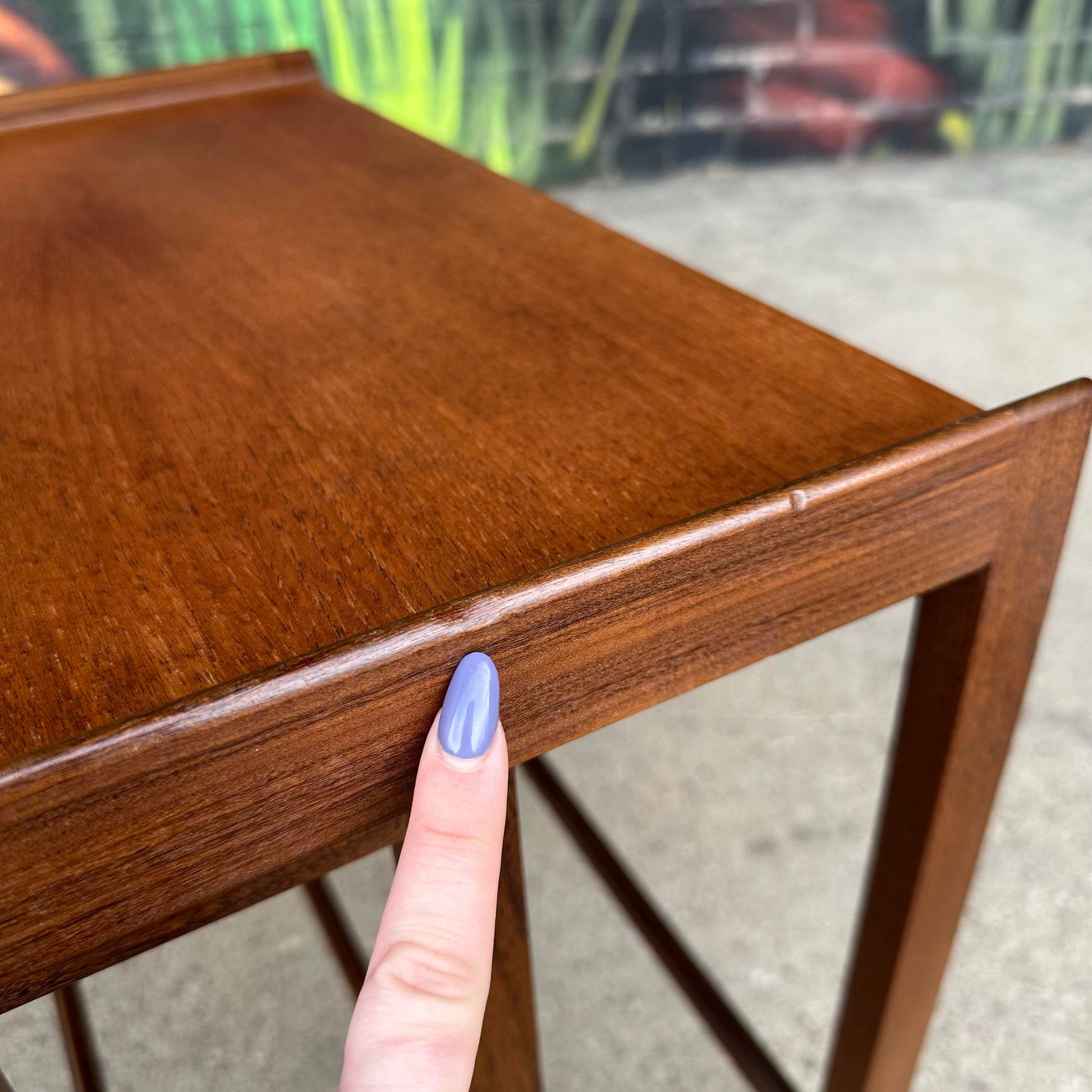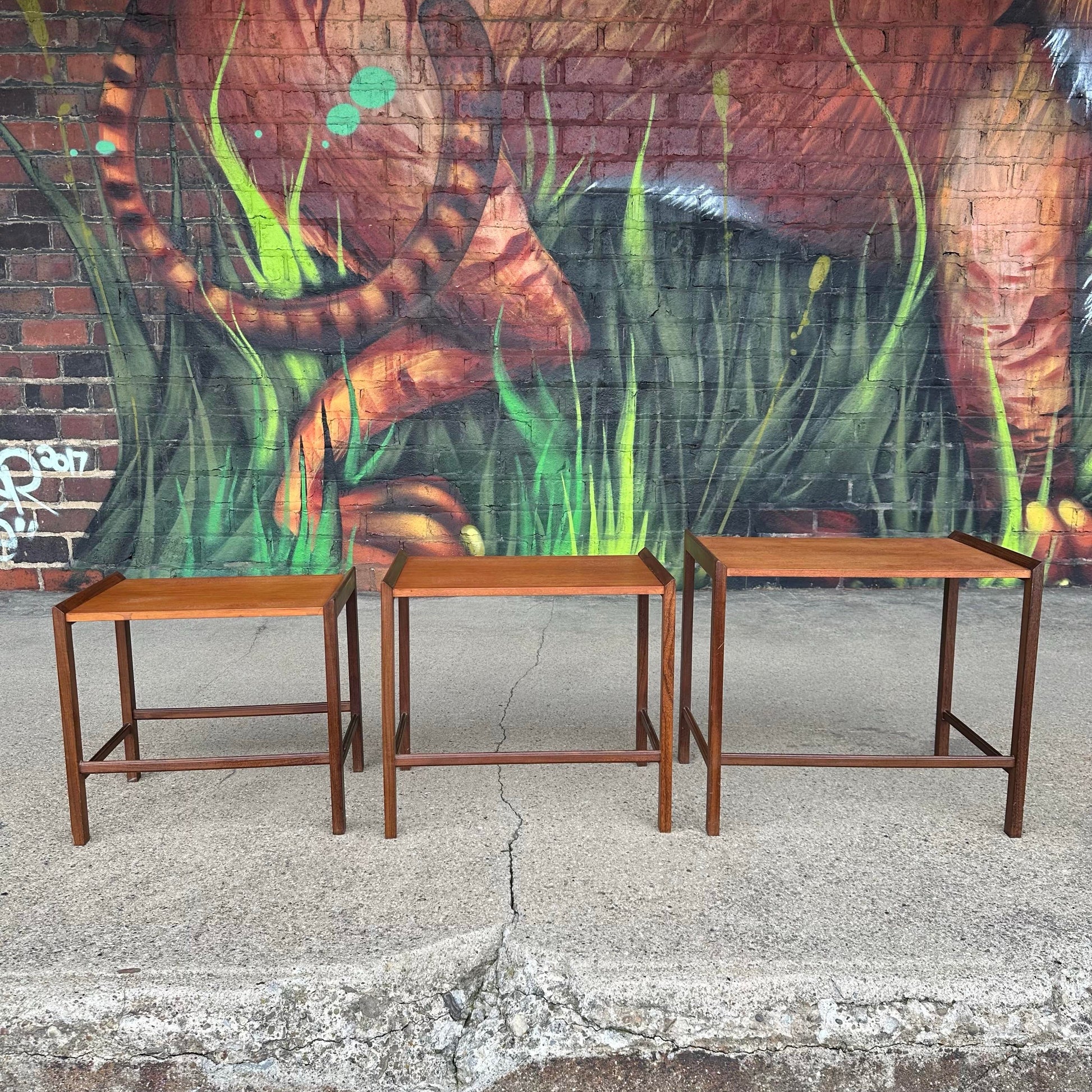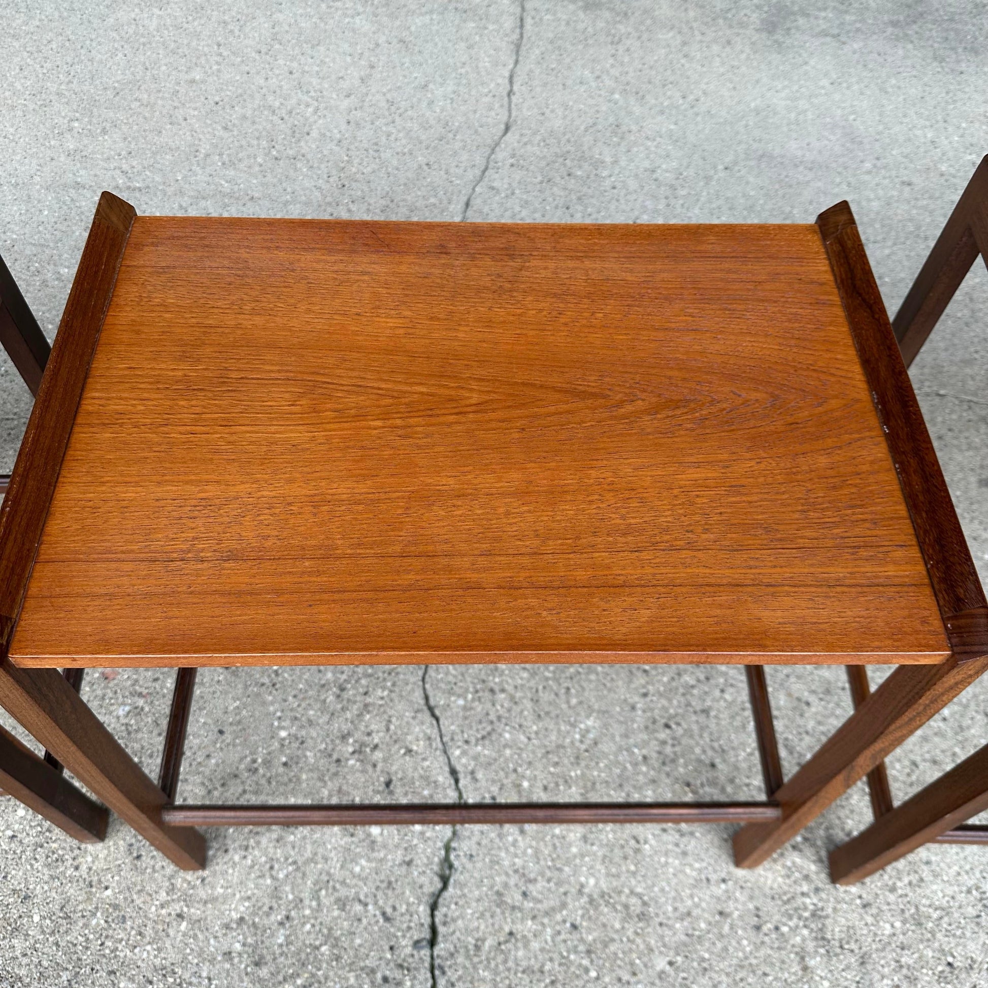 Set of Danish Modern nesting side tables featuring clean lines and a lip the runs the depth of the tables.  These tables are constructed of teak wood.